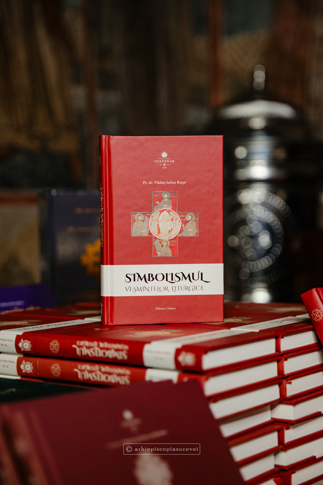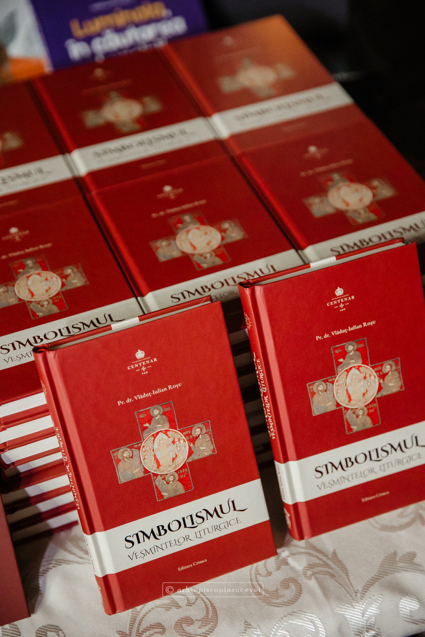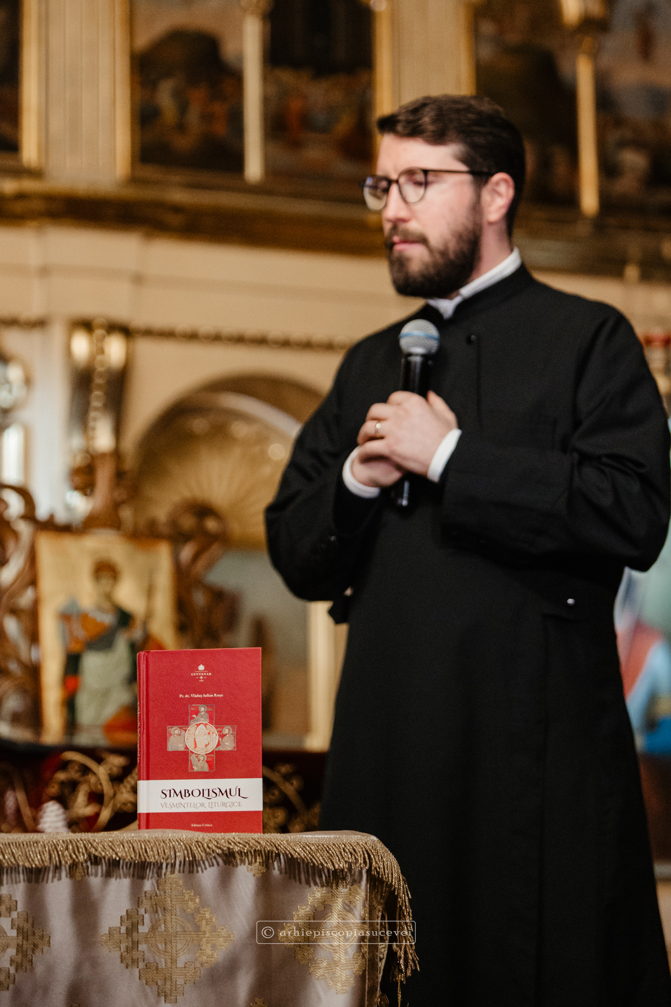 Despre felul în care, cu binecuvântarea Preamilostivului Dumnezeu, a fost făurit acest volum, a vorbit însuși autorul, pr. dr. docent Vlăduț-Iulian Roșu, slujitor în cadrul Arhiepiscopiei Romanului și Bacăului. Exprimându-și profunda emoție de a vorbi despre veșmintele liturgice, dar și recunoștința față de toți cei care au contribuit la publicarea cărții și la organizarea acestui eveniment, oaspetele a împărtășit o serie de detalii inedite pe care cititorul le va regăsi în această lucrare. Amintind că volumul „Simbolismul veșmintelor liturgice” reprezintă o sinteză a unei scrieri mai ample, intitulată „Istoria veșmintelor liturgice”, părintele Vlăduț-Iulian Roșu a punctat că lucrarea de față încearcă să ofere o imagine mai clară asupra originii și evoluției veșmintelor într-o societate care caută numeroase răspunsuri în acest domeniu. Între altele, sfinția sa a evidențiat diferențele vestimentare clare care existau între patriarhi, mitropoliți și episcopi în perioada bizantină timpurie, spre deosebire de practica modernă, oferind exemple concrete pentru publicul prezent.