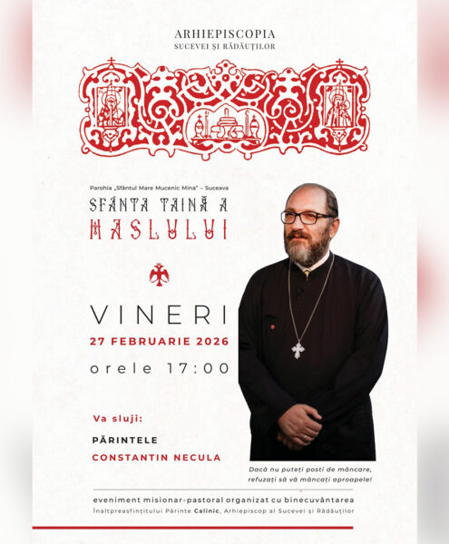 Cu binecuvântarea Înaltpreasfințitului Părinte Calinic, Arhiepiscop al Sucevei și Rădăuților, vineri, 27 februarie 2026, începând cu orele 17:00, părintele Constantin Necula va poposi în mijlocul comunității parohiale arondate Parohiei „Sfântul...