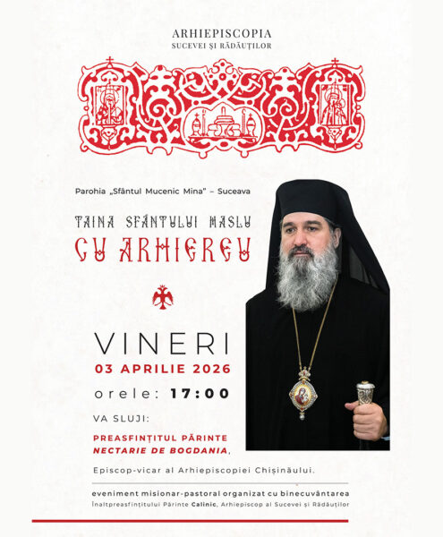 Cu binecuvântarea Înaltpreasfințitului Părinte Calinic, Arhiepiscop al Sucevei și Rădăuților, vineri, 3 aprilie 2026, începând cu orele 17:00, Preasfințitul Părinte Nectarie de Bogdania, Episcop-vicar al Arhiepiscopiei Chișinăului, va poposi în...