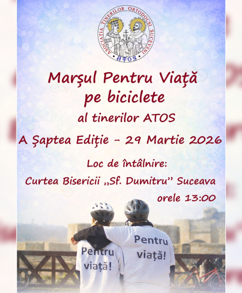 Asociația Tinerilor Ortodocși Suceveni (ATOS) va organiza a Șaptea Ediție a Marșului Pentru Viață pe Biciclete, Duminică, 29 Martie 2026, la orele 13:00. Sunt invitați tinerii peste 13 ani și...