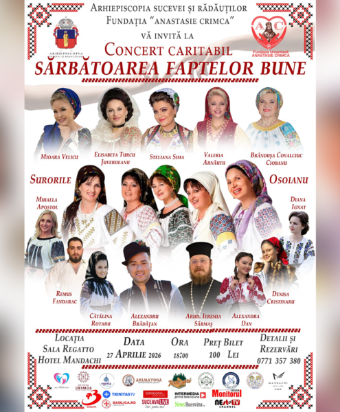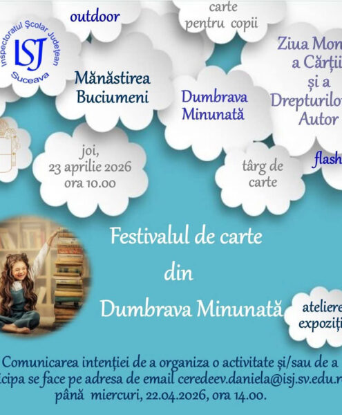 Cu binecuvântarea Înaltpreasfințitului Părinte Arhiepiscop Calinic, Inspectoratul Școlar Județean Suceava, Arhiepiscopia Sucevei și Rădăuților, prin Sectorul Media și Comunicare, și Mănăstirea Buciumeni, organizează joi, 23 aprilie 2026, începând cu ora...