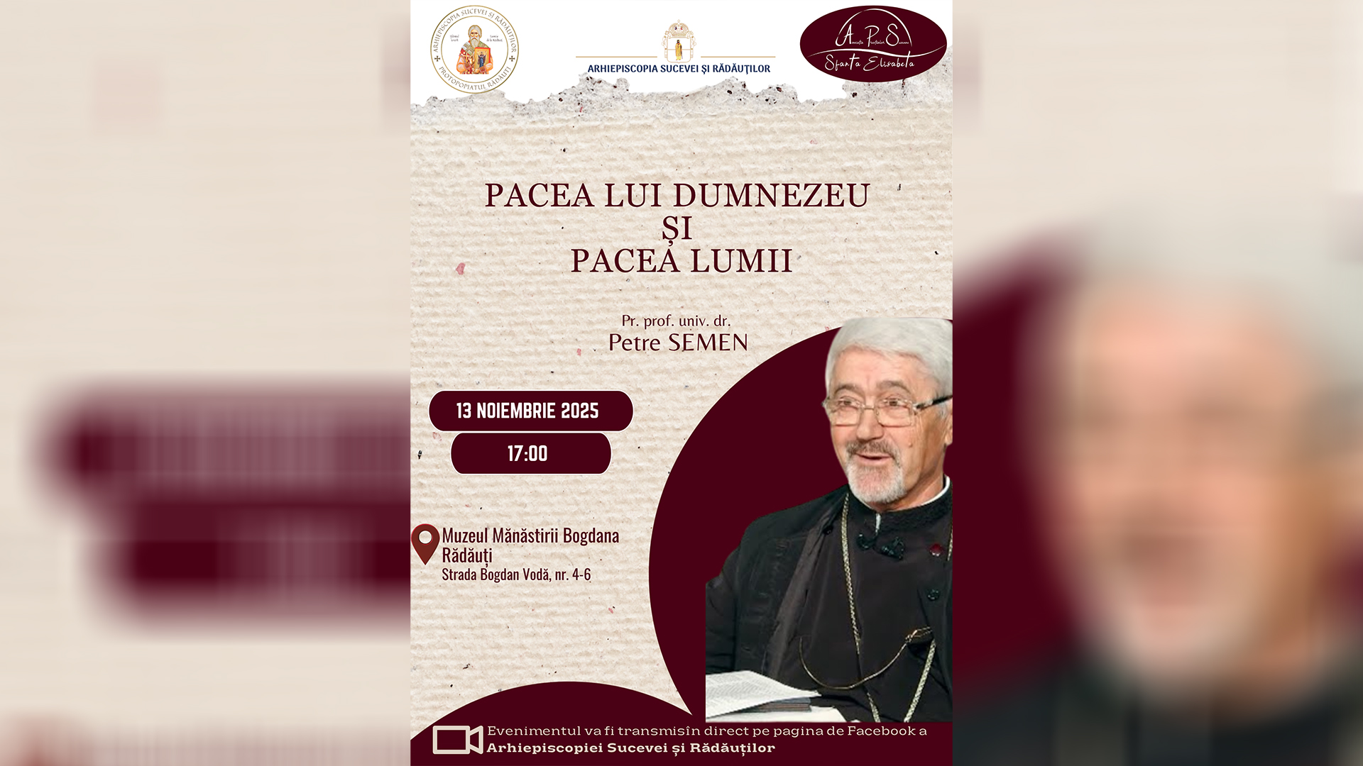 Conferința va fi susținută de părintele prof. univ. dr. Petre Semen și va avea loc joi, 13 noiembrie 2025, ora 17:00 la Muzeul Mănăstirii Bogdana din Rădăuți.