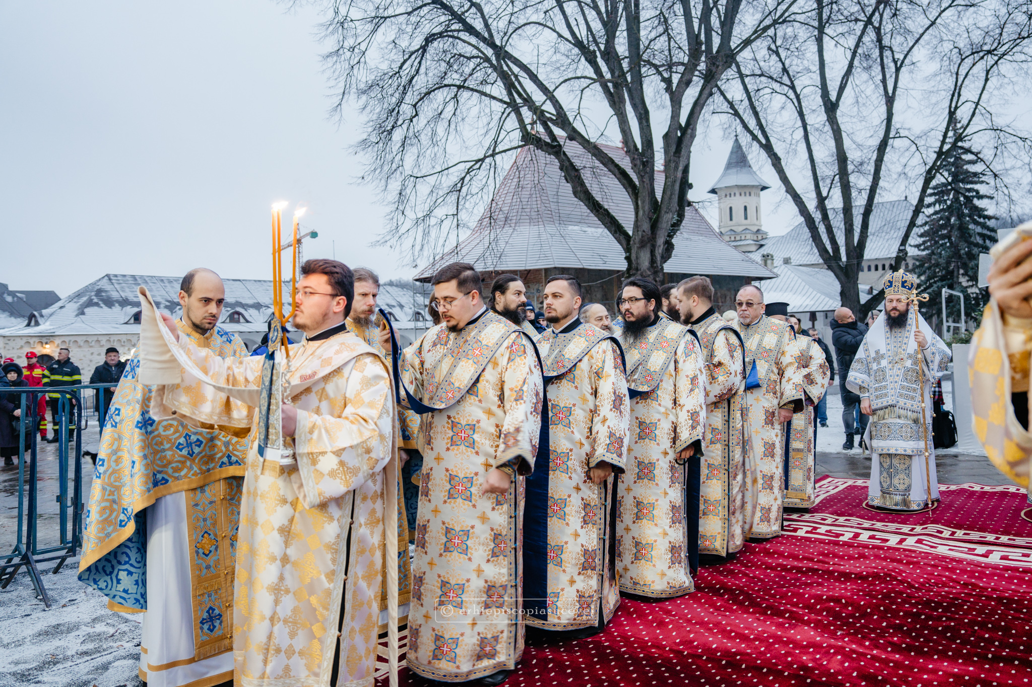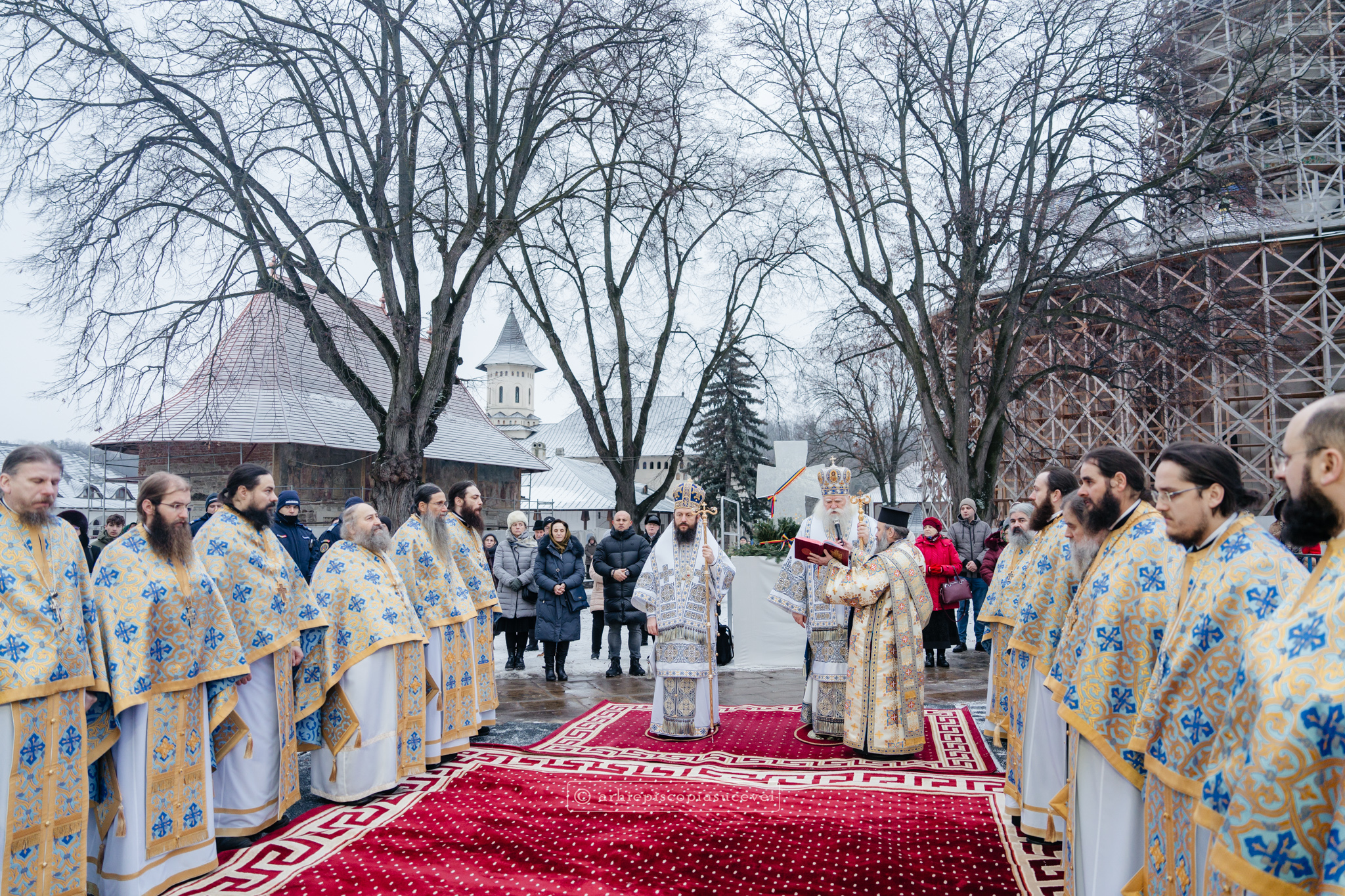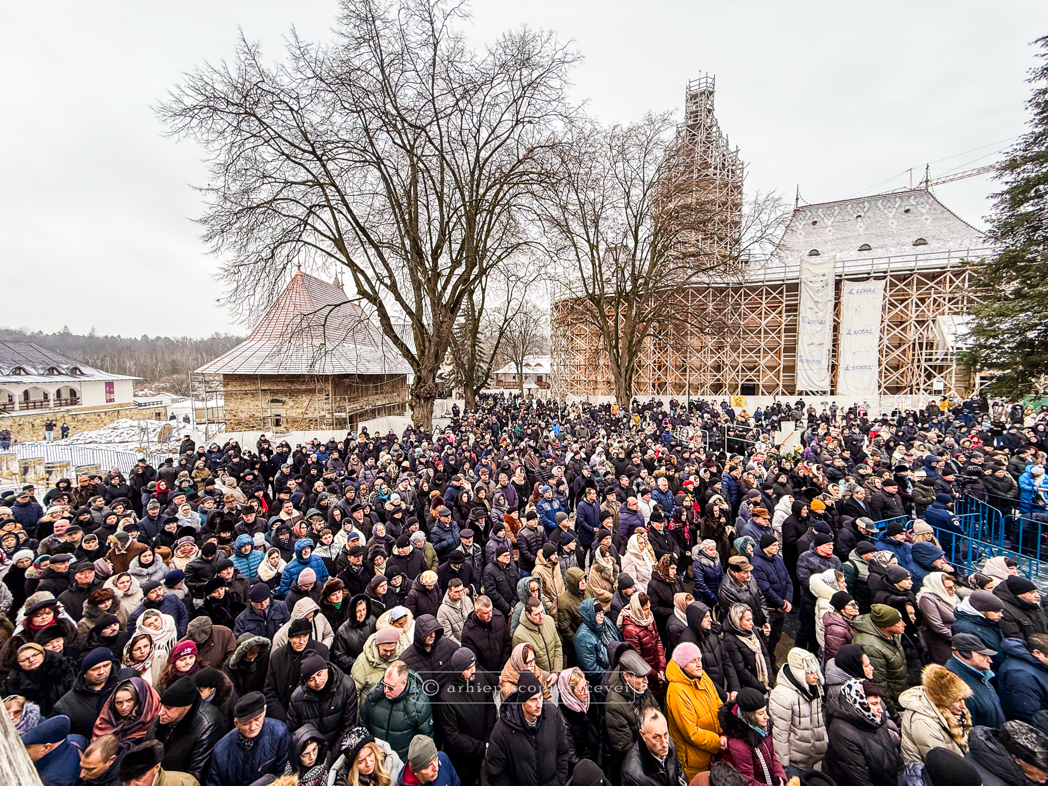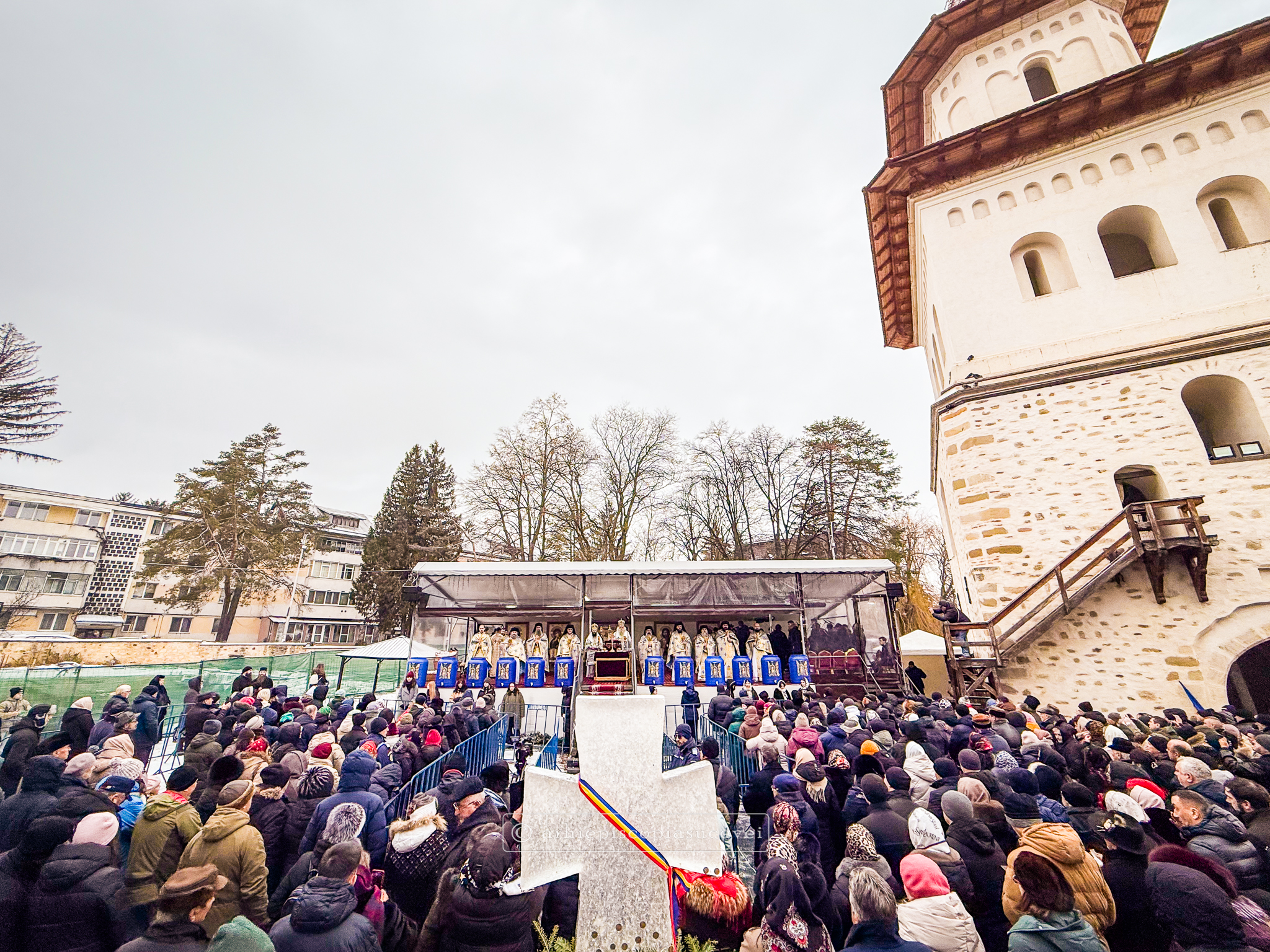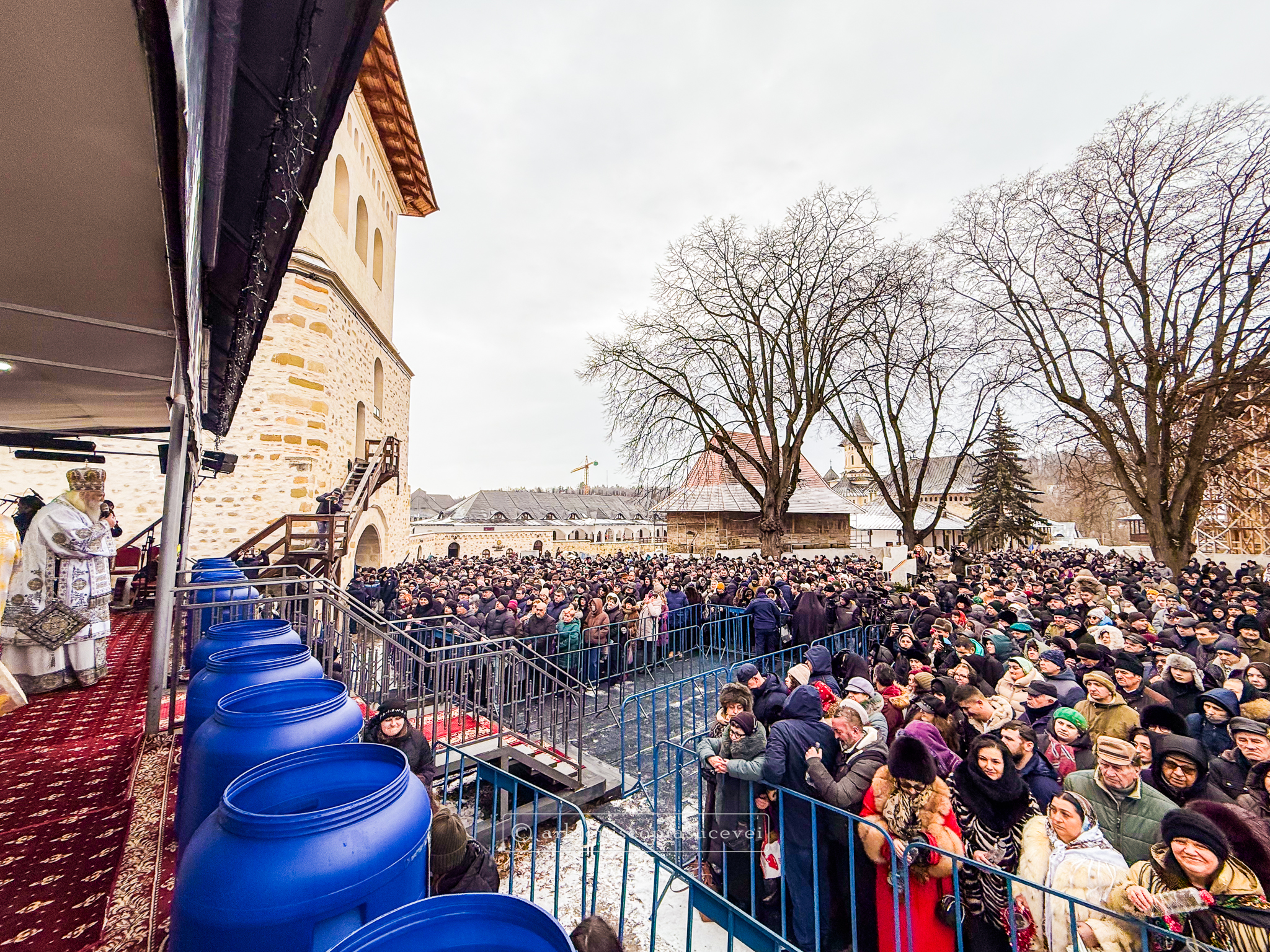 Și în acest an, praznicul împărătesc al Bobotezei – Epifania Domnului, momentul care rememorează evenimentul petrecut în urmă cu aproximativ 2000 de ani, când în apa Iordanului S-a revelat Preasfânta Treime, a fost prilej de înaltă trăire duhovnicească, fiind sărbătorit cu aleasă bucurie și rugăciune la Catedrala Arhiepiscopală din Suceava – Mănăstirea „Sfântul Ioan cel Nou”, unde mii de credincioși au primit binecuvântarea celor doi ierarhi ai Eparhiei Sucevei și Rădăuților, Înaltpreasfințitul Părinte Arhiepiscop Calinic și Preasfințitul Damaschin Dorneanul, Episcop-Vicar. După ce s-au închinat la racla cu cinstitele moaște ale marelui mucenic ce ocrotește țara noastră de peste șase veacuri, odor neprețuit aflat în Paraclisul așezământului monahal, aceștia au săvârșit Sfânta și Dumnezeiasca Liturghie a Sfântului Ioan Gură de Aur la altarul exterior al locașului de cult, împreună cu un numeros sobor de preoți și diaconi.