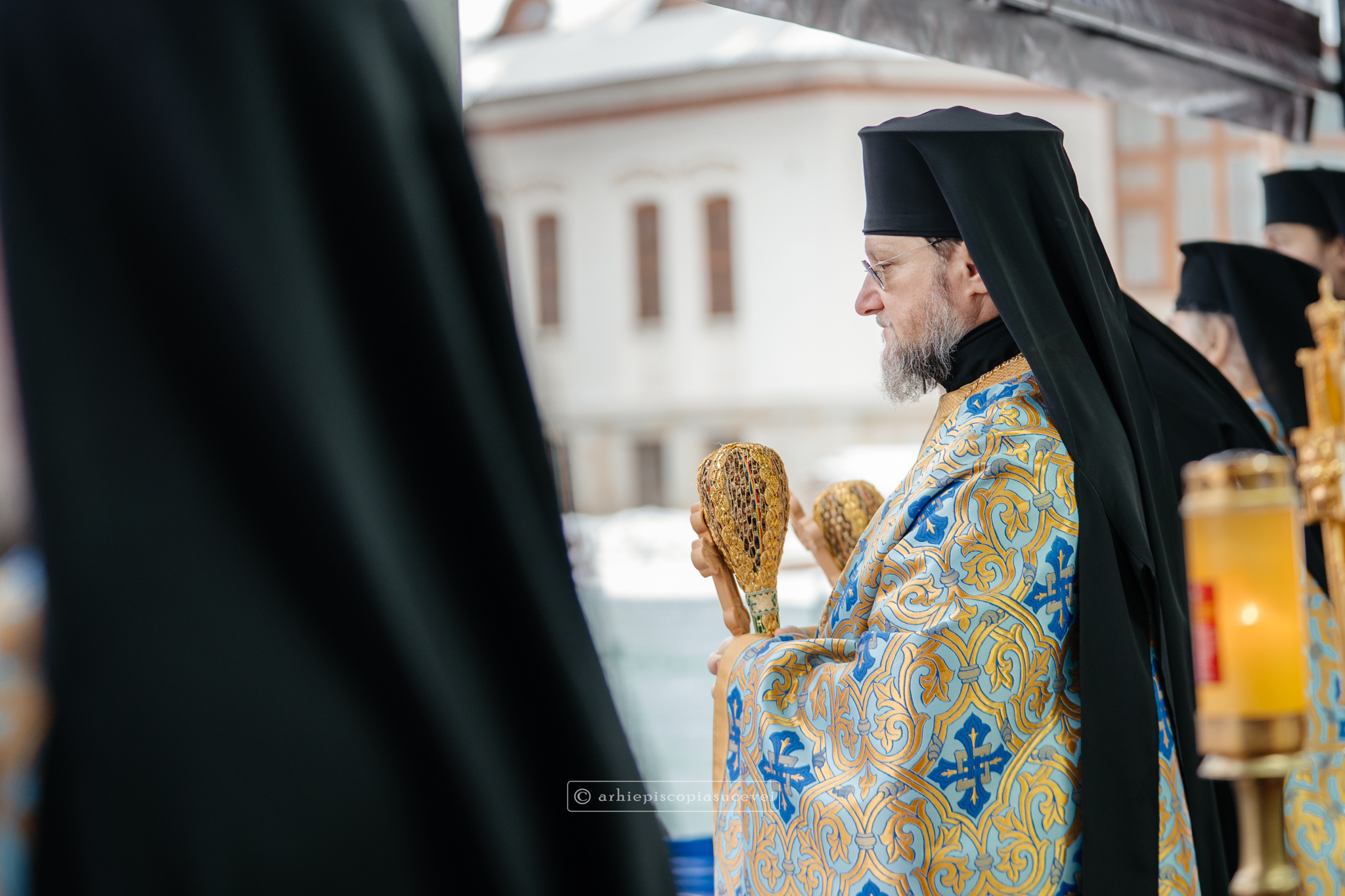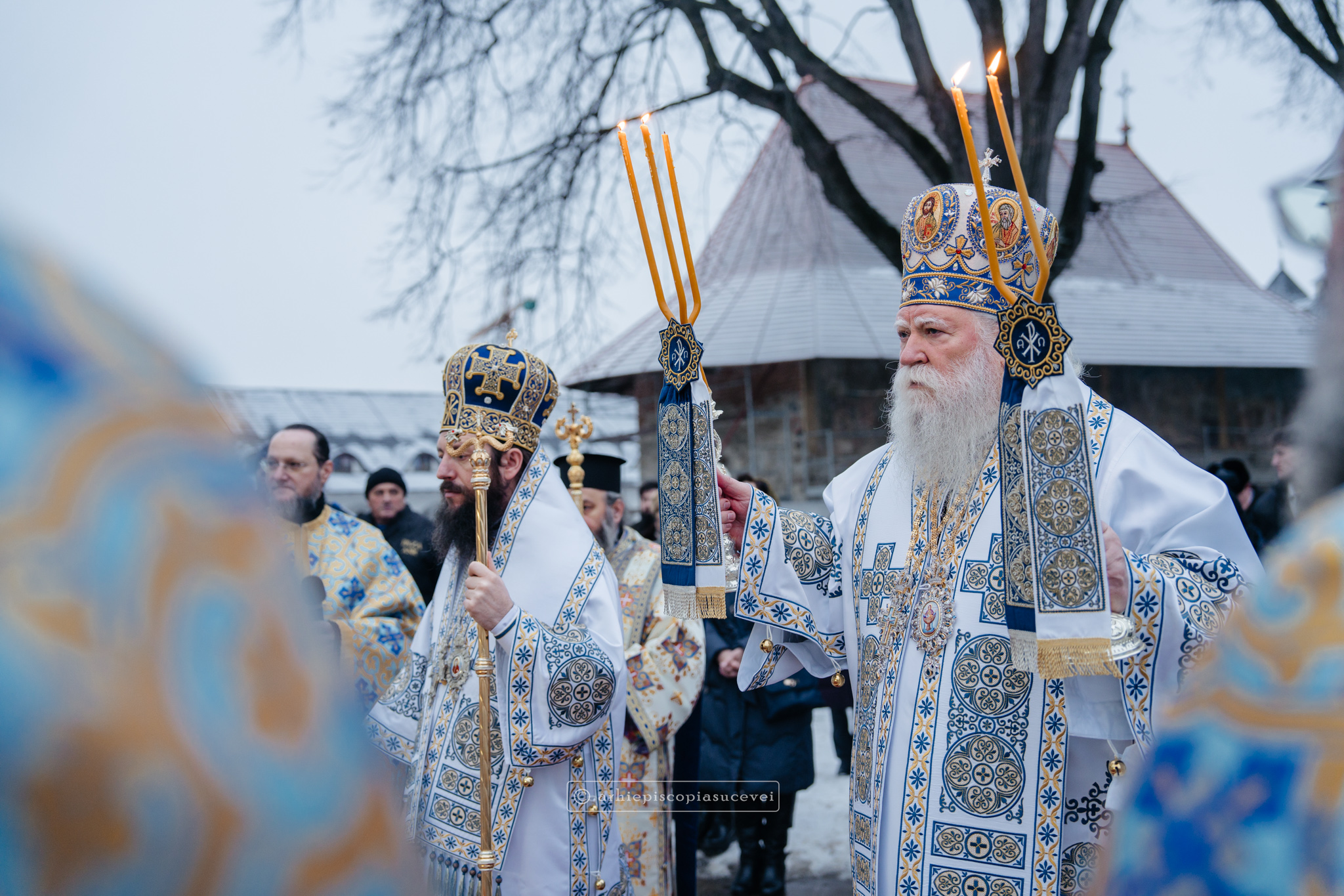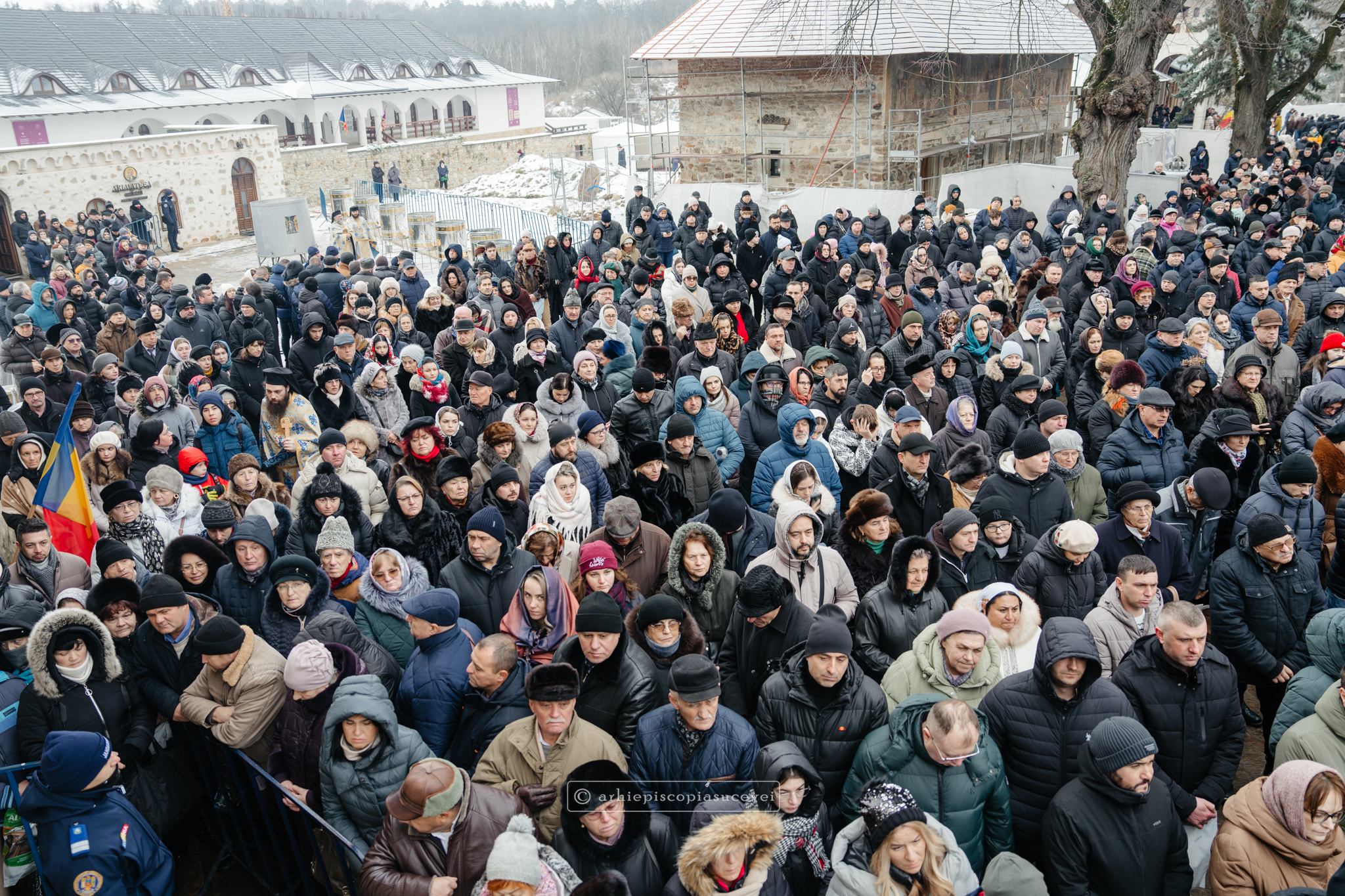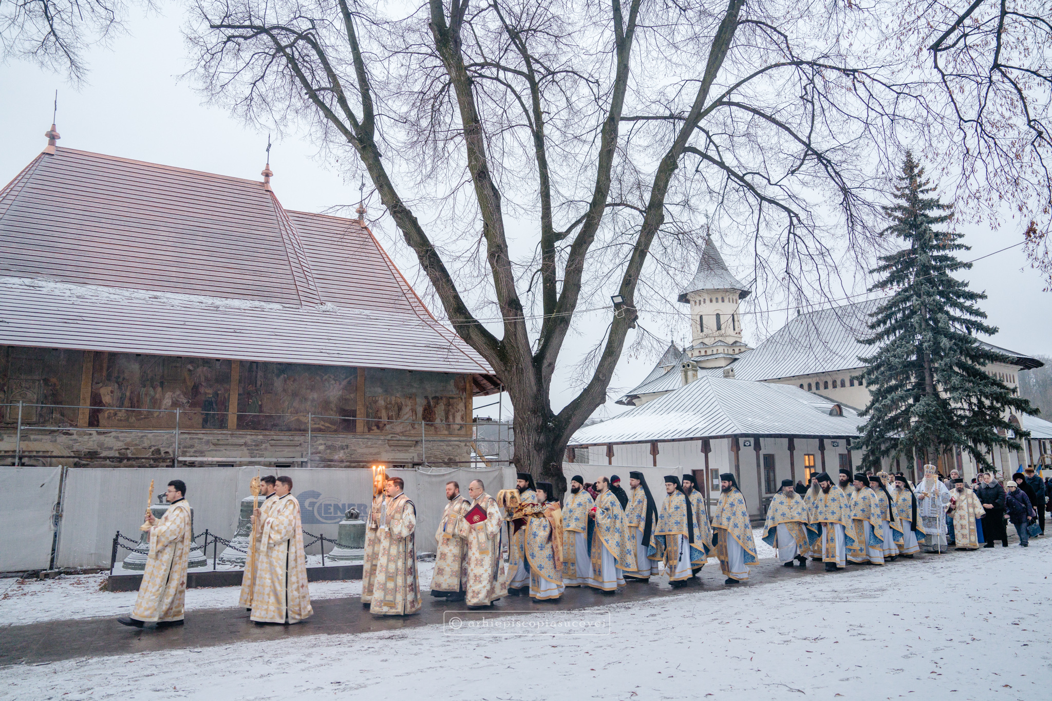 Și în acest an, praznicul împărătesc al Bobotezei – Epifania Domnului, momentul care rememorează evenimentul petrecut în urmă cu aproximativ 2000 de ani, când în apa Iordanului S-a revelat Preasfânta Treime, a fost prilej de înaltă trăire duhovnicească, fiind sărbătorit cu aleasă bucurie și rugăciune la Catedrala Arhiepiscopală din Suceava – Mănăstirea „Sfântul Ioan cel Nou”, unde mii de credincioși au primit binecuvântarea celor doi ierarhi ai Eparhiei Sucevei și Rădăuților, Înaltpreasfințitul Părinte Arhiepiscop Calinic și Preasfințitul Damaschin Dorneanul, Episcop-Vicar. După ce s-au închinat la racla cu cinstitele moaște ale marelui mucenic ce ocrotește țara noastră de peste șase veacuri, odor neprețuit aflat în Paraclisul așezământului monahal, aceștia au săvârșit Sfânta și Dumnezeiasca Liturghie a Sfântului Ioan Gură de Aur la altarul exterior al locașului de cult, împreună cu un numeros sobor de preoți și diaconi.