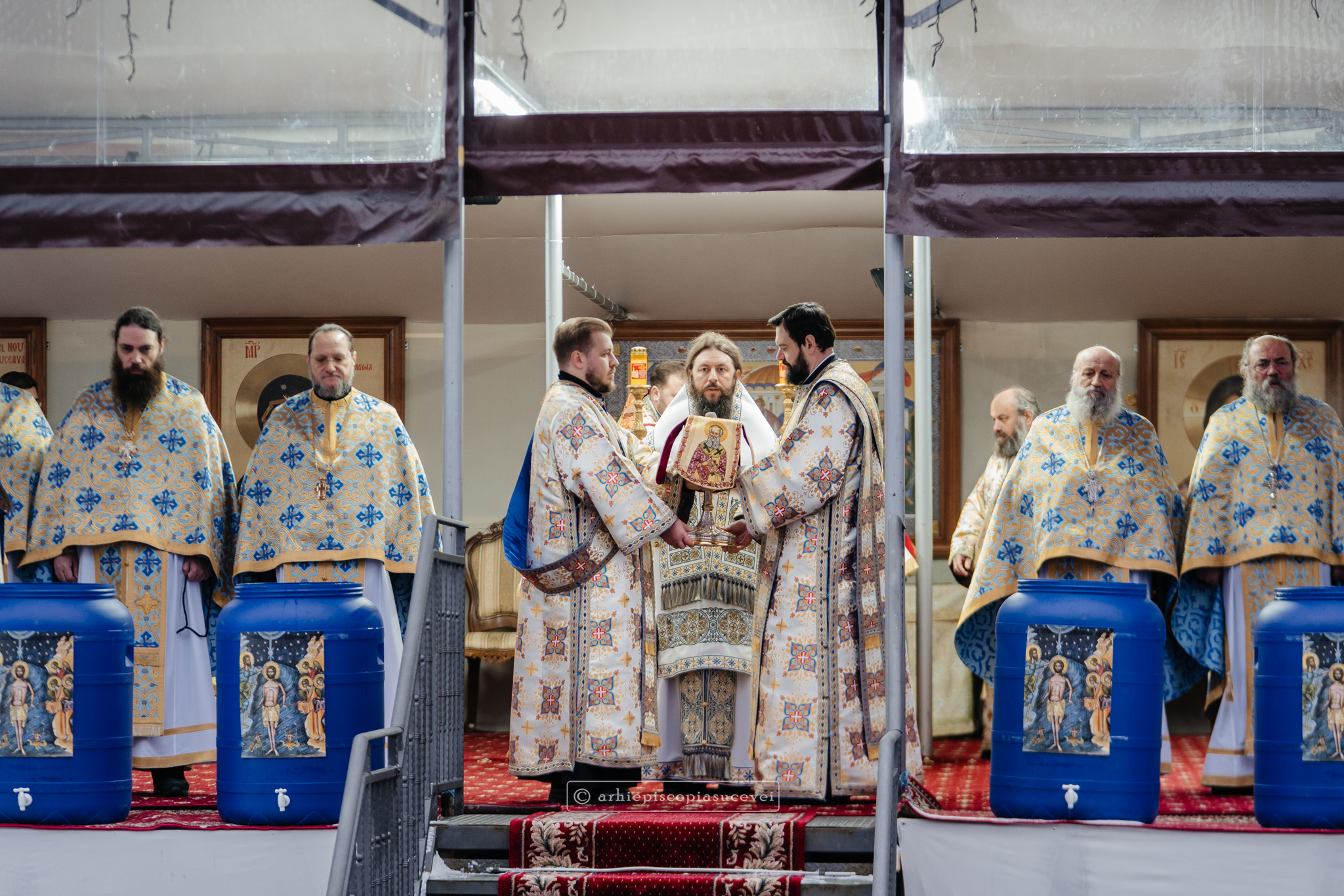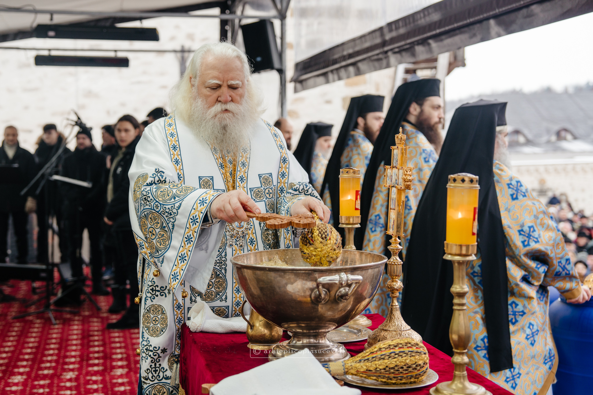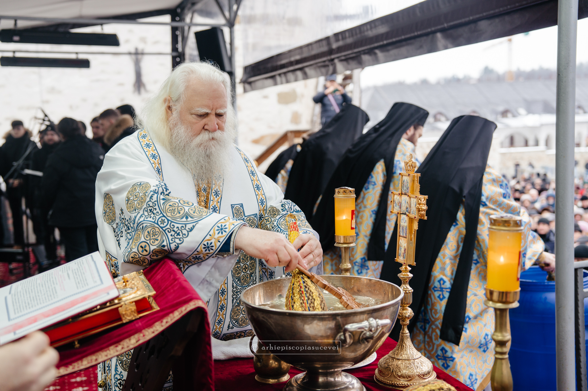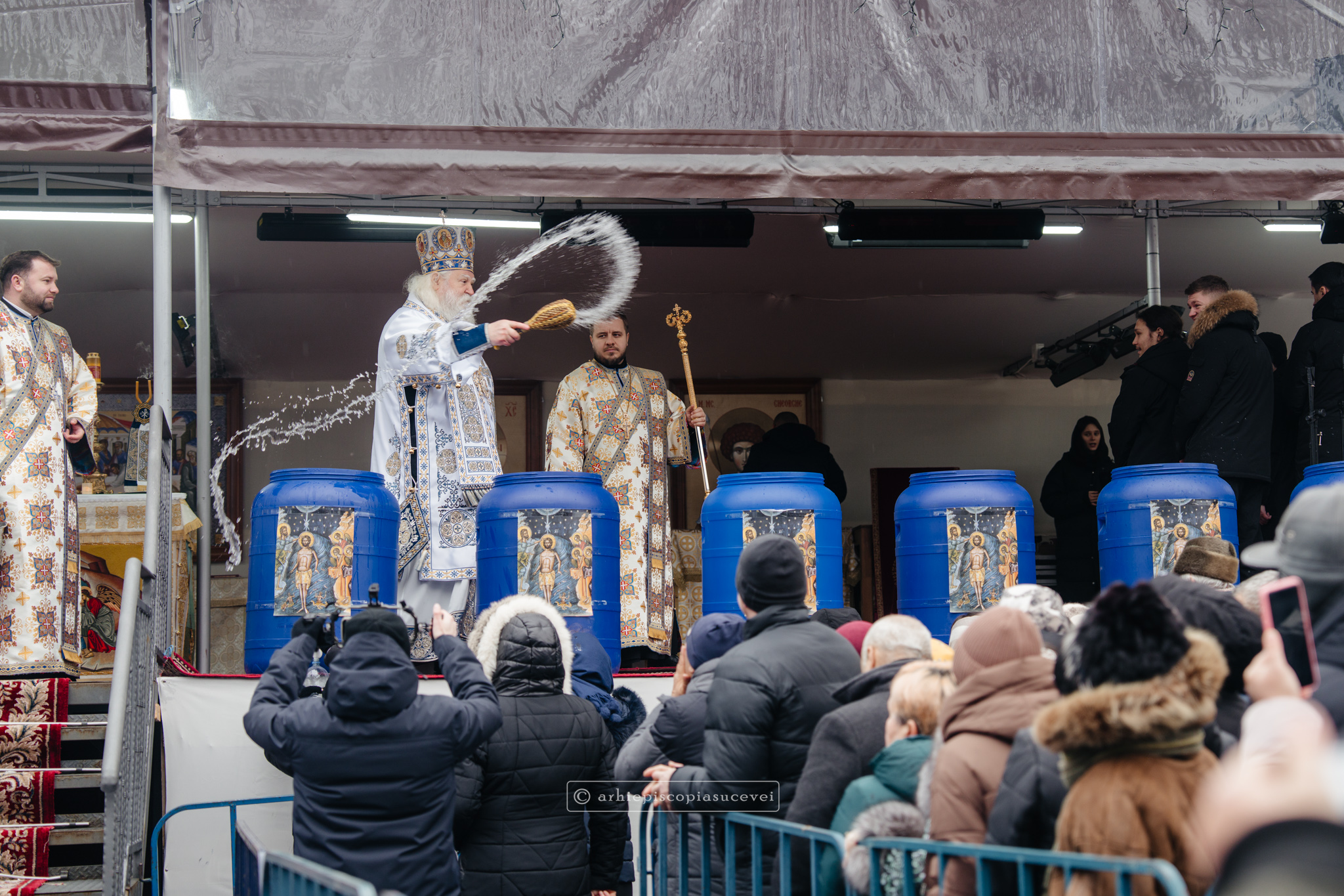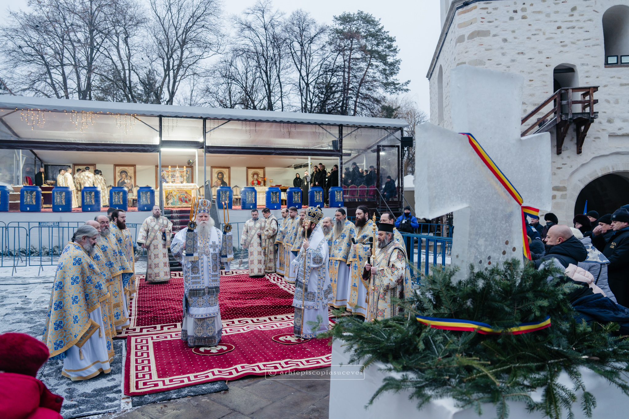 La final, cei doi ierarhi au oficiat Slujba sfințirii celei mari a apei, cei prezenți la Praznicul Botezului Domnului fiind binecuvântați apoi cu Agheasmă Mare. Rânduiala cuprinde și o rugăciune înălțătoare, menită să exprime taina reînnoirii și a restaurării creației, precum și împăcarea dintre cele cerești și cele pământești. „Astăzi, cele de sus cu cele de jos împreună prăznuiesc, și cele de jos împreună cu cele de sus vorbesc. Astăzi, păcatele oamenilor se curățesc în apele Iordanului. Astăzi, raiul s-a deschis oamenilor. Astăzi, toată făptura se adapă cu curgeri tainice. Astăzi, Stăpânul merge la Botez, ca să ridice firea omenească la înălțime. Astăzi, împărăția cerurilor am dobândit. Astăzi, pământul și marea s-au împărtășit de bucuria lumii și lumea de veselie s-a umplut. Astăzi, întunericul lumii se risipește cu arătarea Dumnezeului nostru.”