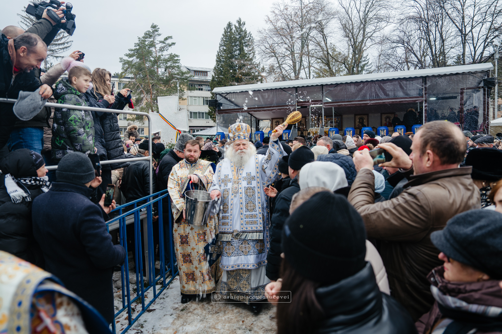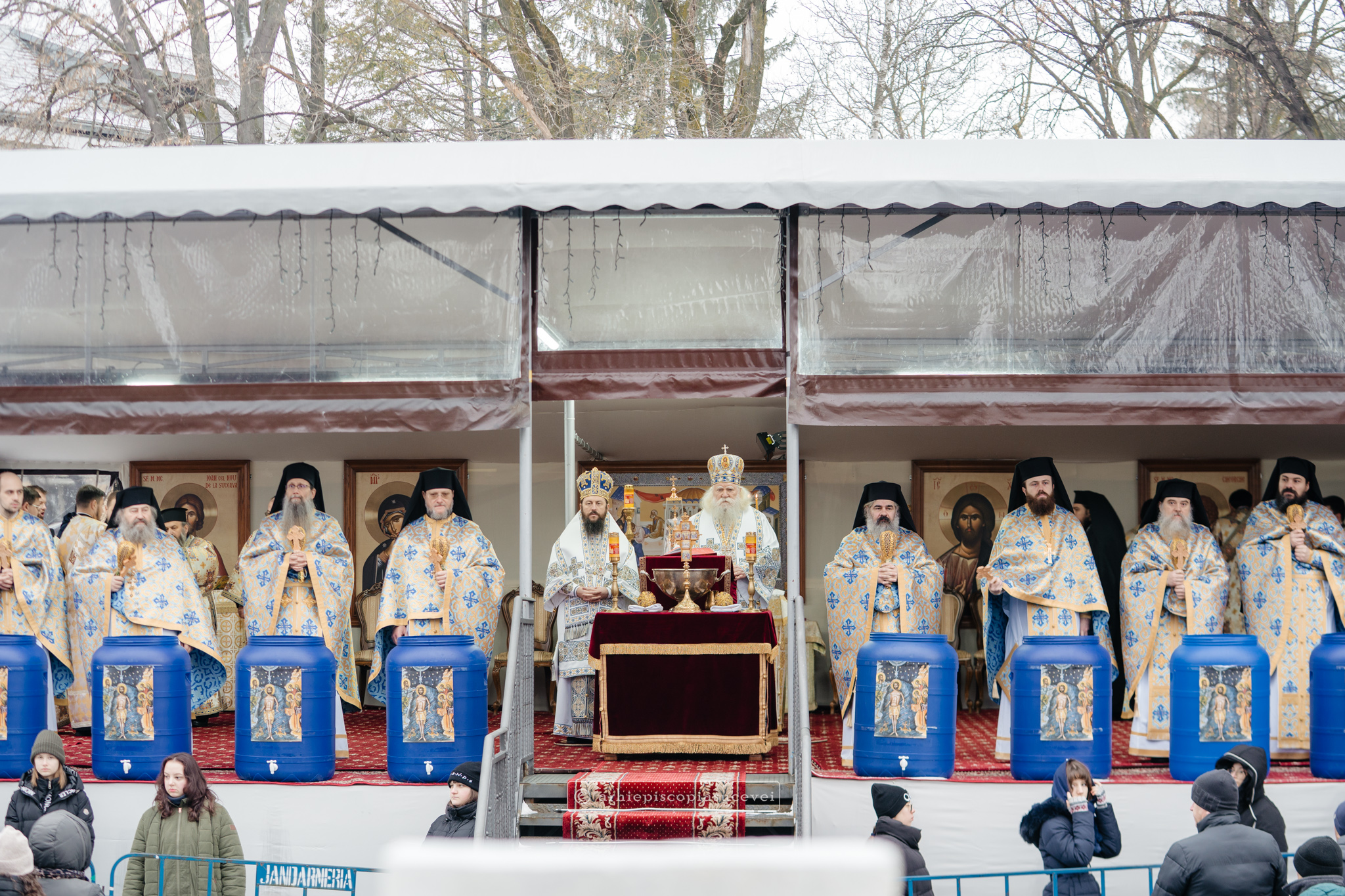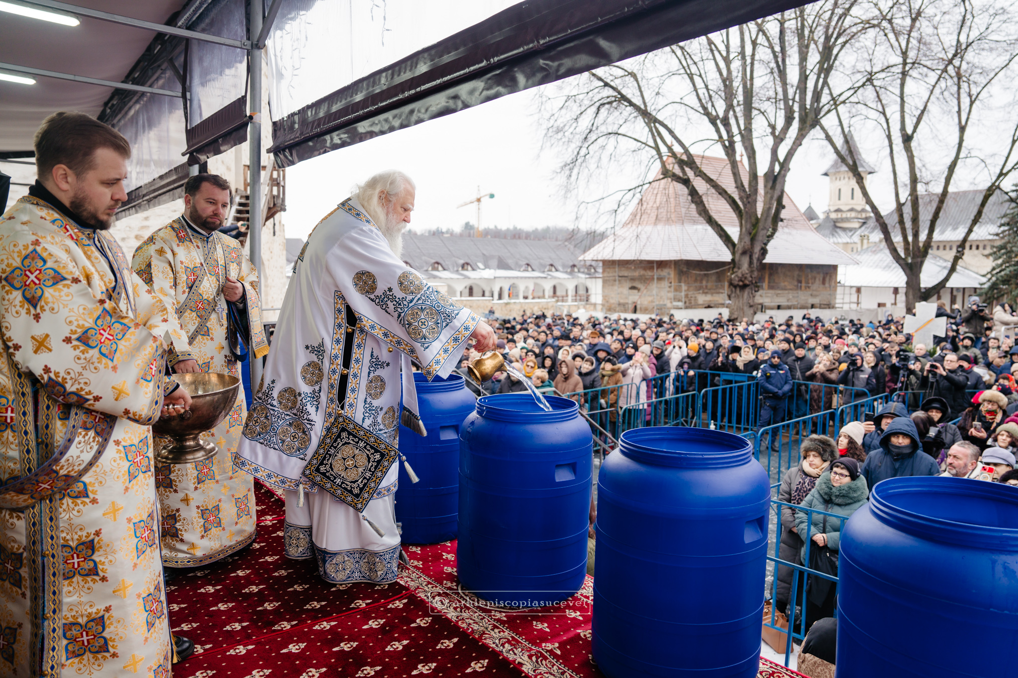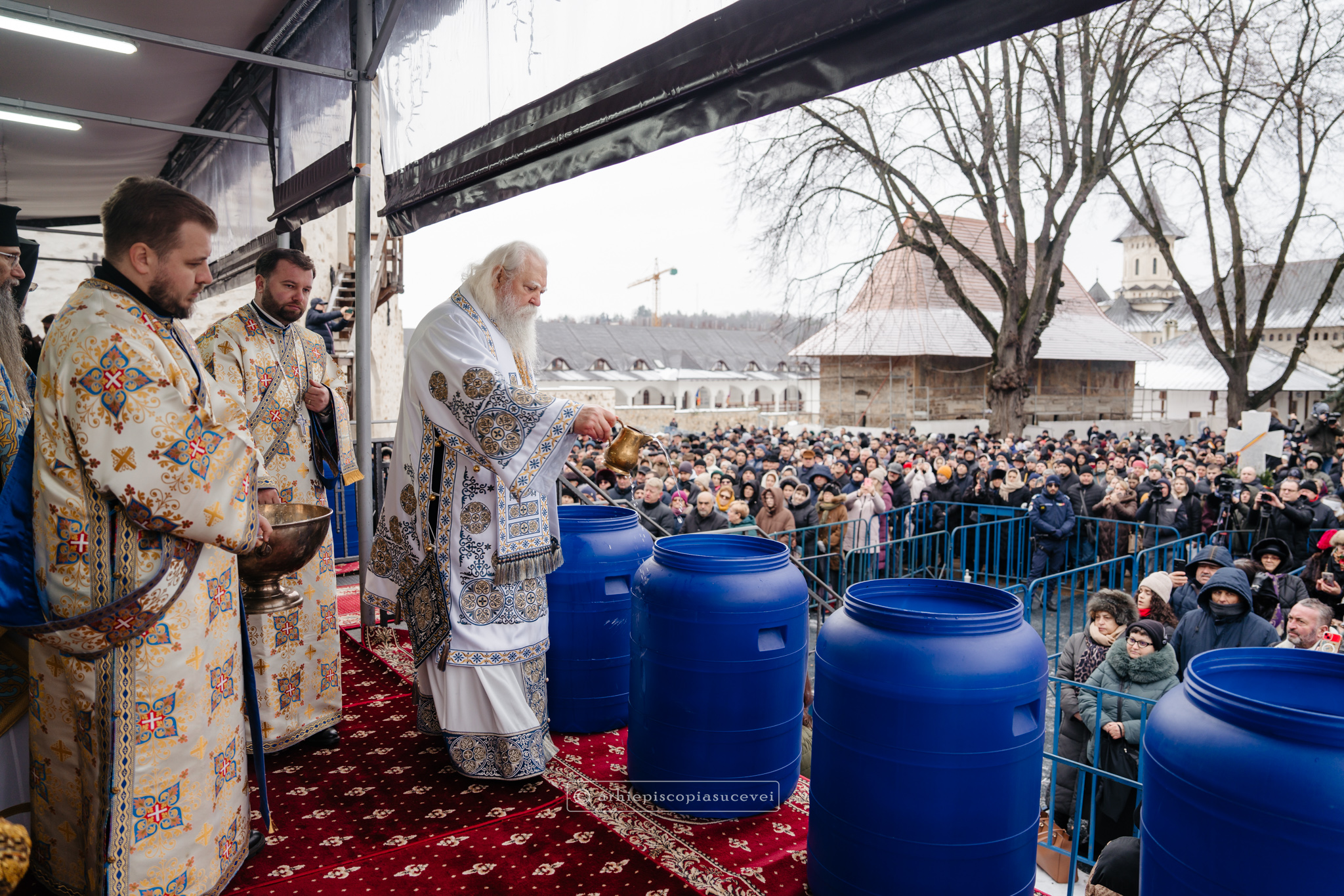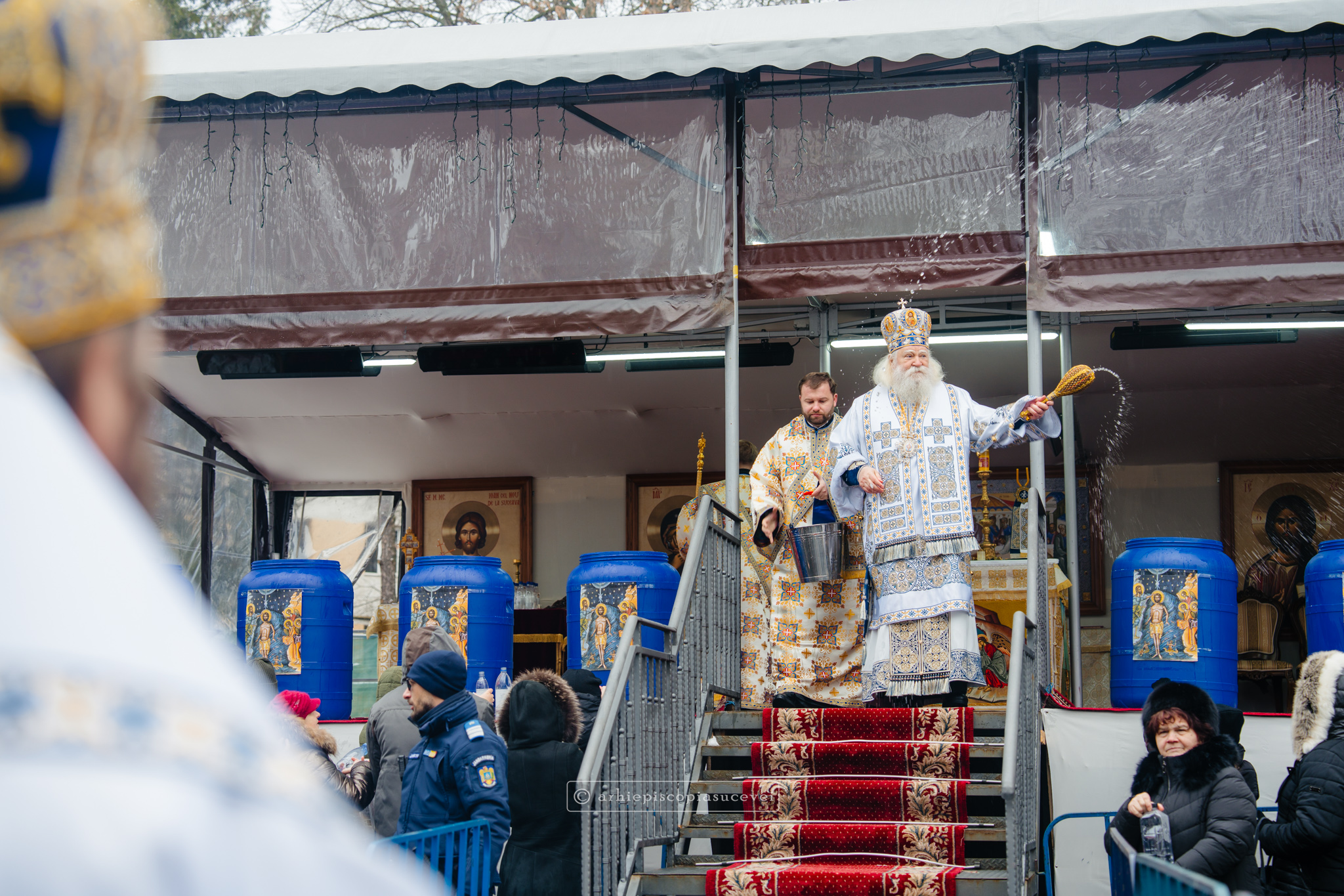 La final, cei doi ierarhi au oficiat Slujba sfințirii celei mari a apei, cei prezenți la Praznicul Botezului Domnului fiind binecuvântați apoi cu Agheasmă Mare. Rânduiala cuprinde și o rugăciune înălțătoare, menită să exprime taina reînnoirii și a restaurării creației, precum și împăcarea dintre cele cerești și cele pământești. „Astăzi, cele de sus cu cele de jos împreună prăznuiesc, și cele de jos împreună cu cele de sus vorbesc. Astăzi, păcatele oamenilor se curățesc în apele Iordanului. Astăzi, raiul s-a deschis oamenilor. Astăzi, toată făptura se adapă cu curgeri tainice. Astăzi, Stăpânul merge la Botez, ca să ridice firea omenească la înălțime. Astăzi, împărăția cerurilor am dobândit. Astăzi, pământul și marea s-au împărtășit de bucuria lumii și lumea de veselie s-a umplut. Astăzi, întunericul lumii se risipește cu arătarea Dumnezeului nostru.”