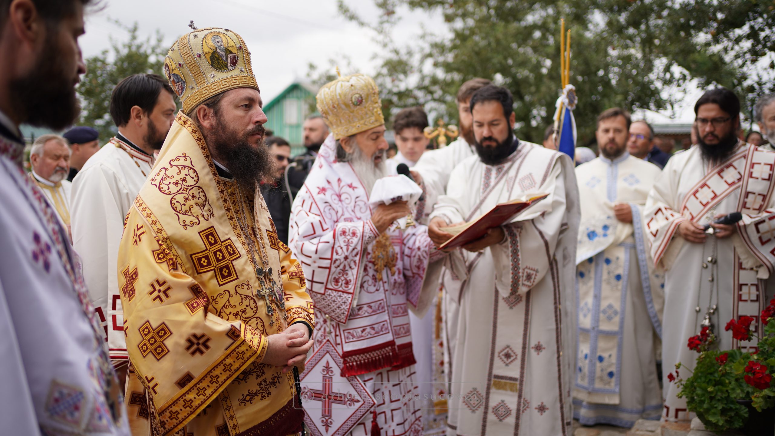 În continuare, pe un podium special amenajat în curtea locașului de cult, cei doi ierarhi au săvârșit Sfânta și Dumnezeiasca Liturghie, înconjurați de un sobor de preoți și diaconi, din care au făcut parte și clerici de la Centrul Eparhial Suceava.