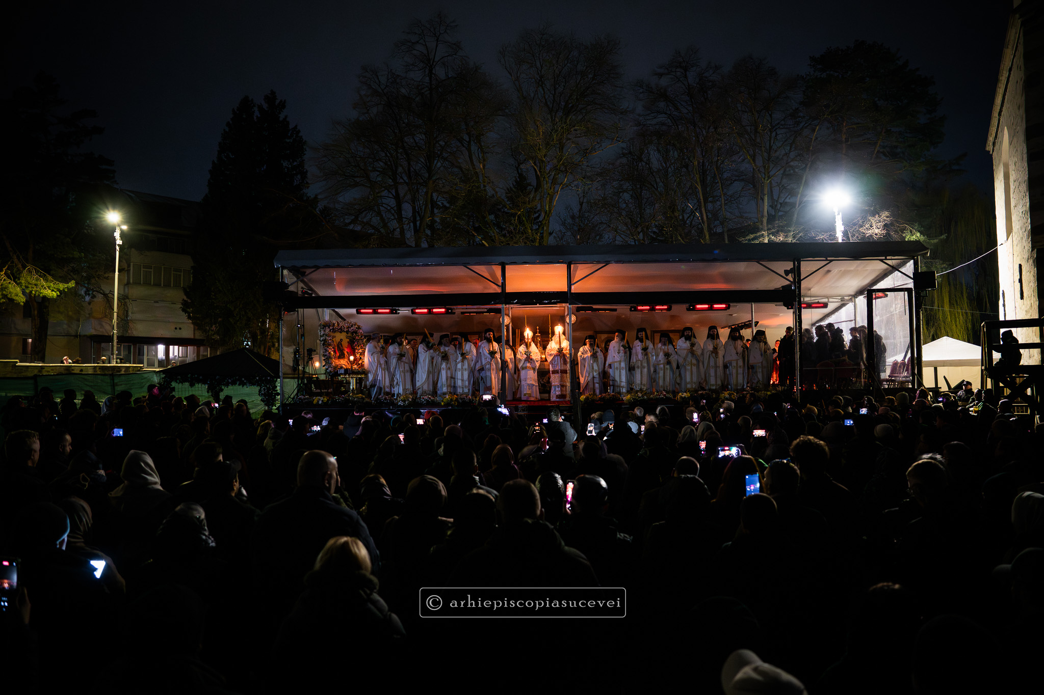 După oficierea Slujbei Învierii Mântuitorului Iisus Hristos, Înaltpreasfințitul Părinte Calinic și Preasfințitul Părinte Damaschin Dorneanul, alături de soborul slujitor, au săvârșit Sfânta Liturghie pascală la altarul special amenajat în curtea Mănăstirii „Sfântul Ioan cel Nou”. Răspunsurile liturgice au fost date de Corala mixtă „Sfântul Ioan cel Nou”, dirijată de părintele Ionuț Lucian Tablan Popescu, și de Grupul Psaltic al Catedralei Arhiepiscopale dirijat de arhid. Ilie Leonte, „Dimitrie Suceveanu”.