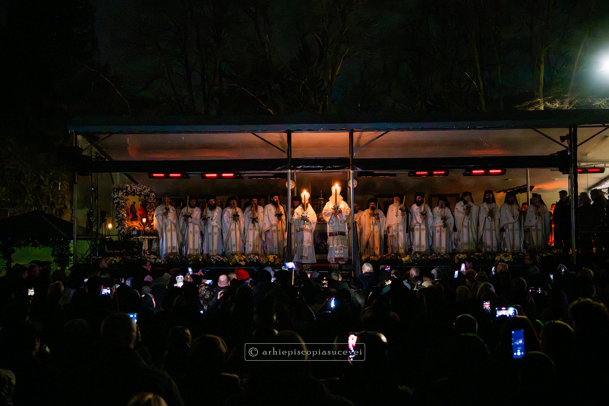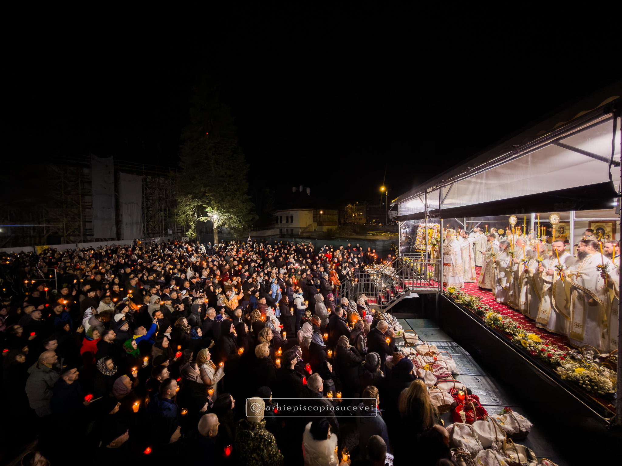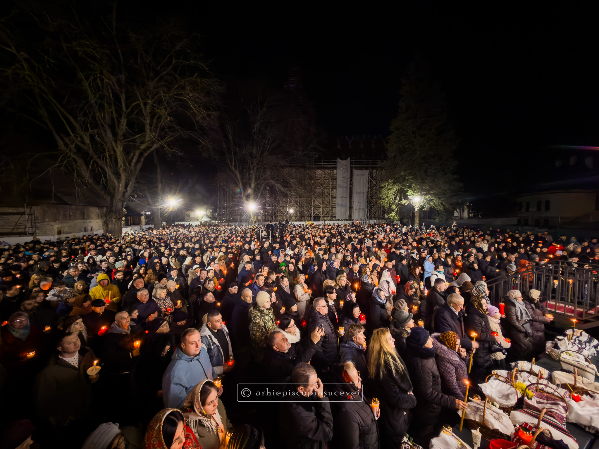 Cu nemăsurată emoție și bucurie a fost sărbătorită în Arhiepiscopia Sucevei și Rădăuților Învierea Domnului, cel mai important și cel mai așteptat praznic al creștinătății. În Duminica Sfintelor Paști, 12 aprilie 2026, la miezul nopții, Înaltpreasfințitul Părinte Calinic, Arhiepiscop al Sucevei și Rădăuților, și Preasfințitul Părinte Damaschin Dorneanul, Episcop-Vicar, au săvârșit Slujba Învierii, înconjurați de un sobor de preoți și diaconi, la Catedrala Arhiepiscopală din Suceava, mănăstire ce adăpostește cinstitele moaște ale Sfântului Ioan cel Nou. Cei doi ierarhi ai eparhiei au oferit Lumina Sfântă credincioșilor prezenți, adresându-le apoi acestora salutul bucuriei: „Hristos a înviat!”.