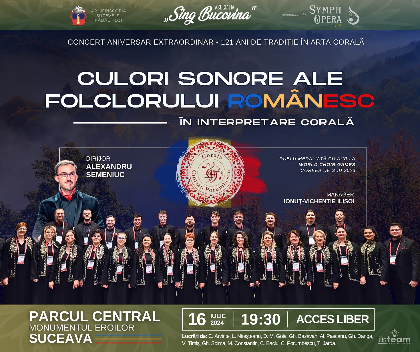 Coriștii de aur ai Bucovinei, Corala Ciprian Porumbescu vă invită să luați parte la concertul intitulat Culori Sonore ale Folclorului Românesc, ce va avea loc în Parcul Central din Suceava (Monumentul Eroilor din spatele Bisericii Catolice), în data de 16 iulie 2024, începând cu ora 19:30.