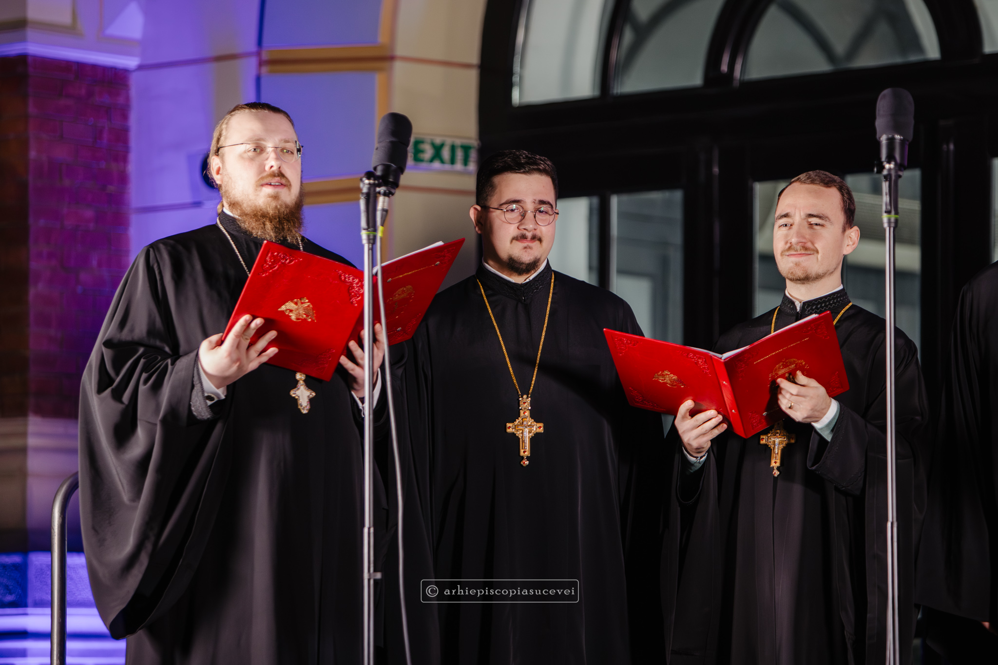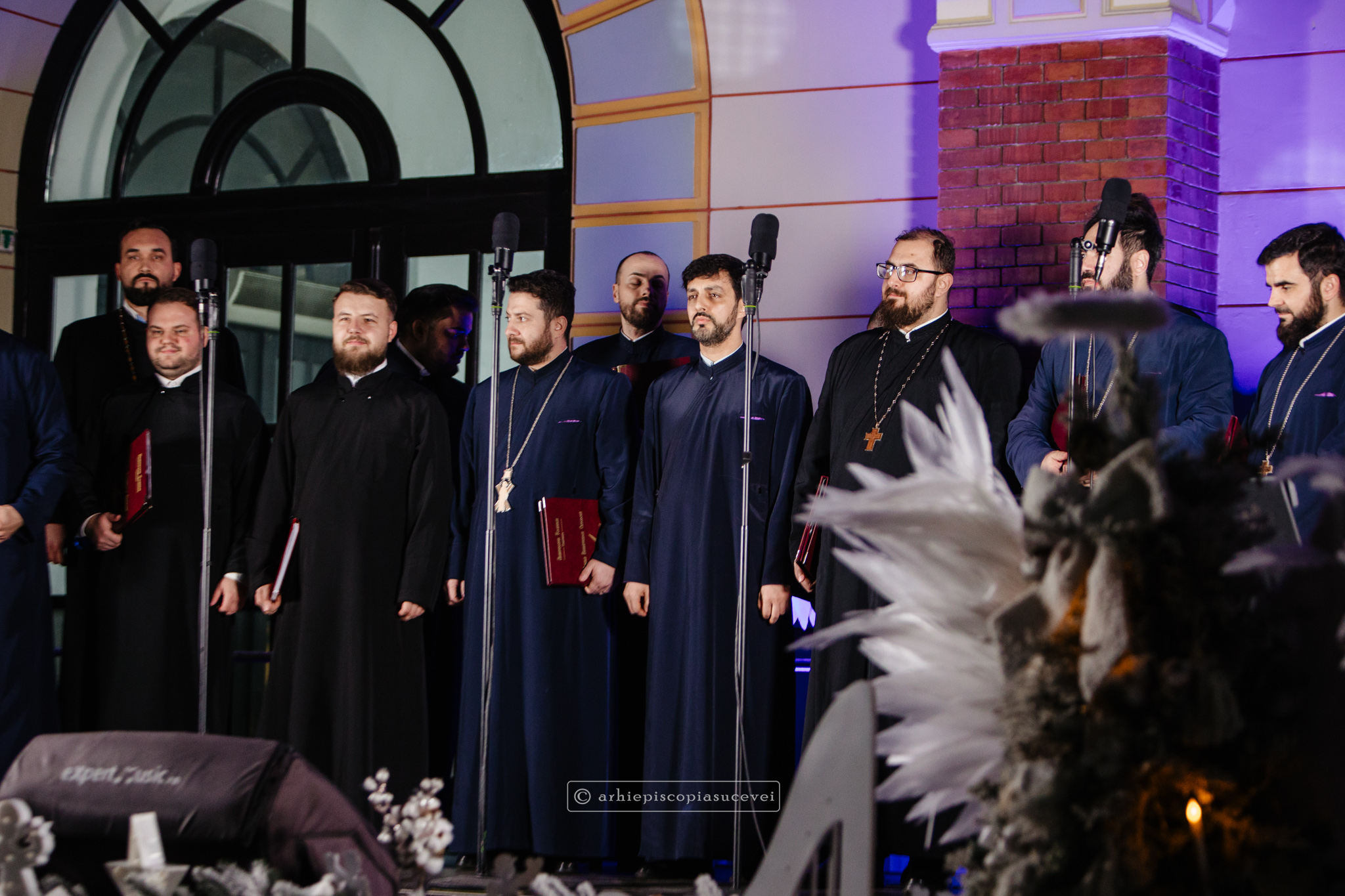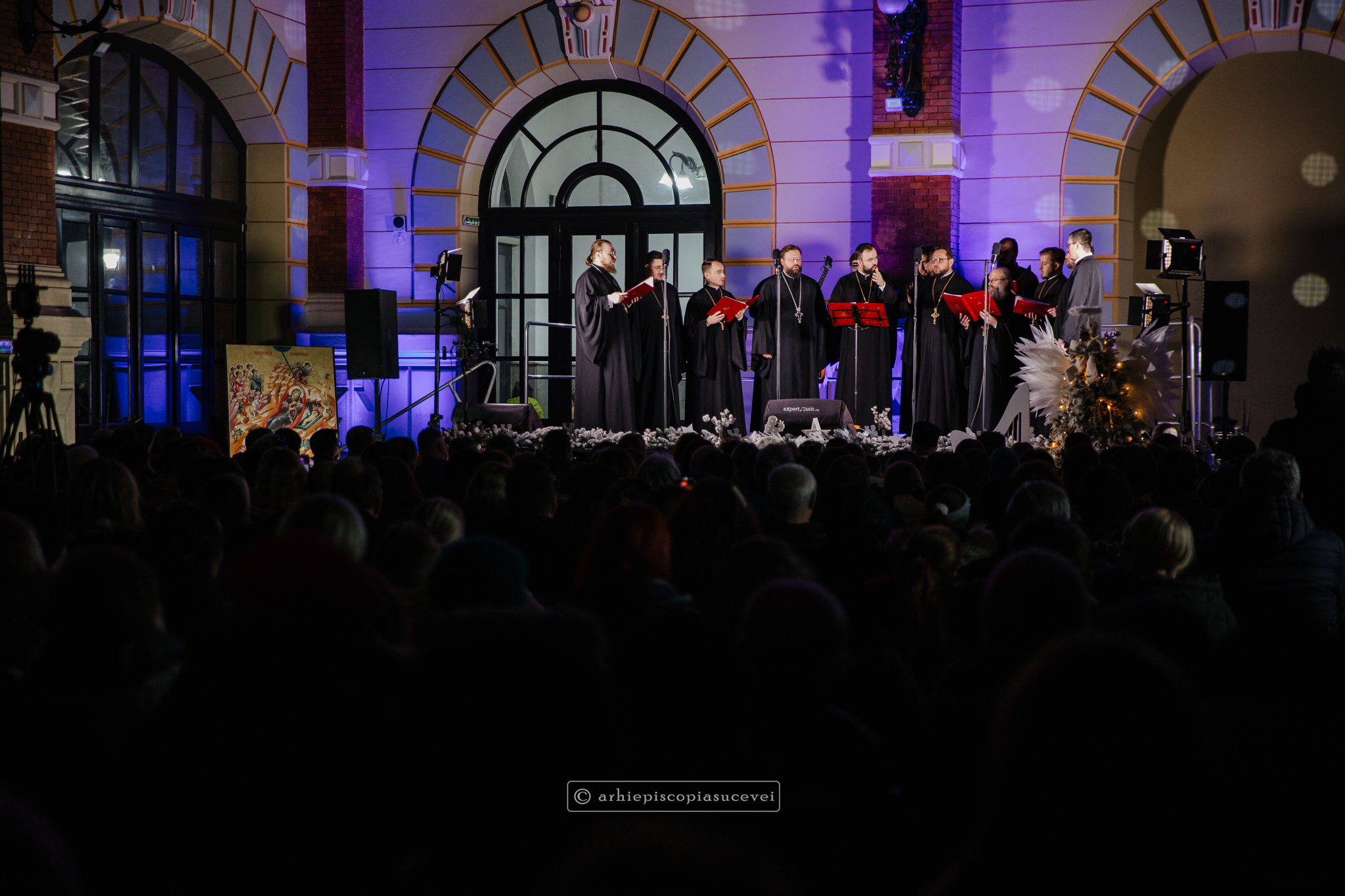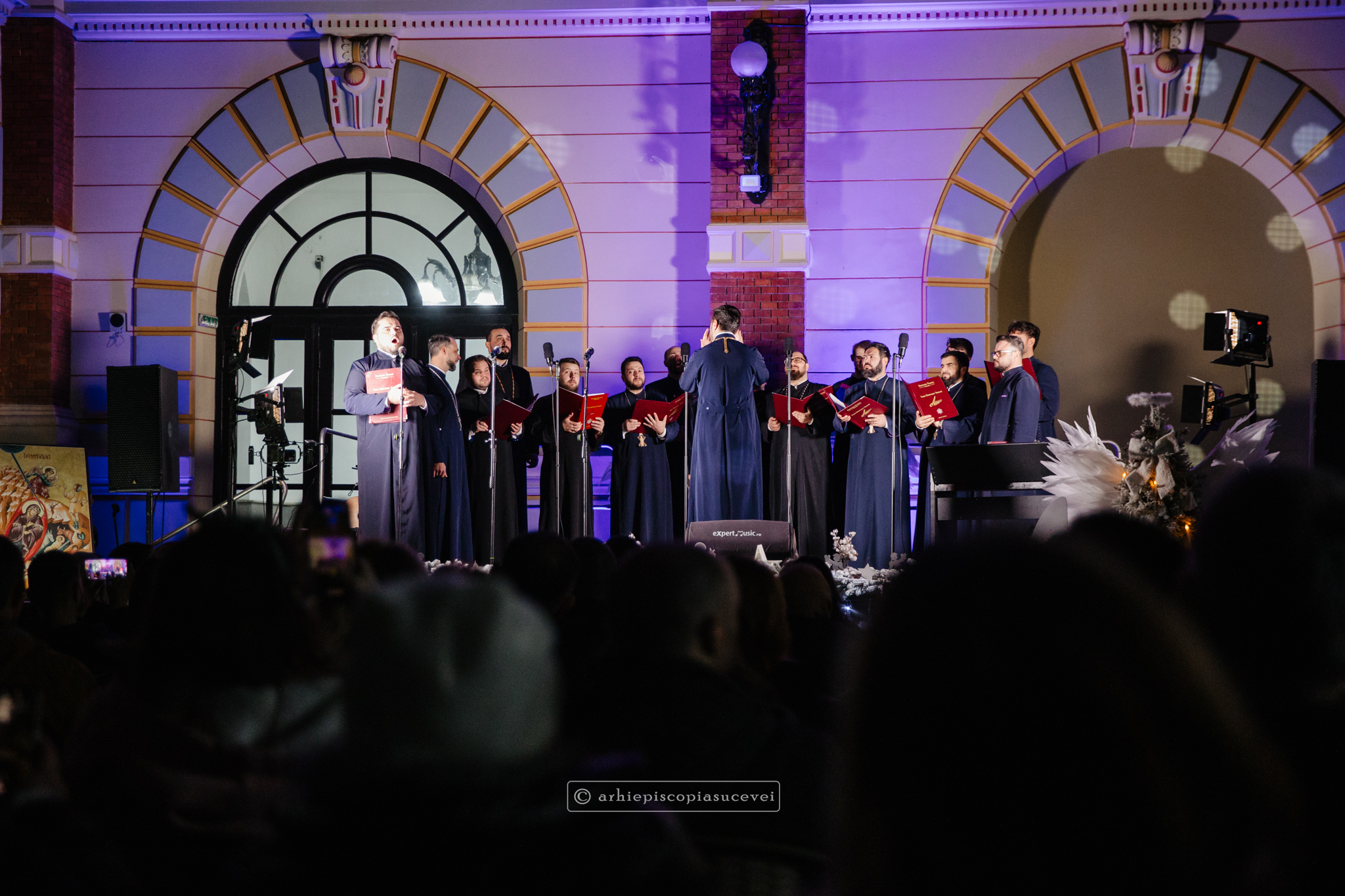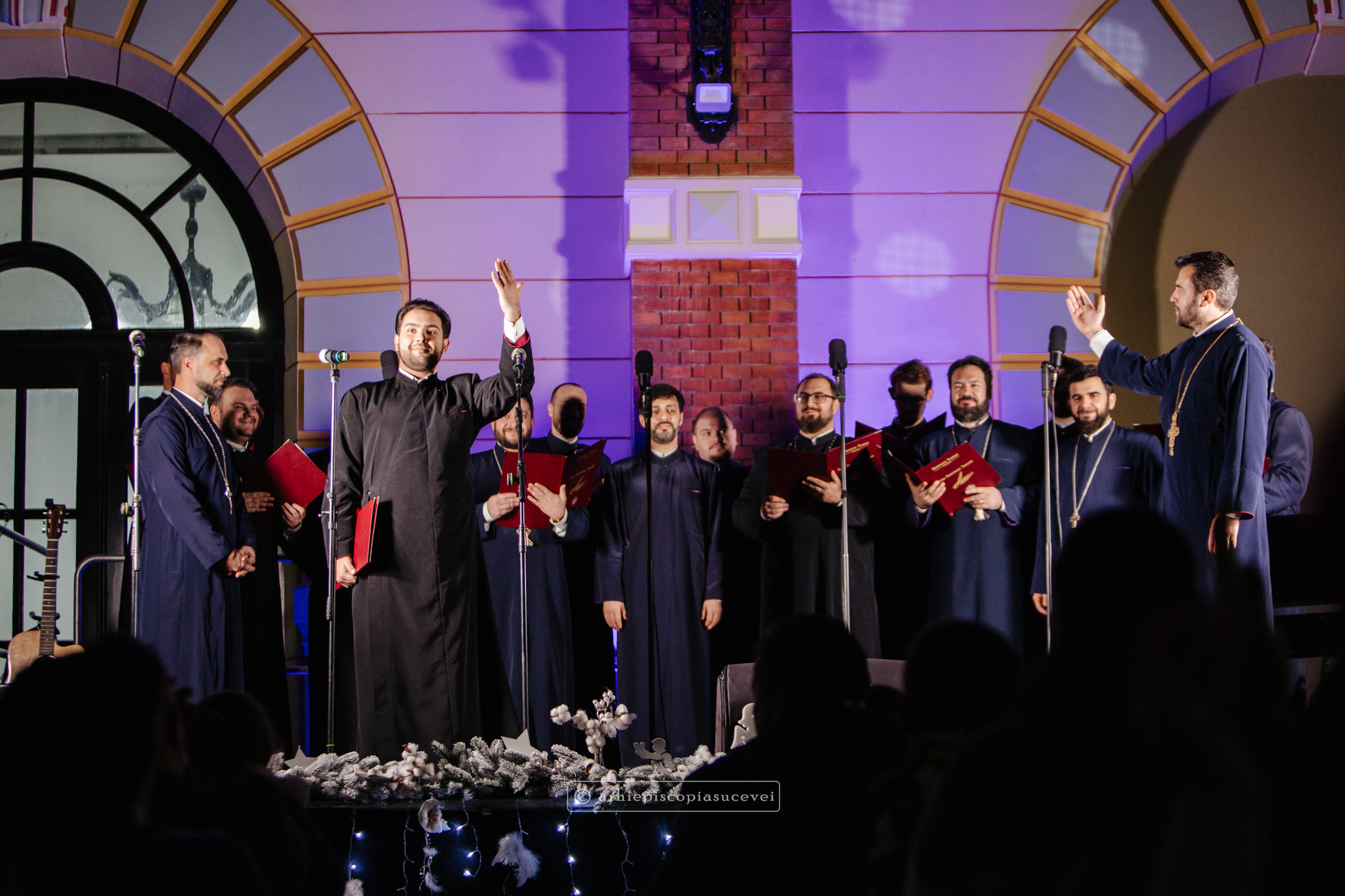 Cei dintâi care au readus în prim plan „bucuria pe care au vestit-o îngerii când S-a născut Hristos” au fost membrii Grupului Psaltic „Dimitrie Suceveanu” al Catedralei Arhiepiscopale din Suceava. Sărbătorind de curând cinci ani de activitate, grupul a fost constituit în luna noiembrie a anului 2020, la inițiativa și cu binecuvântarea Înaltpreasfințitului Părinte Arhiepiscop Calinic. Dirijat de arhid. Ilie Leonte, acesta are în componență slujitori ai Catedralei Arhiepiscopale, preoți și diaconi, cu studii teologice și conservator. Grupul psaltic poate fi audiat zilnic și în cadrul slujbelor liturgice oficiate la Mănăstirea „Sfântul Ioan cel Nou”, transmise în direct pe canalul de YouTube al Arhiepiscopiei Sucevei și Rădăuților. Prin intermediul recitalului de colinde românești din această seară au fost dăruite dăruit publicului momente alese, pline de emoție.