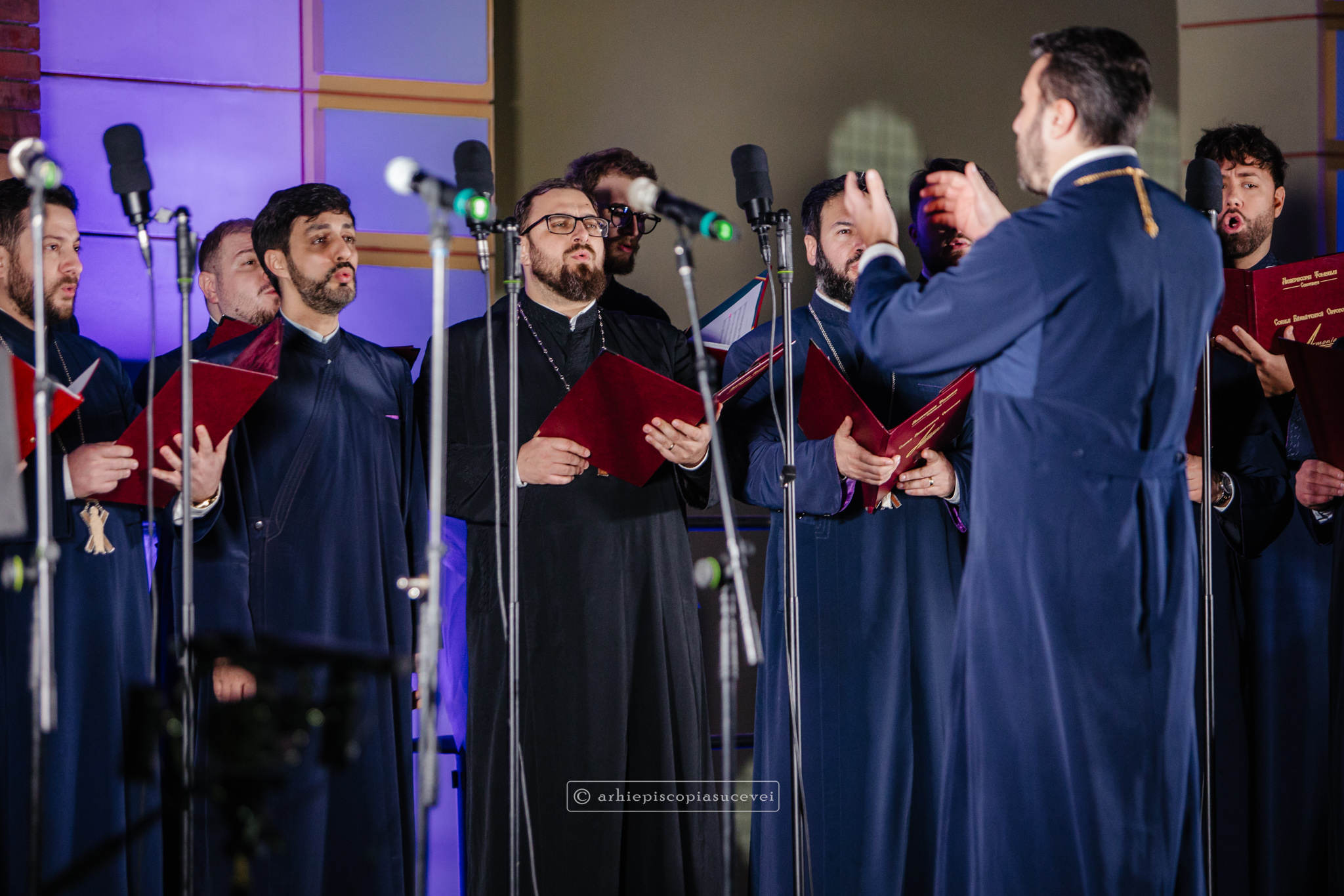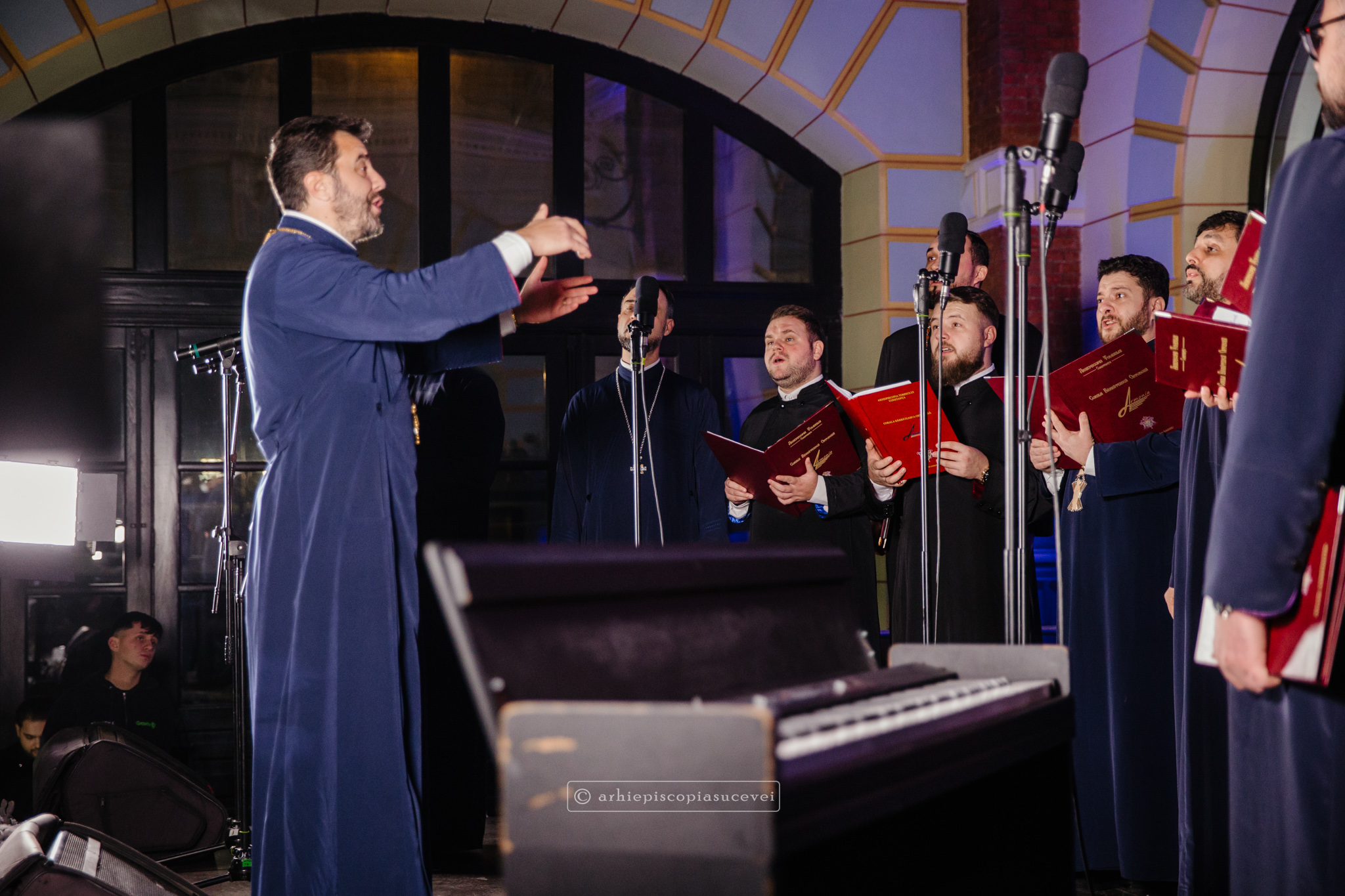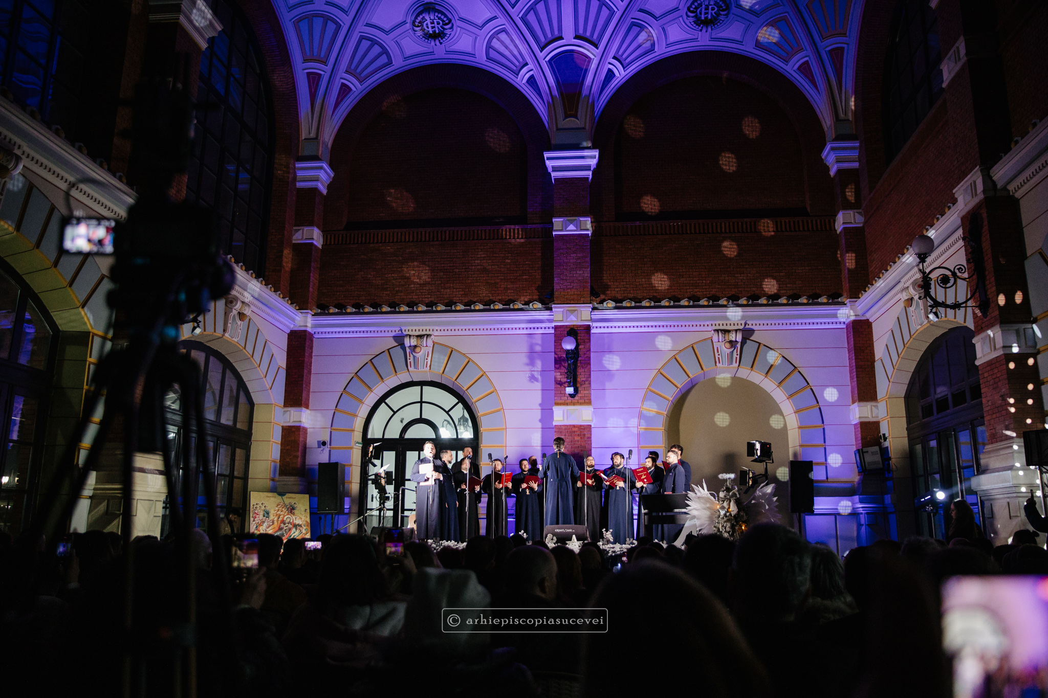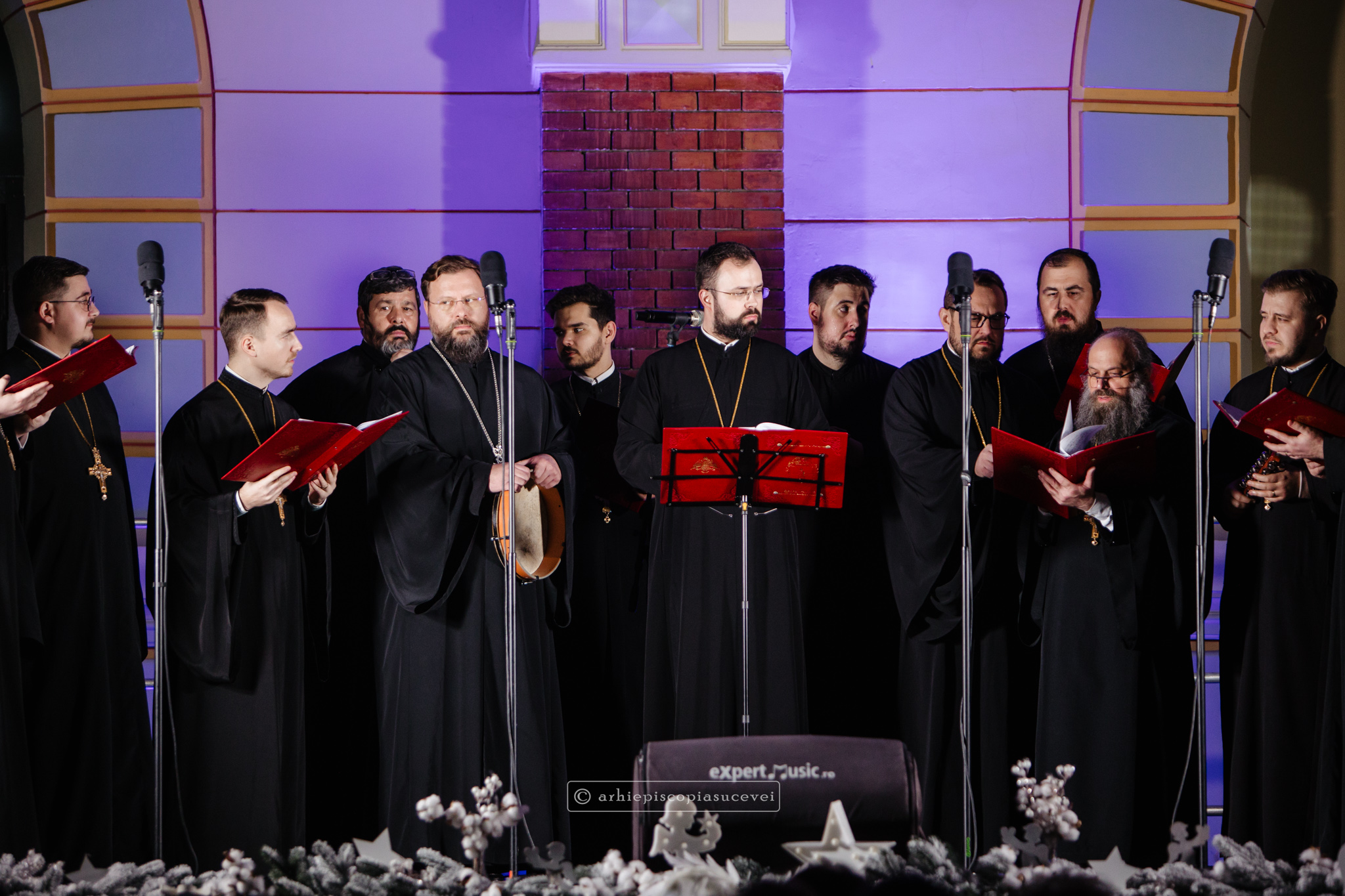 Cei dintâi care au readus în prim plan „bucuria pe care au vestit-o îngerii când S-a născut Hristos” au fost membrii Grupului Psaltic „Dimitrie Suceveanu” al Catedralei Arhiepiscopale din Suceava. Sărbătorind de curând cinci ani de activitate, grupul a fost constituit în luna noiembrie a anului 2020, la inițiativa și cu binecuvântarea Înaltpreasfințitului Părinte Arhiepiscop Calinic. Dirijat de arhid. Ilie Leonte, acesta are în componență slujitori ai Catedralei Arhiepiscopale, preoți și diaconi, cu studii teologice și conservator. Grupul psaltic poate fi audiat zilnic și în cadrul slujbelor liturgice oficiate la Mănăstirea „Sfântul Ioan cel Nou”, transmise în direct pe canalul de YouTube al Arhiepiscopiei Sucevei și Rădăuților. Prin intermediul recitalului de colinde românești din această seară au fost dăruite dăruit publicului momente alese, pline de emoție.