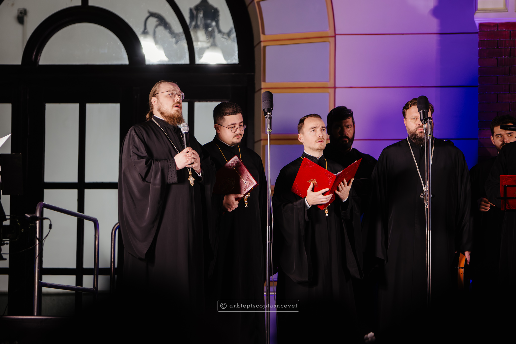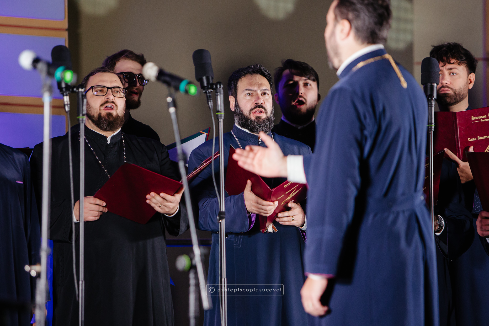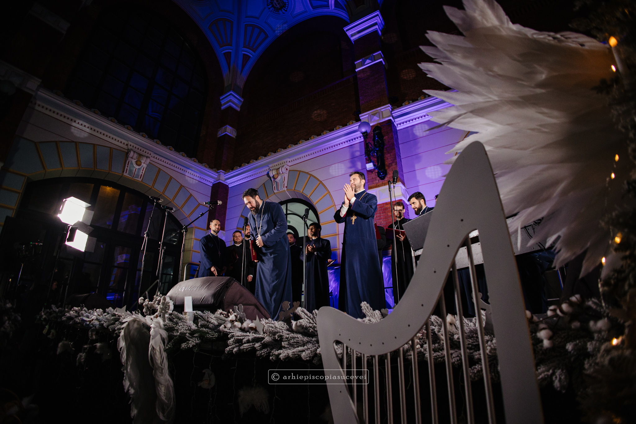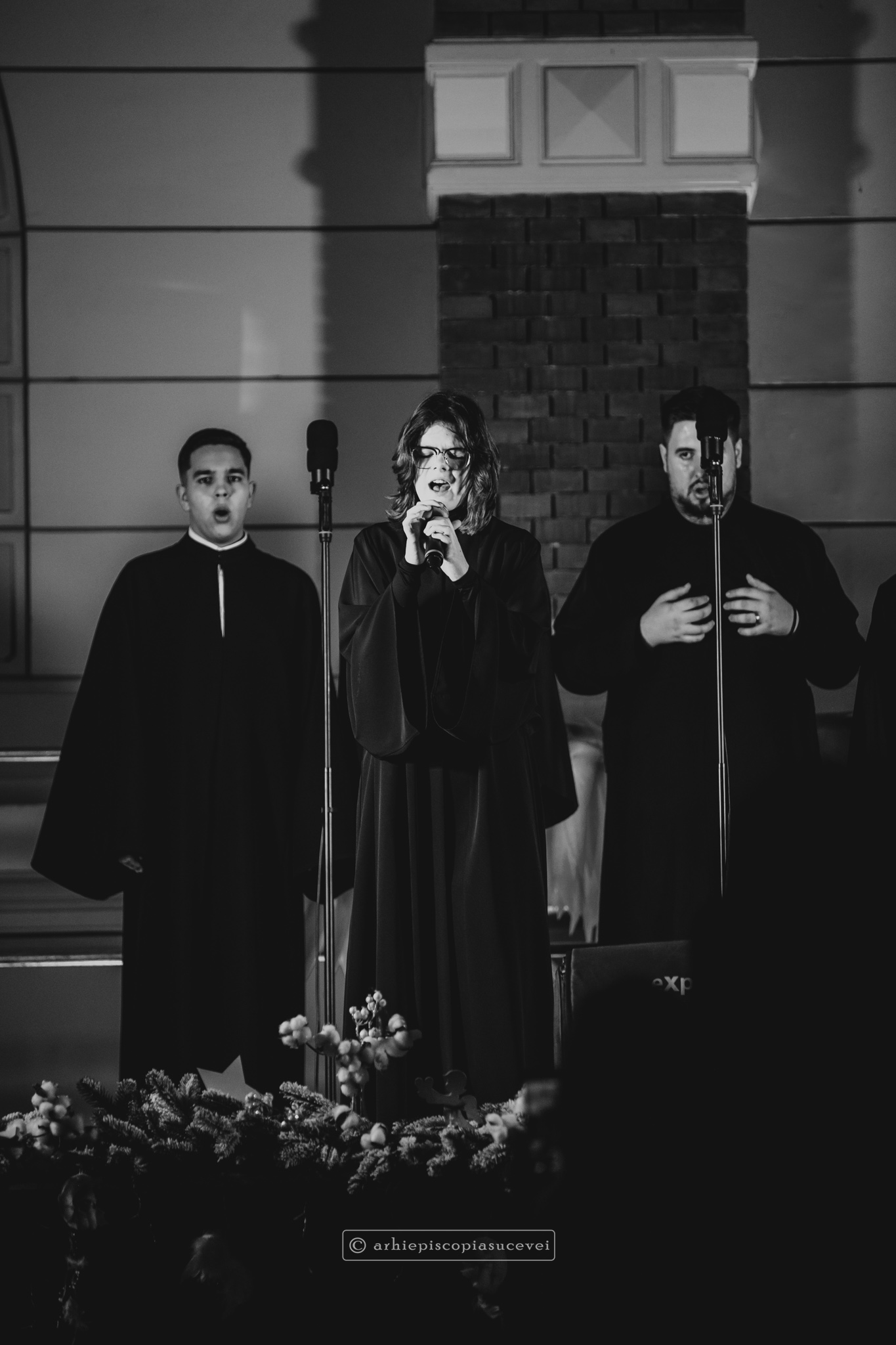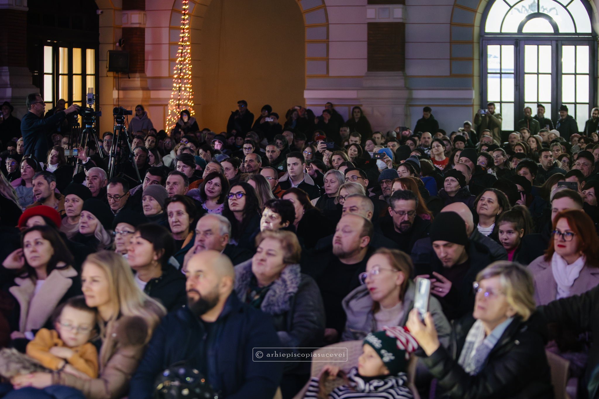 Cei dintâi care au readus în prim plan „bucuria pe care au vestit-o îngerii când S-a născut Hristos” au fost membrii Grupului Psaltic „Dimitrie Suceveanu” al Catedralei Arhiepiscopale din Suceava. Sărbătorind de curând cinci ani de activitate, grupul a fost constituit în luna noiembrie a anului 2020, la inițiativa și cu binecuvântarea Înaltpreasfințitului Părinte Arhiepiscop Calinic. Dirijat de arhid. Ilie Leonte, acesta are în componență slujitori ai Catedralei Arhiepiscopale, preoți și diaconi, cu studii teologice și conservator. Grupul psaltic poate fi audiat zilnic și în cadrul slujbelor liturgice oficiate la Mănăstirea „Sfântul Ioan cel Nou”, transmise în direct pe canalul de YouTube al Arhiepiscopiei Sucevei și Rădăuților. Prin intermediul recitalului de colinde românești din această seară au fost dăruite dăruit publicului momente alese, pline de emoție.