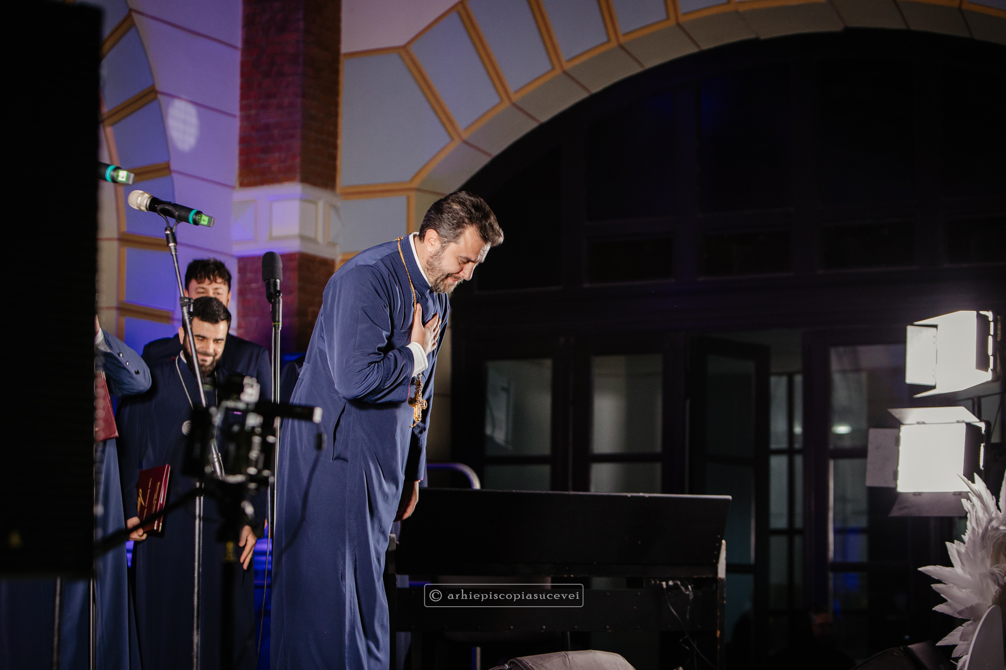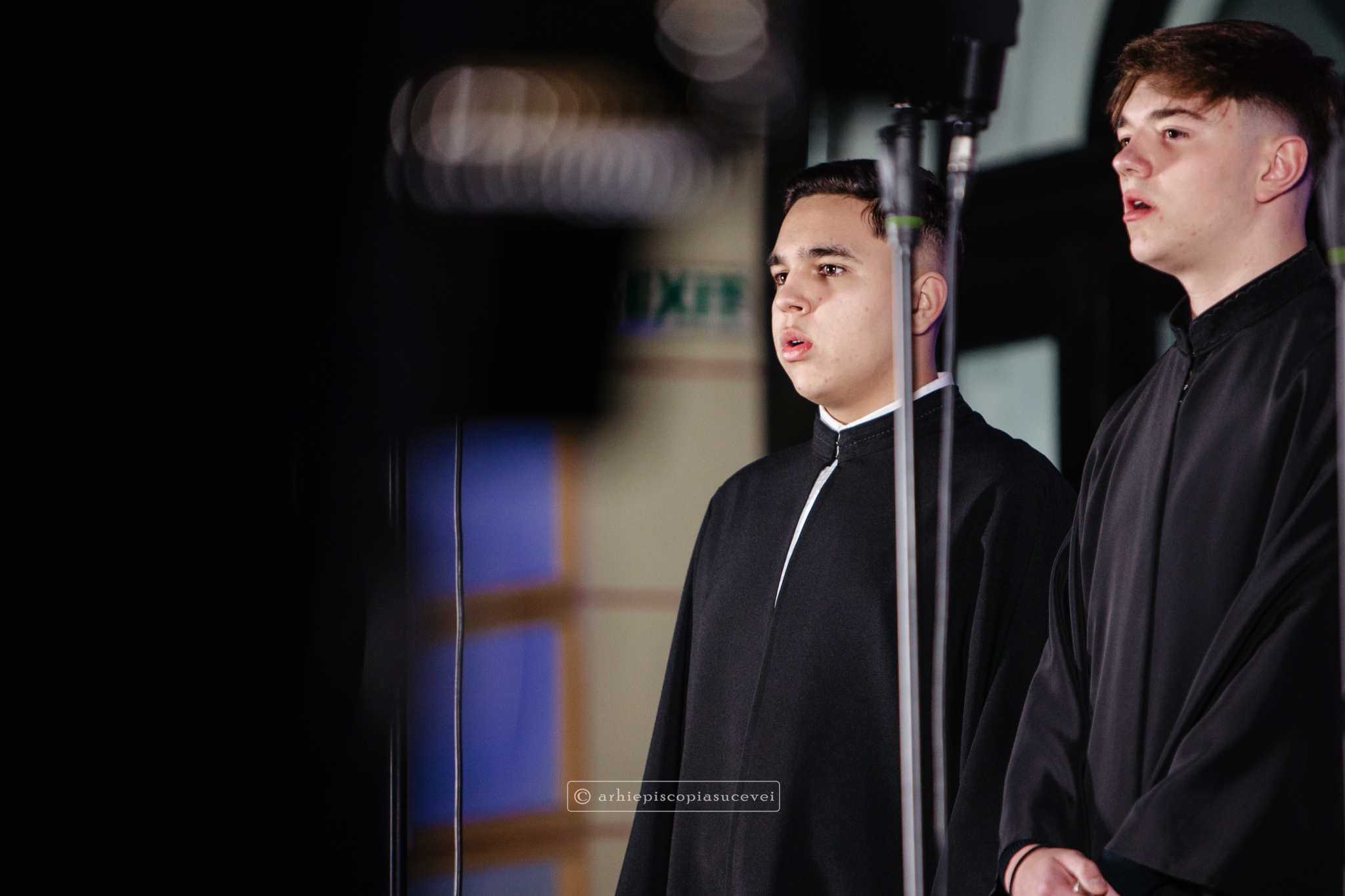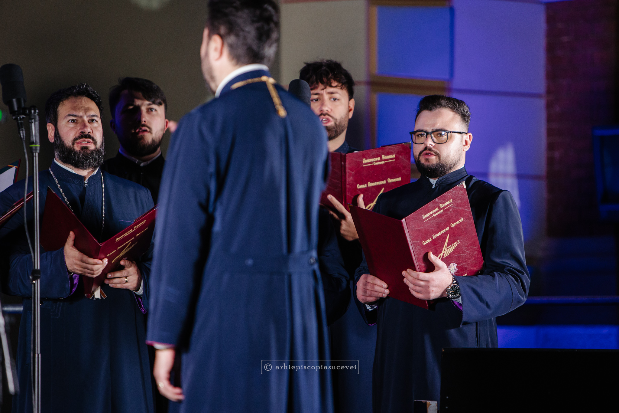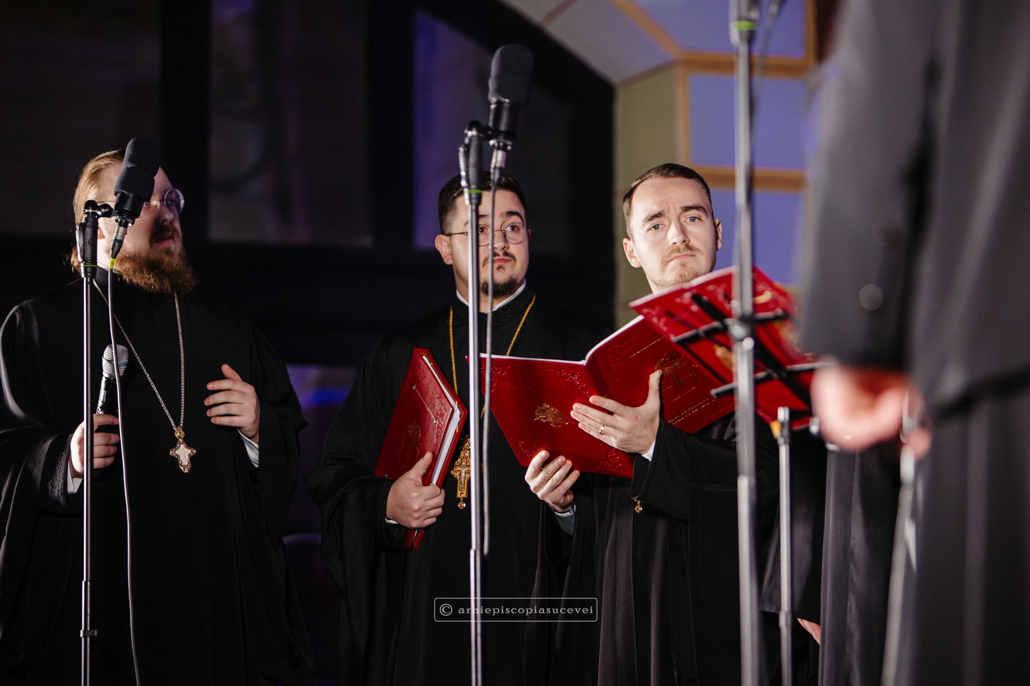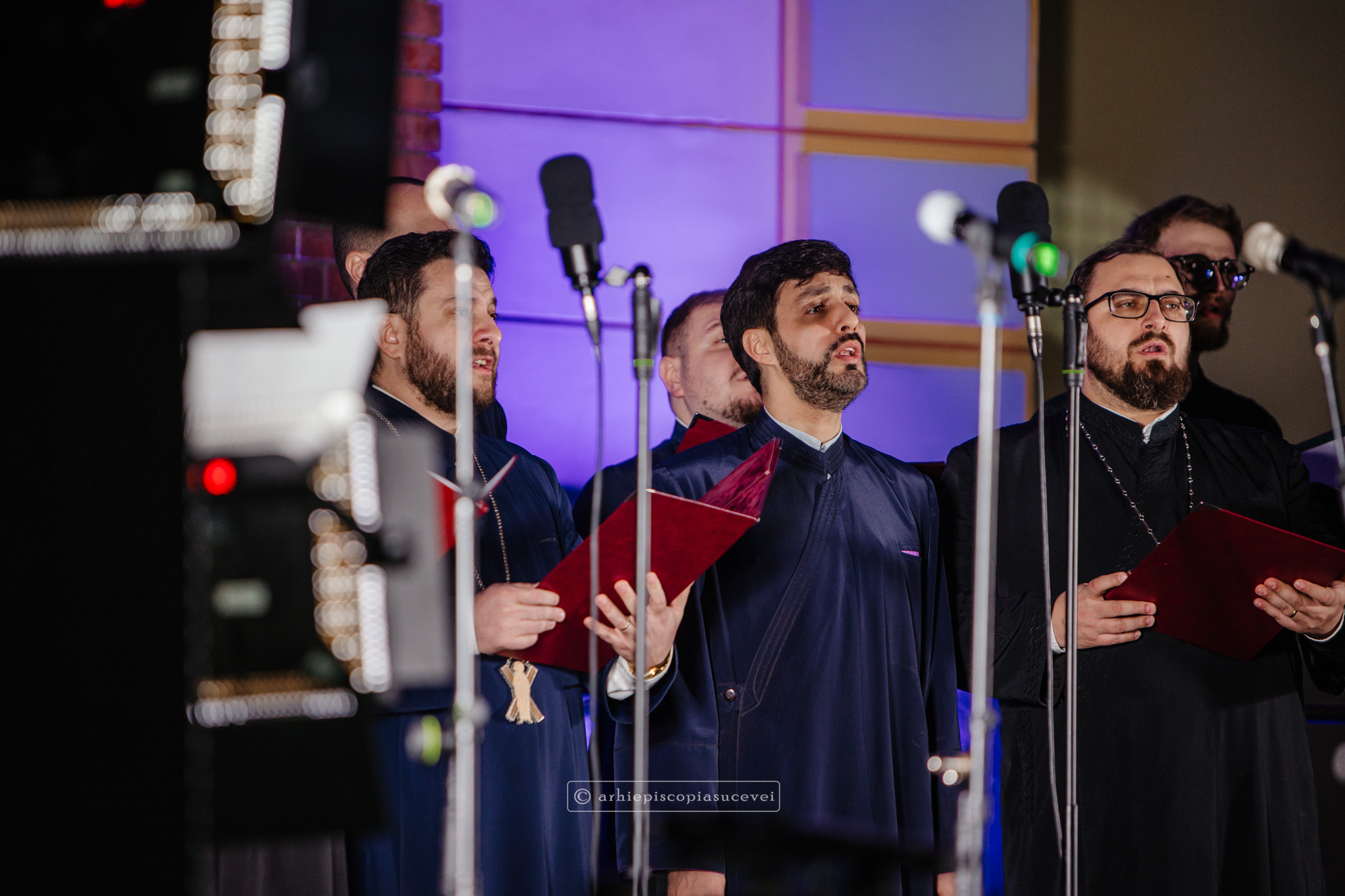 Cei dintâi care au readus în prim plan „bucuria pe care au vestit-o îngerii când S-a născut Hristos” au fost membrii Grupului Psaltic „Dimitrie Suceveanu” al Catedralei Arhiepiscopale din Suceava. Sărbătorind de curând cinci ani de activitate, grupul a fost constituit în luna noiembrie a anului 2020, la inițiativa și cu binecuvântarea Înaltpreasfințitului Părinte Arhiepiscop Calinic. Dirijat de arhid. Ilie Leonte, acesta are în componență slujitori ai Catedralei Arhiepiscopale, preoți și diaconi, cu studii teologice și conservator. Grupul psaltic poate fi audiat zilnic și în cadrul slujbelor liturgice oficiate la Mănăstirea „Sfântul Ioan cel Nou”, transmise în direct pe canalul de YouTube al Arhiepiscopiei Sucevei și Rădăuților. Prin intermediul recitalului de colinde românești din această seară au fost dăruite dăruit publicului momente alese, pline de emoție.