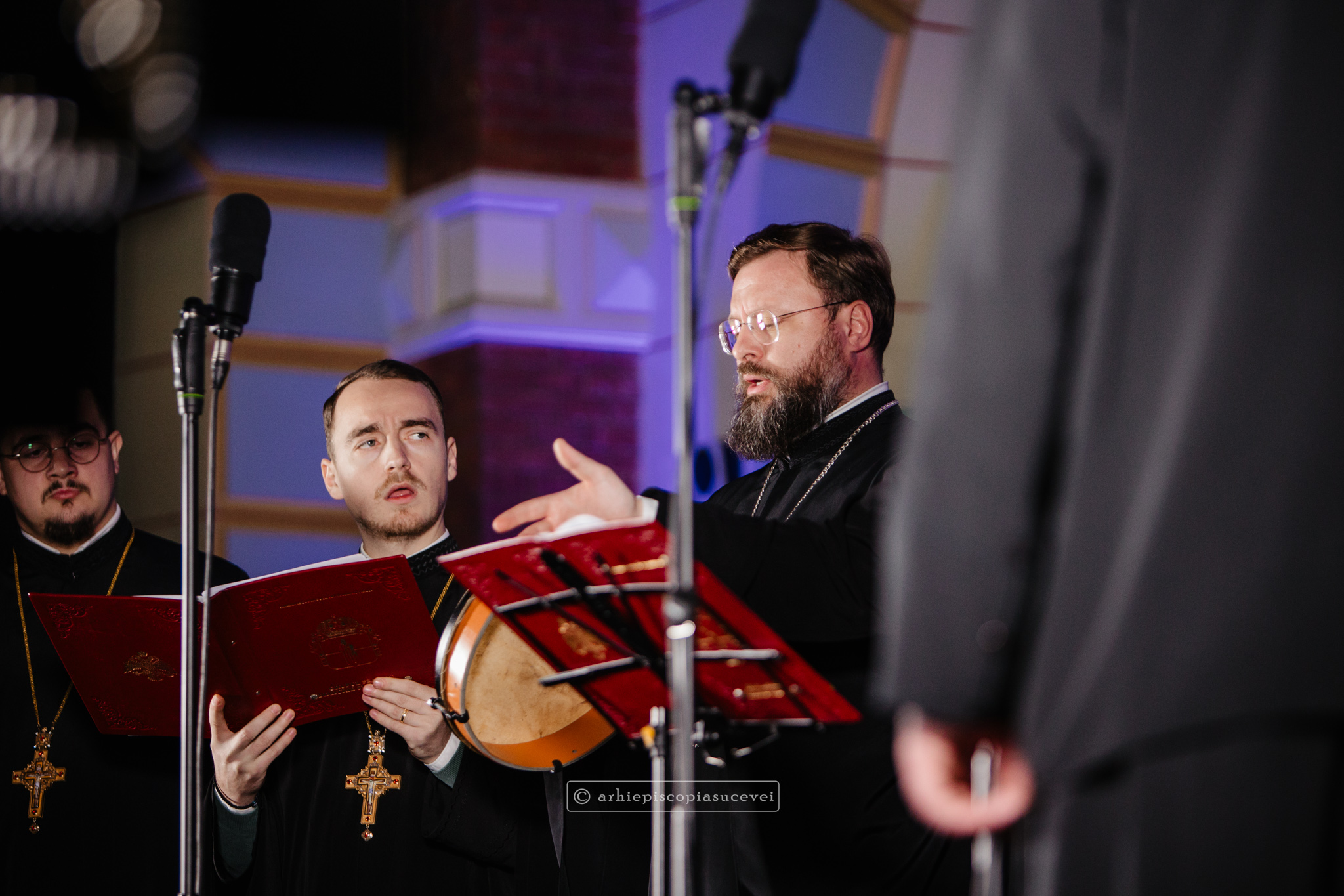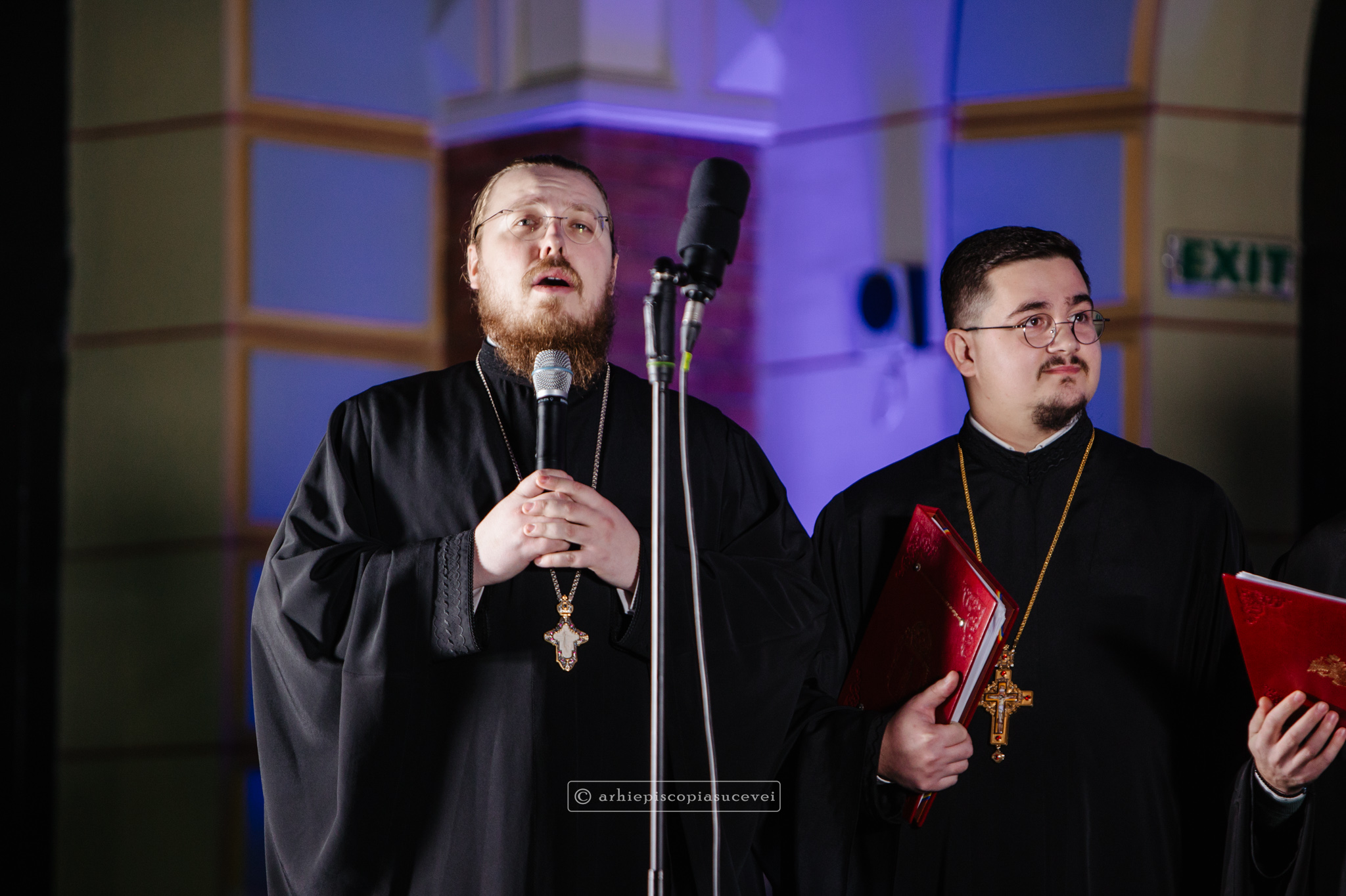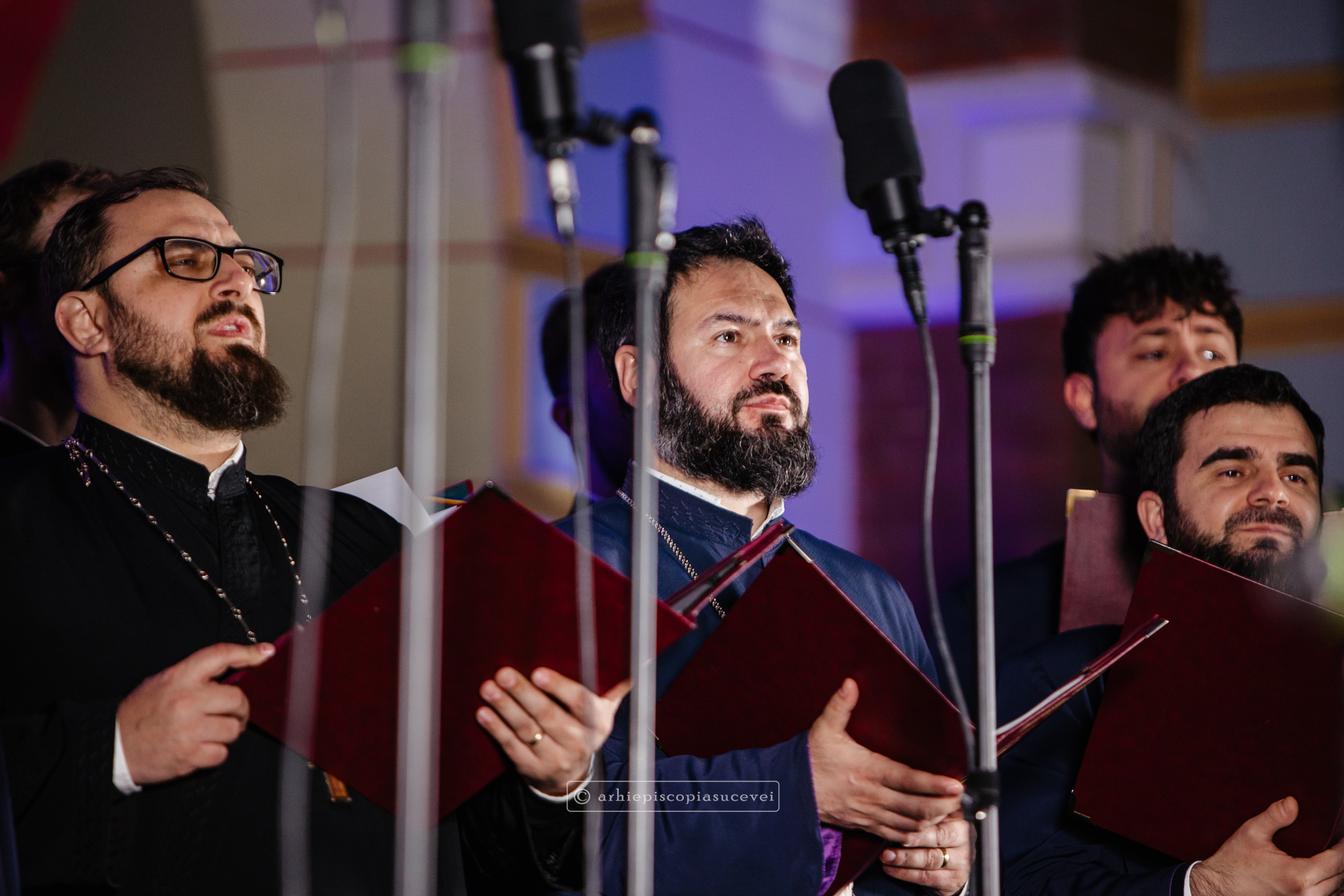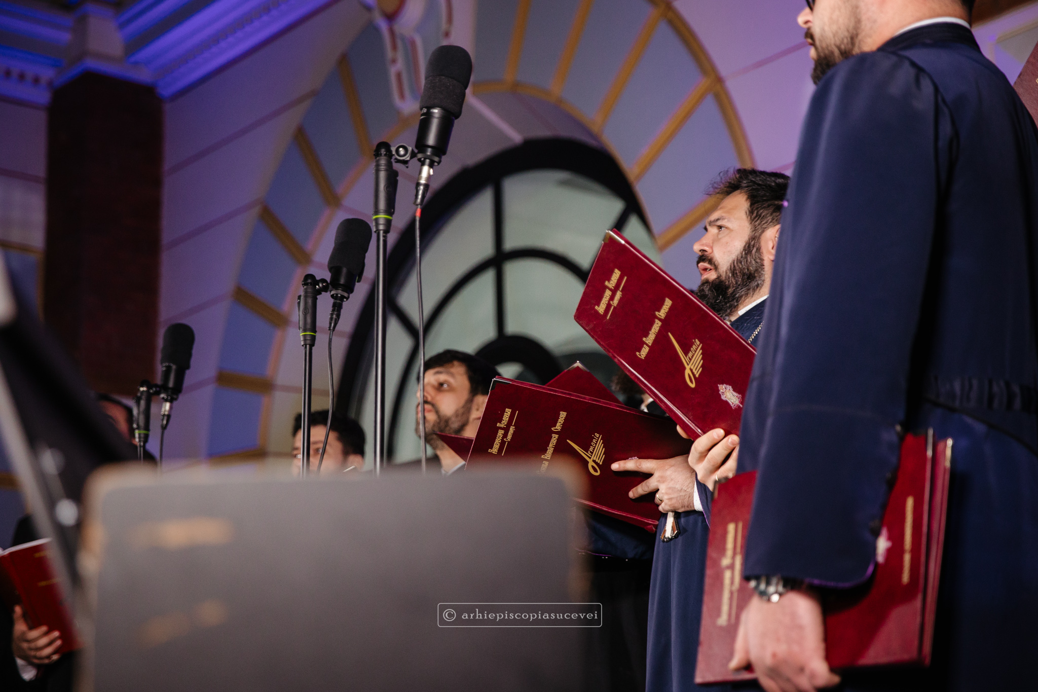 Cei dintâi care au readus în prim plan „bucuria pe care au vestit-o îngerii când S-a născut Hristos” au fost membrii Grupului Psaltic „Dimitrie Suceveanu” al Catedralei Arhiepiscopale din Suceava. Sărbătorind de curând cinci ani de activitate, grupul a fost constituit în luna noiembrie a anului 2020, la inițiativa și cu binecuvântarea Înaltpreasfințitului Părinte Arhiepiscop Calinic. Dirijat de arhid. Ilie Leonte, acesta are în componență slujitori ai Catedralei Arhiepiscopale, preoți și diaconi, cu studii teologice și conservator. Grupul psaltic poate fi audiat zilnic și în cadrul slujbelor liturgice oficiate la Mănăstirea „Sfântul Ioan cel Nou”, transmise în direct pe canalul de YouTube al Arhiepiscopiei Sucevei și Rădăuților. Prin intermediul recitalului de colinde românești din această seară au fost dăruite dăruit publicului momente alese, pline de emoție.