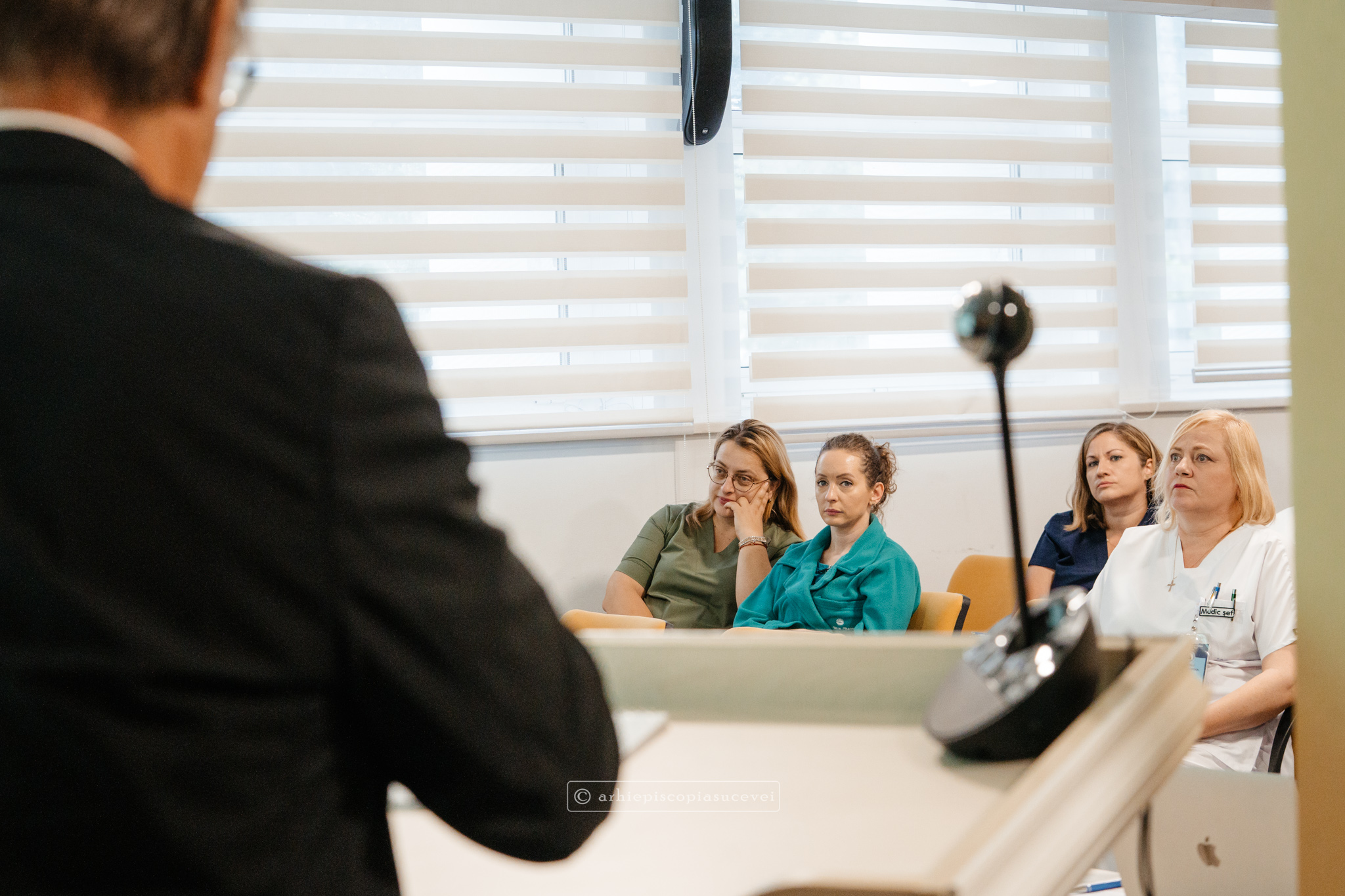 Întâlnirea, desfășurată în sala de ședințe a instituției medicale, a fost moderată de coordonatorul științific al evenimentului, prof. dr. Cristian Lupașcu, șeful Clinicii Chirurgie II de la Spitalul „Sfântul Spiridon” din Iași și cadru didactic în cadrul Universității de Medicină și Farmacie „Grigore T. Popa” din Iași, inițiator al acestei serii de conferințe care a debutat în toamna anului trecut la Iași.