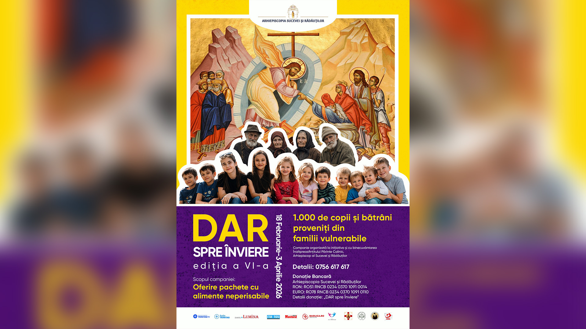 Cu binecuvântarea Înaltpreasfințitului Părinte Calinic, Arhiepiscop al Sucevei și Rădăuților, Sectorul de Asistență Socială și Medicală anunță începutul celei de-a șasea ediții a campaniei filantropice DAR spre Înviere. Campania se va desfășura în perioada 18 februarie – 3 aprilie 2026 și are ca scop ajutorarea a 1.000 de persoane, copii din familii greu încercate și vârstnici singuri, care se confruntă cu mari lipsuri materiale.