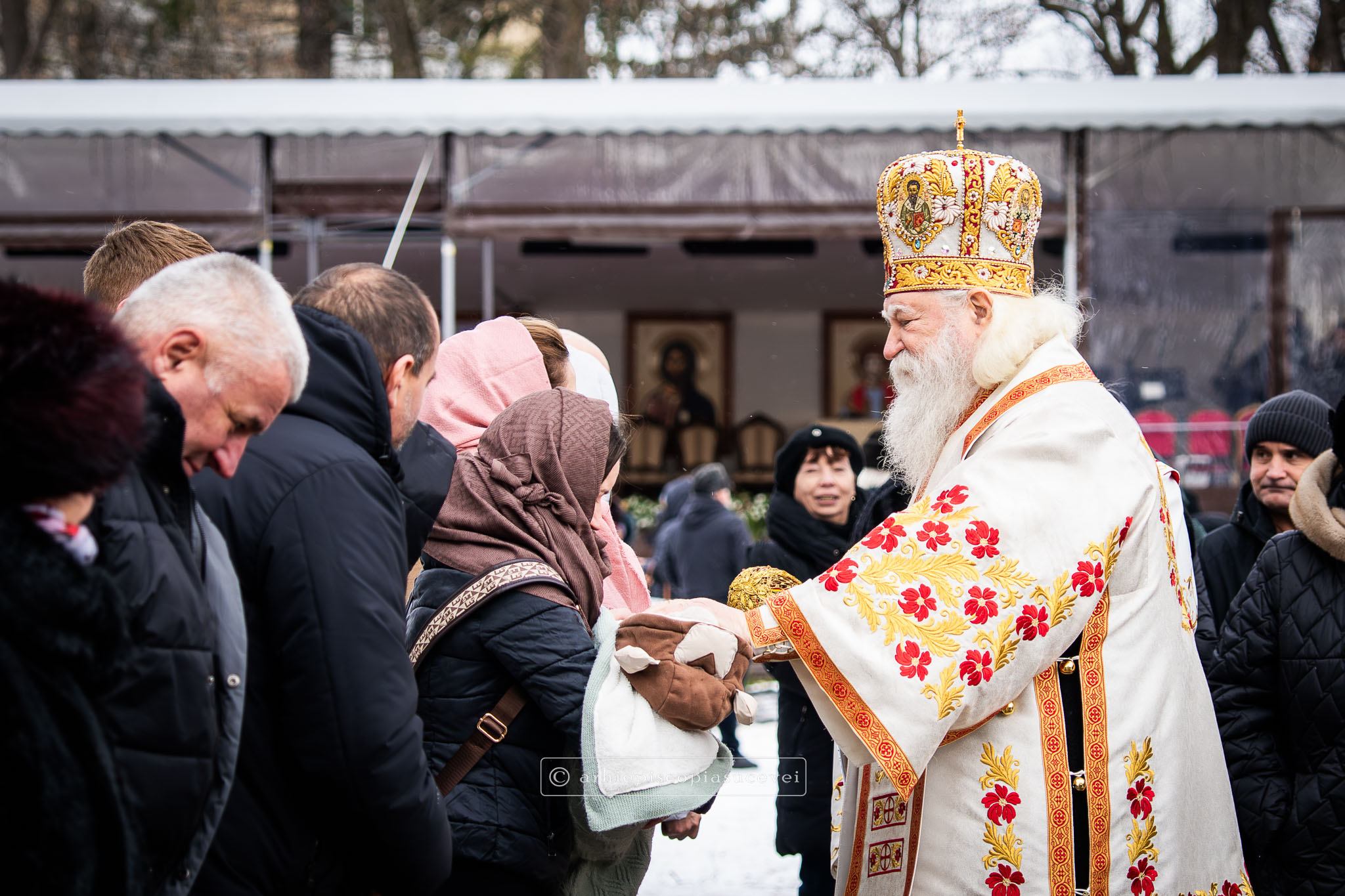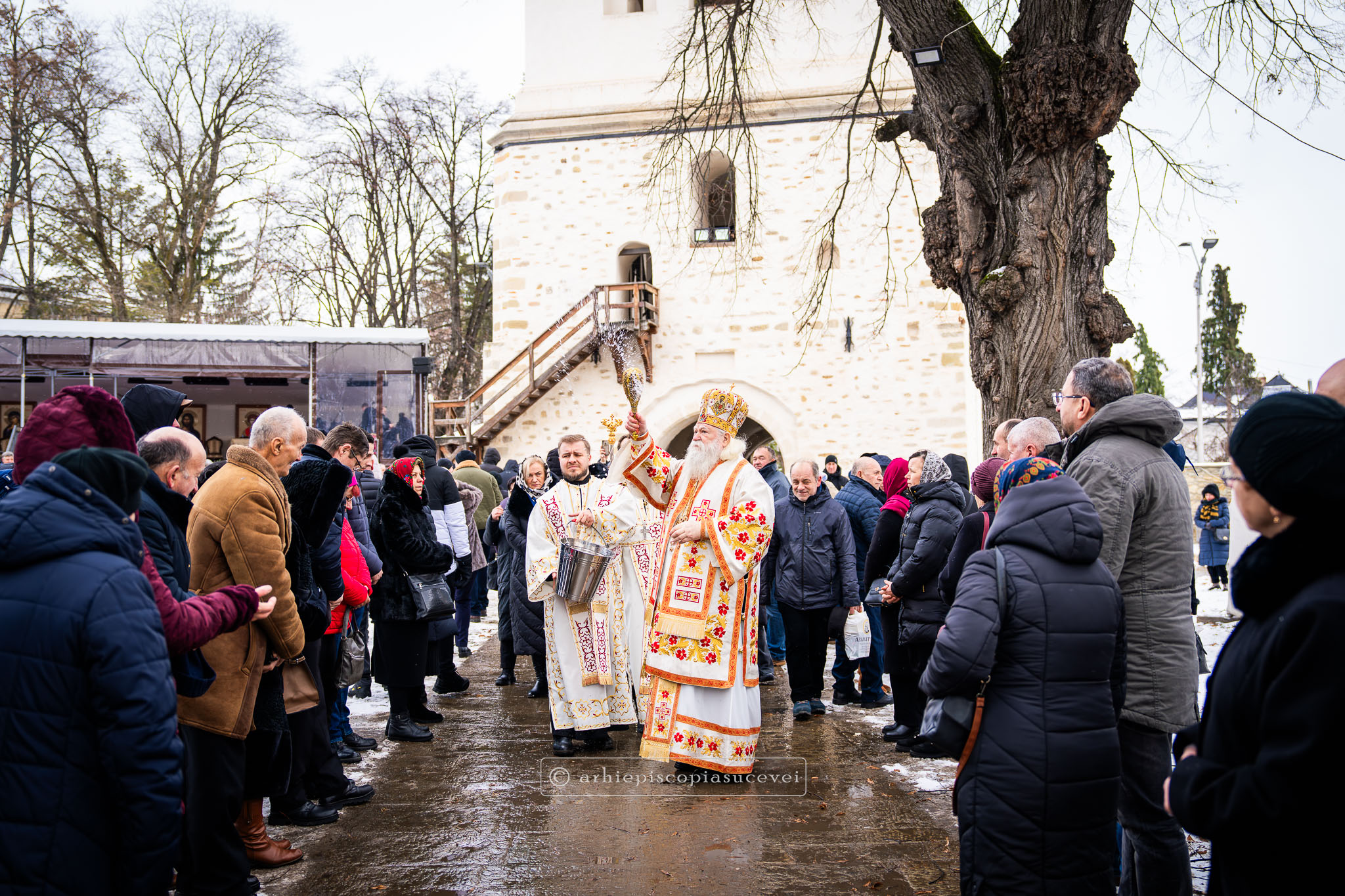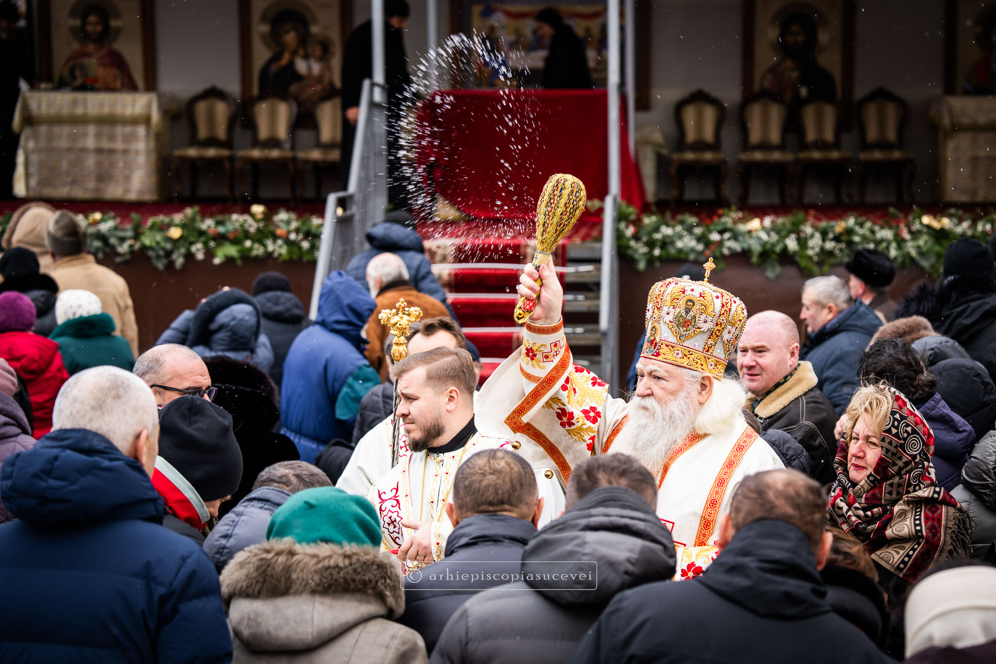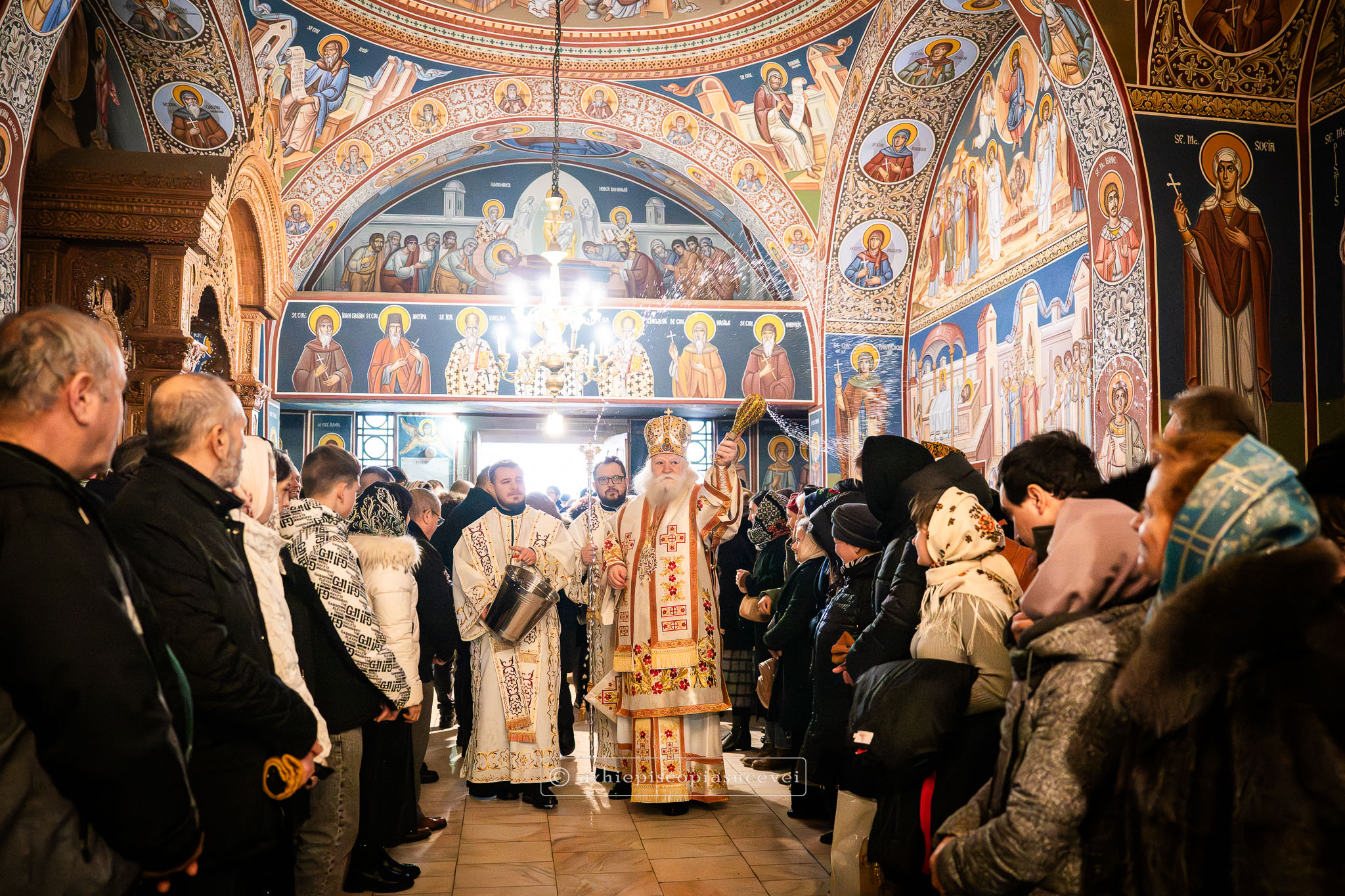 Înaltpreasfinția Sa i-a binecuvântat apoi pe cei care și-au îndreptat pașii spre Catedrala Arhiepiscopală prin stropire cu apă sfințită, credincioși care au venit cu multă evlavie să îl cinstească pe sfântul ocrotitor al Cetății Sucevei, grabnic ajutător, mângâietor și mare făcător de minuni.