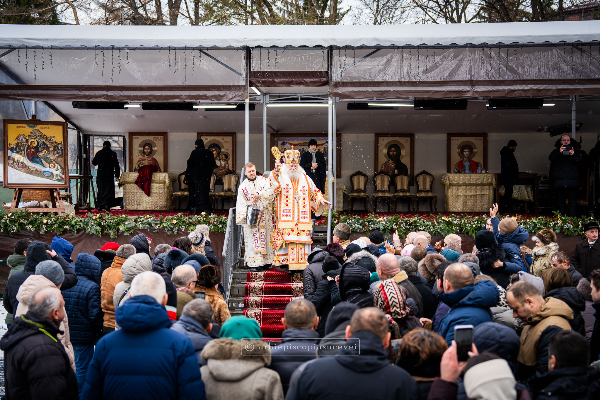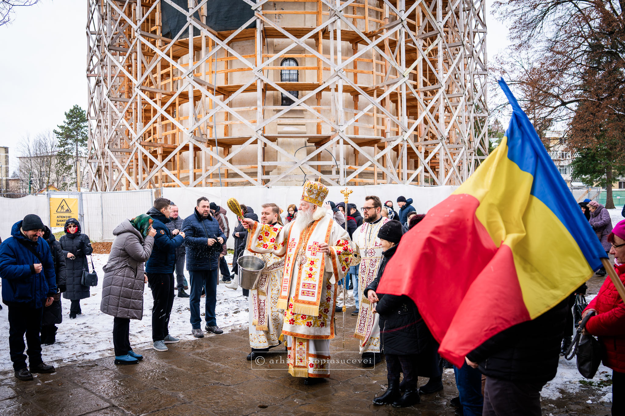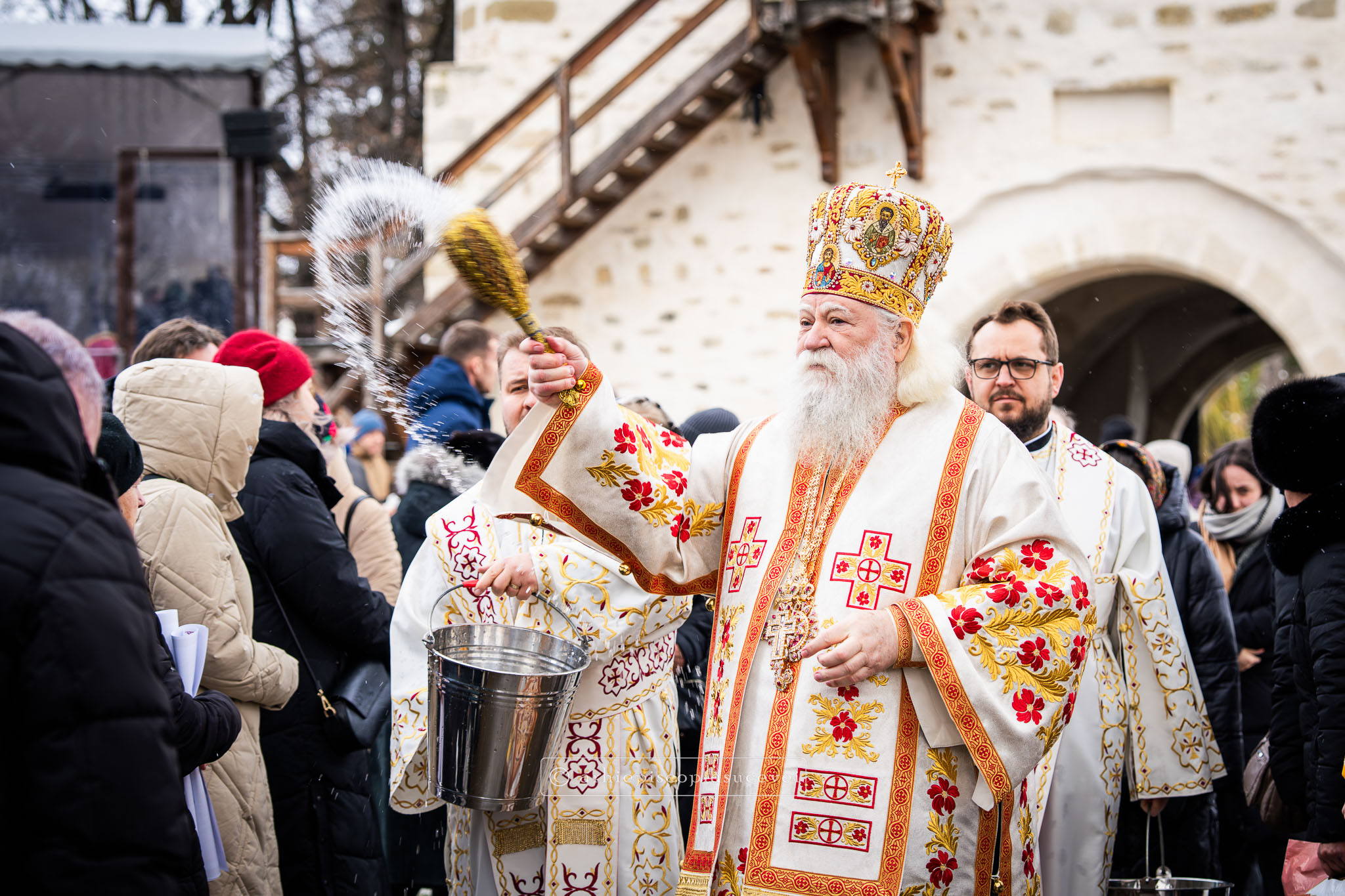 Înaltpreasfinția Sa i-a binecuvântat apoi pe cei care și-au îndreptat pașii spre Catedrala Arhiepiscopală prin stropire cu apă sfințită, credincioși care au venit cu multă evlavie să îl cinstească pe sfântul ocrotitor al Cetății Sucevei, grabnic ajutător, mângâietor și mare făcător de minuni.