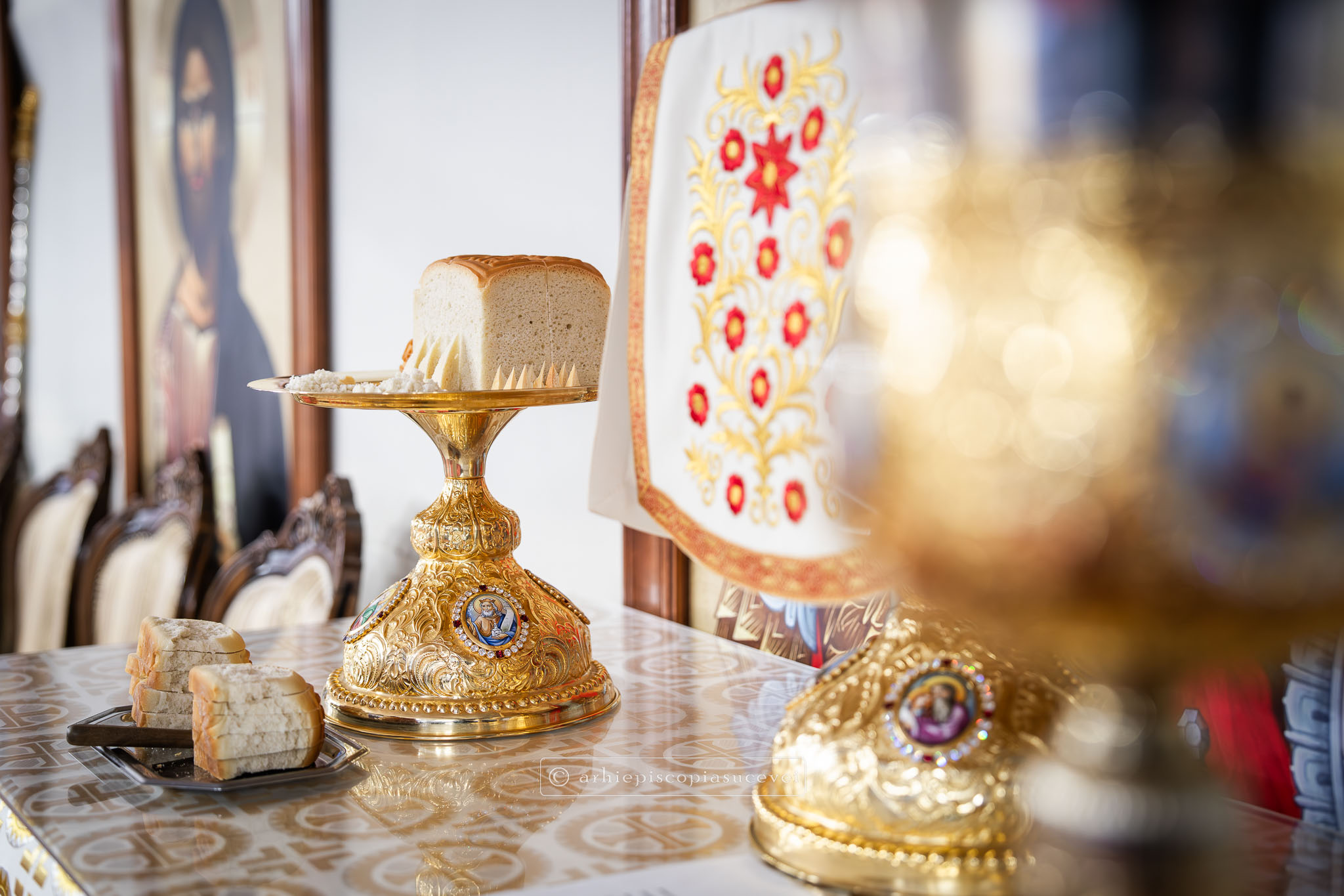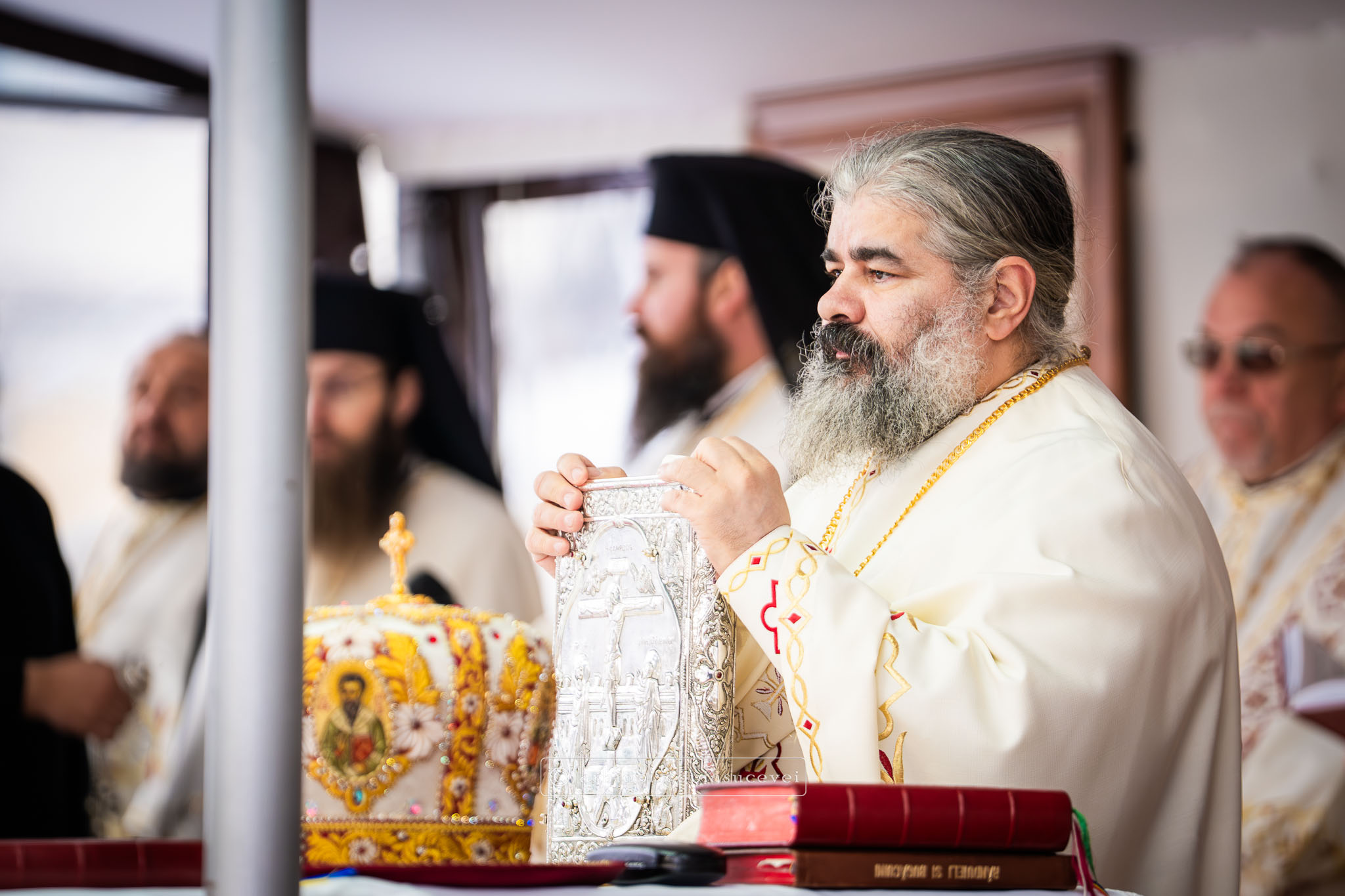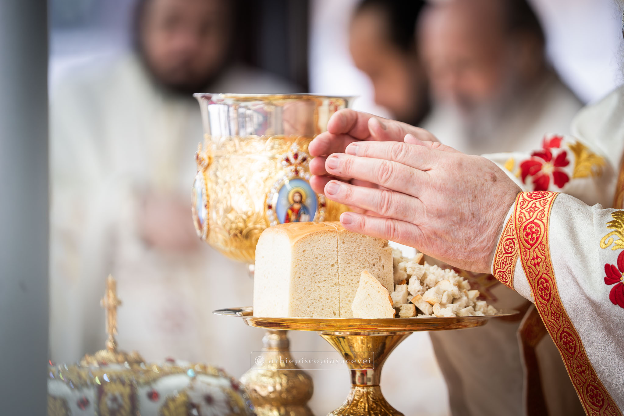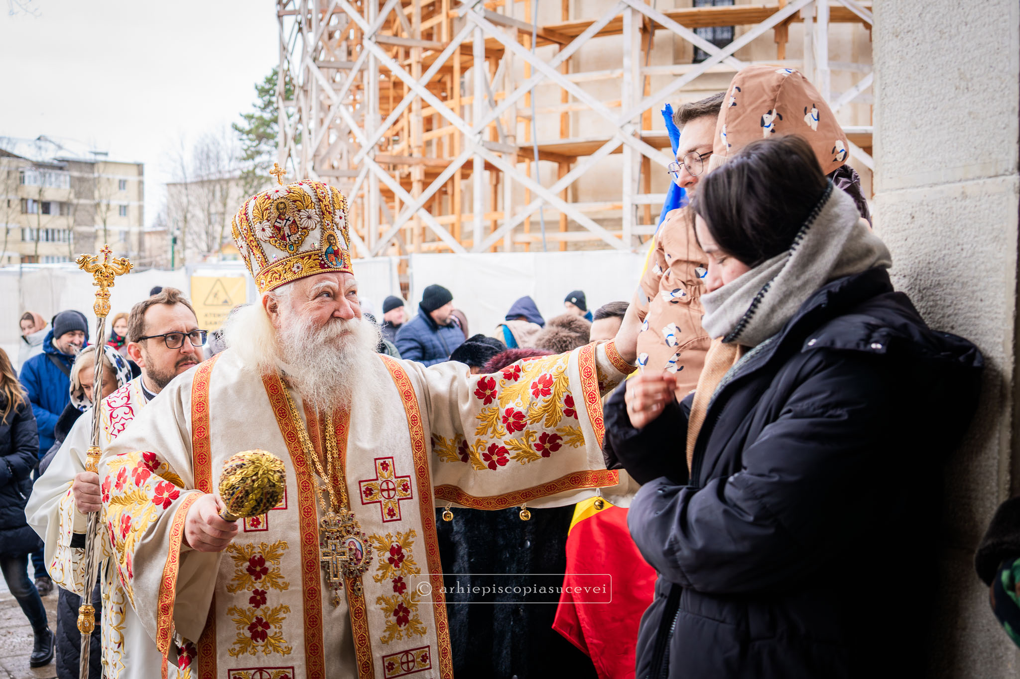 Înaltpreasfinția Sa i-a binecuvântat apoi pe cei care și-au îndreptat pașii spre Catedrala Arhiepiscopală prin stropire cu apă sfințită, credincioși care au venit cu multă evlavie să îl cinstească pe sfântul ocrotitor al Cetății Sucevei, grabnic ajutător, mângâietor și mare făcător de minuni.