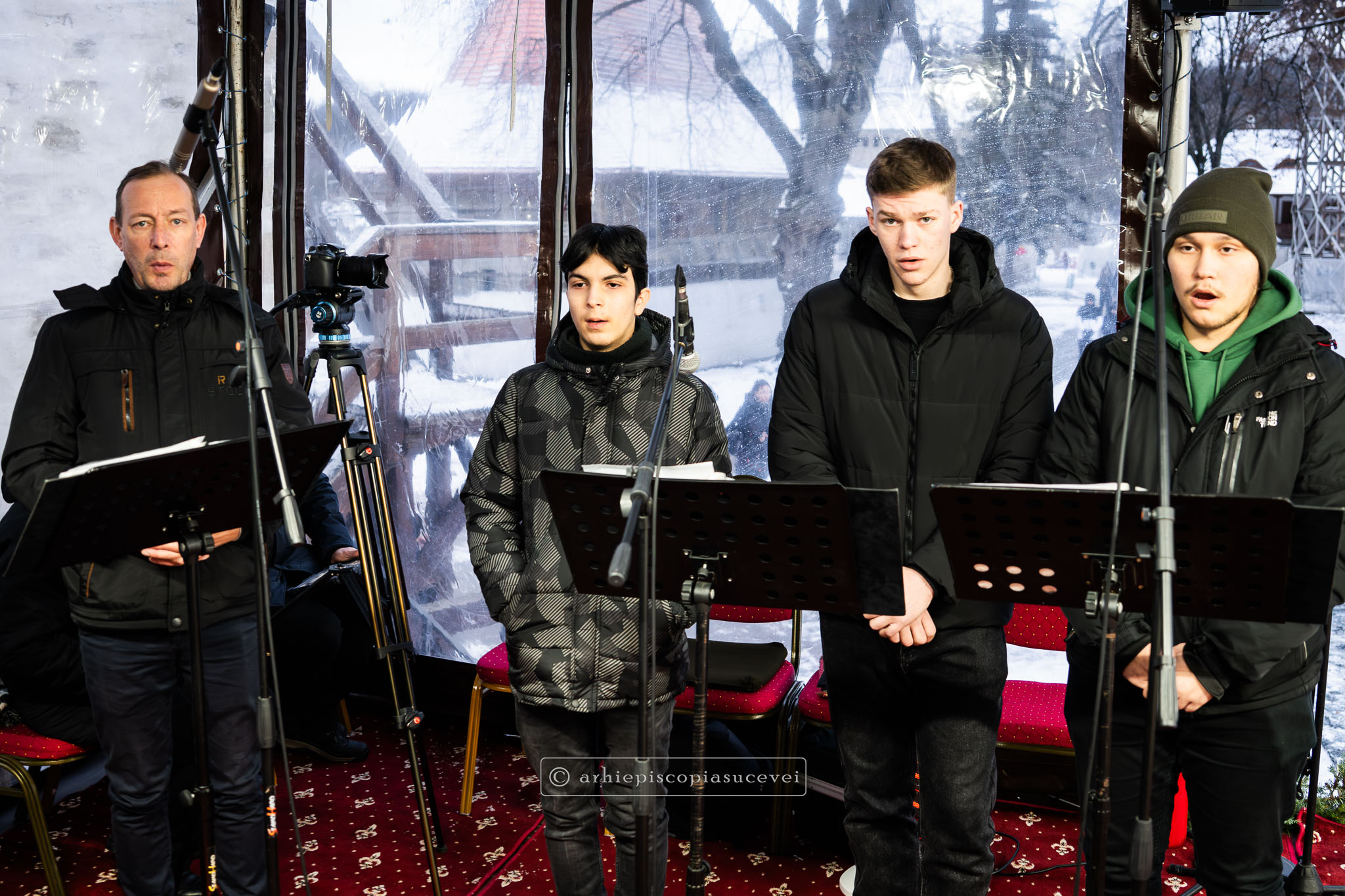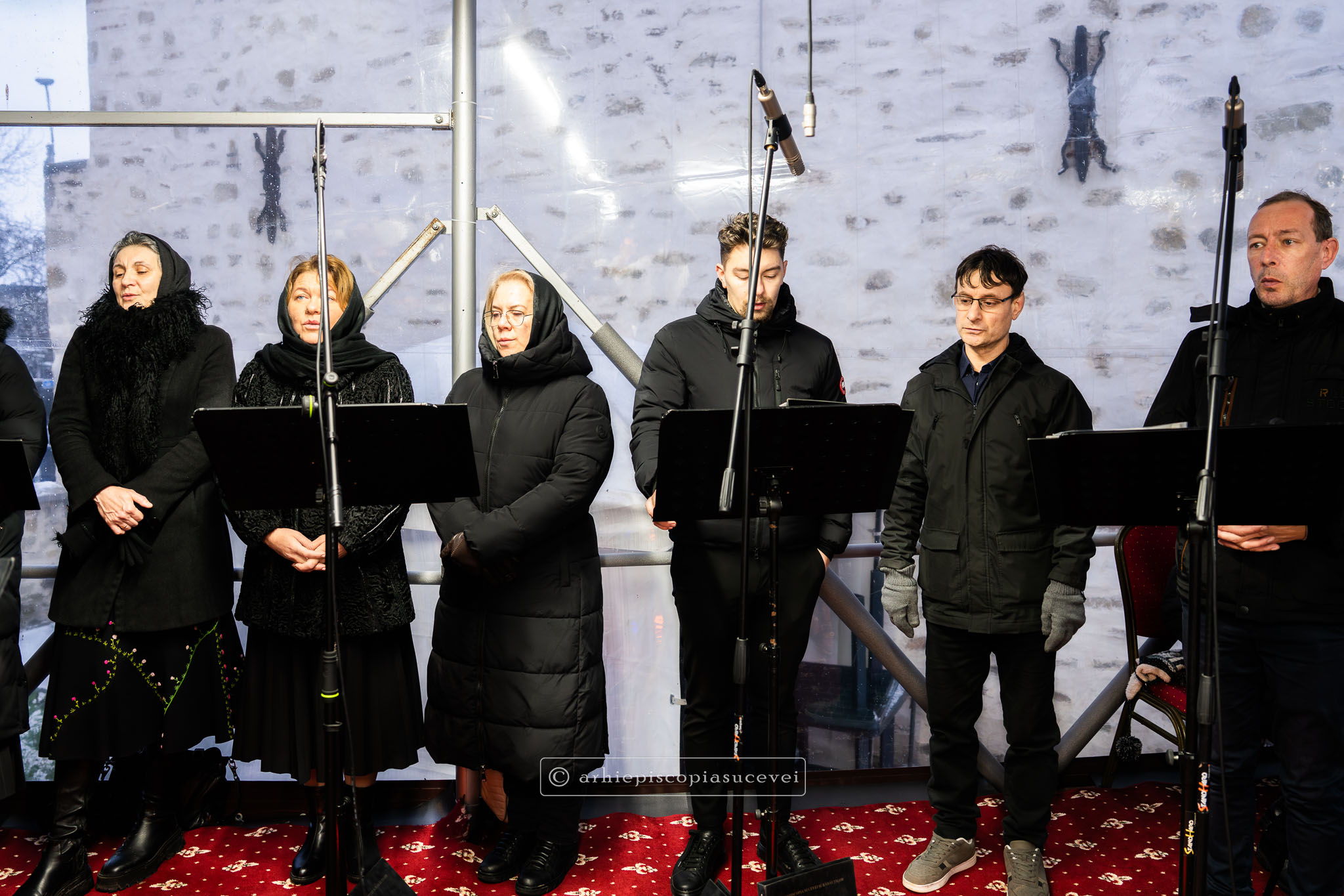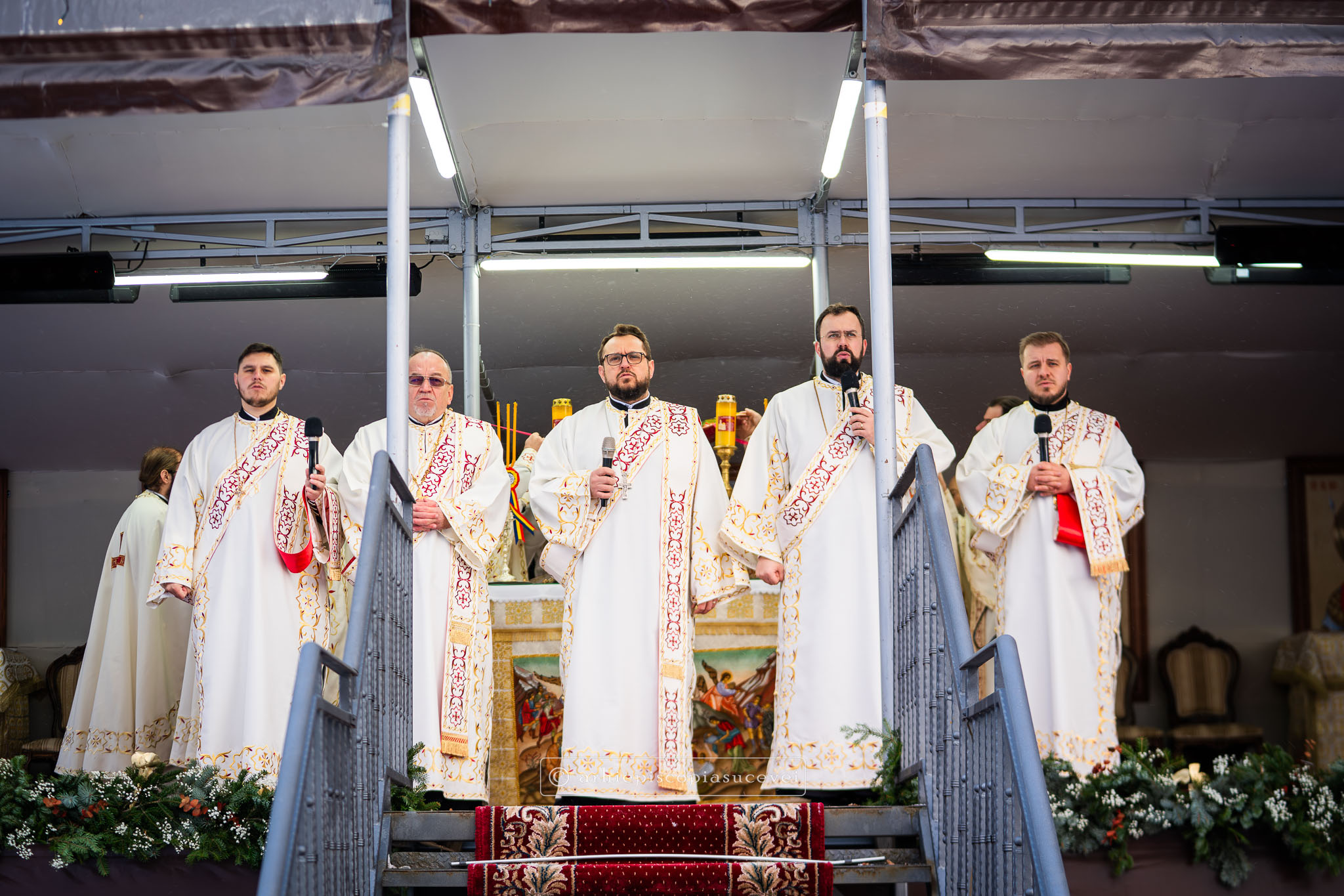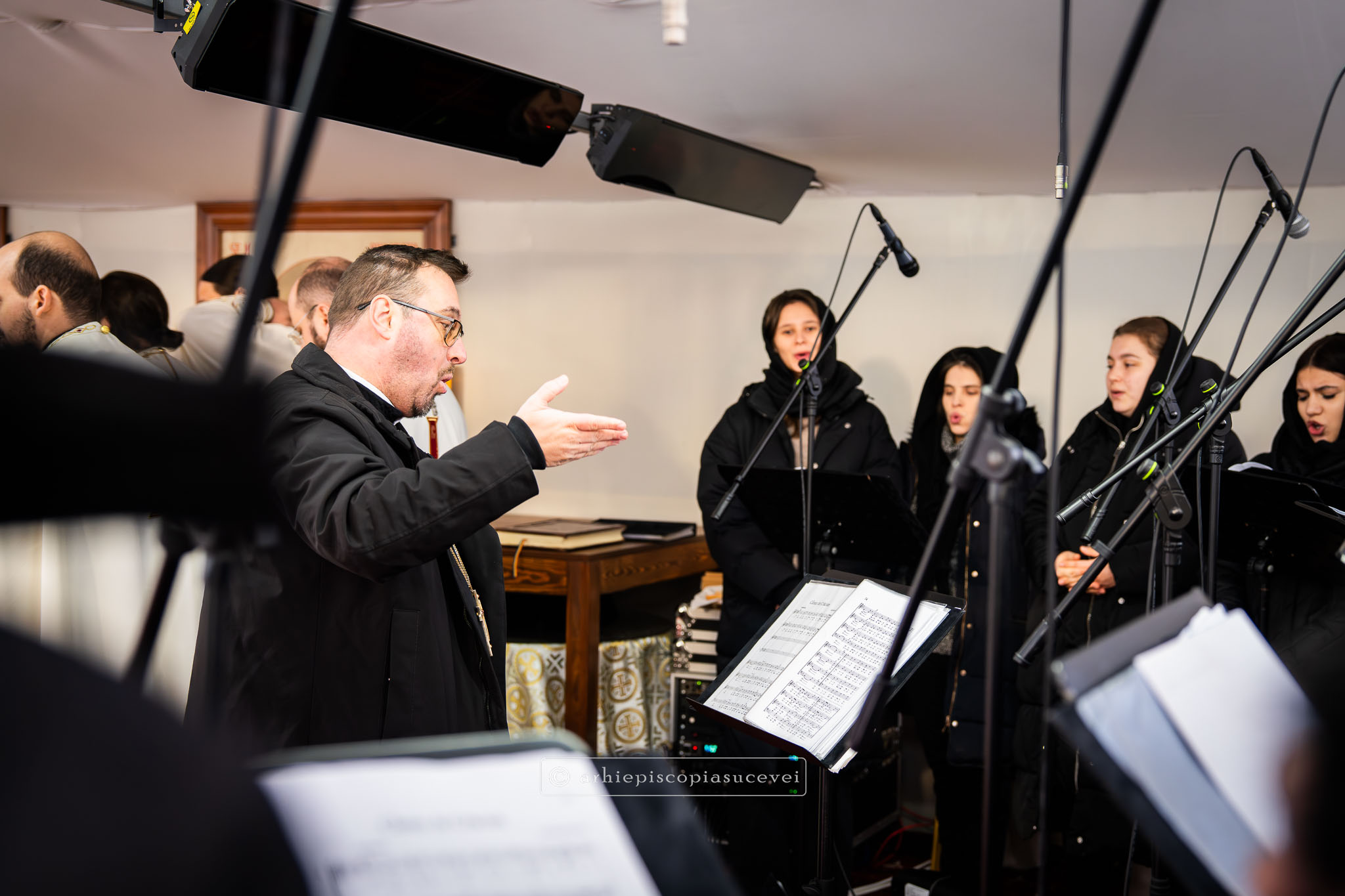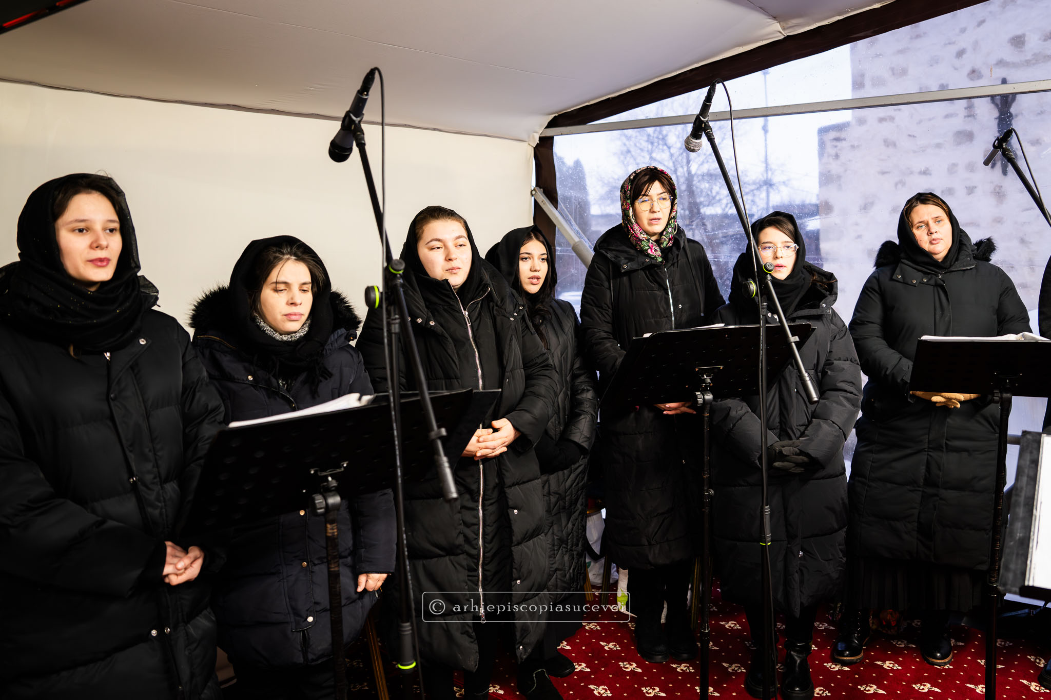 Răspunsurile liturgice au fost oferite de Corala mixtă „Sfântul Ioan cel Nou” a Catedralei Arhiepiscopale, dirijată de părintele Lucian-Ionuț Tablan Popescu, care la momentul Chinonicului a interpretat mai multe colinde românești prin care au vestit Nașterea Pruncului Iisus.