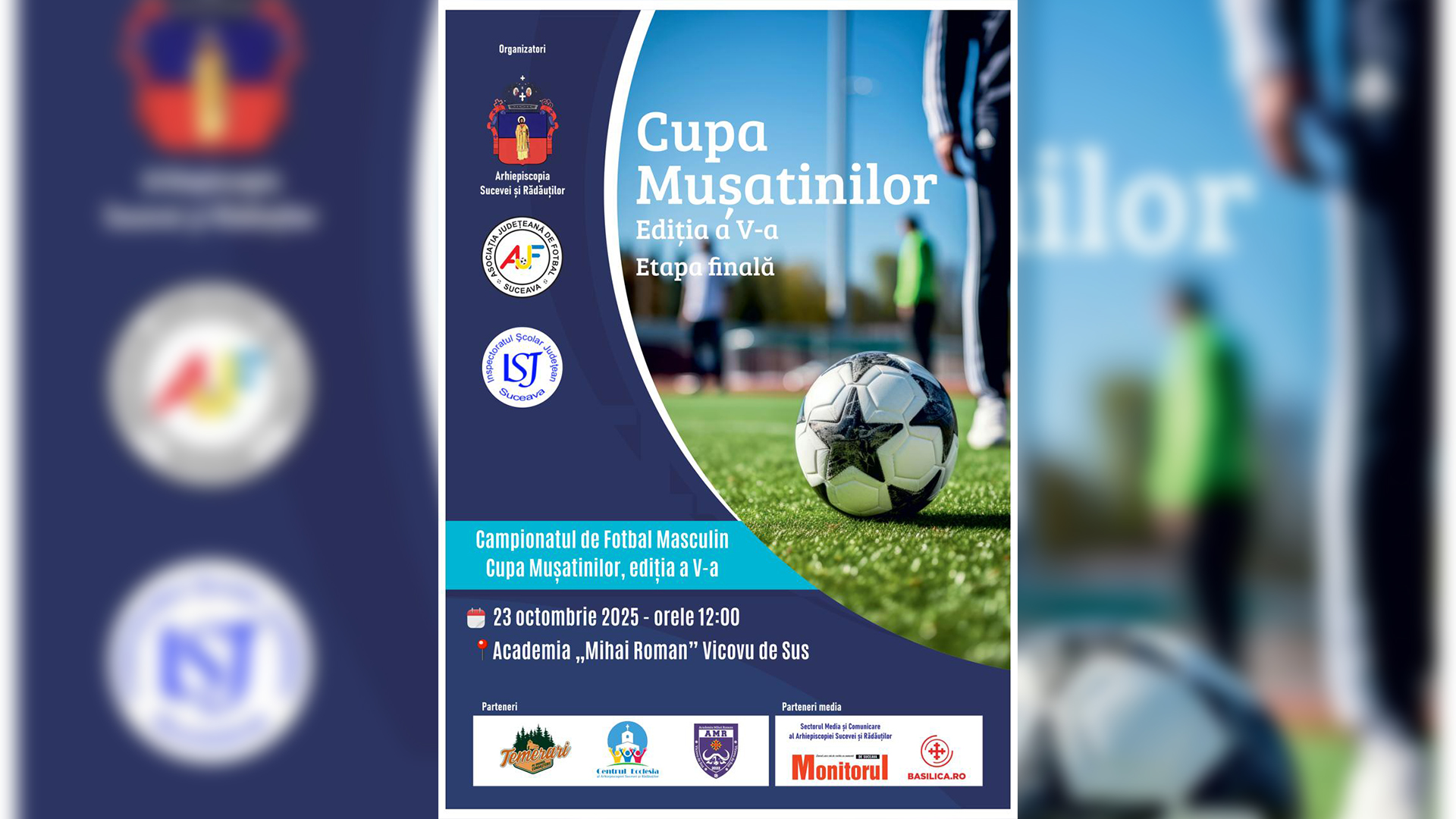 Cu binecuvântarea Înaltpreasfințitului Părinte Calinic, Arhiepiscop al Sucevei și Rădăuților, Departamentul Activități de tineret ATOS și tabere al Sectorului Catehizare, tineret și educație pentru viață în parteneriat cu Inspectoratul Școlar Județean, Suceava (ISJ Suceava) și Asociația Județeană de Fotbal, Suceava (AJF Suceava) organizează joi, 23 octombrie 2025, începând cu orele 12:00, Campionatul de fotbal masculin „Cupa Mușatinilor”.