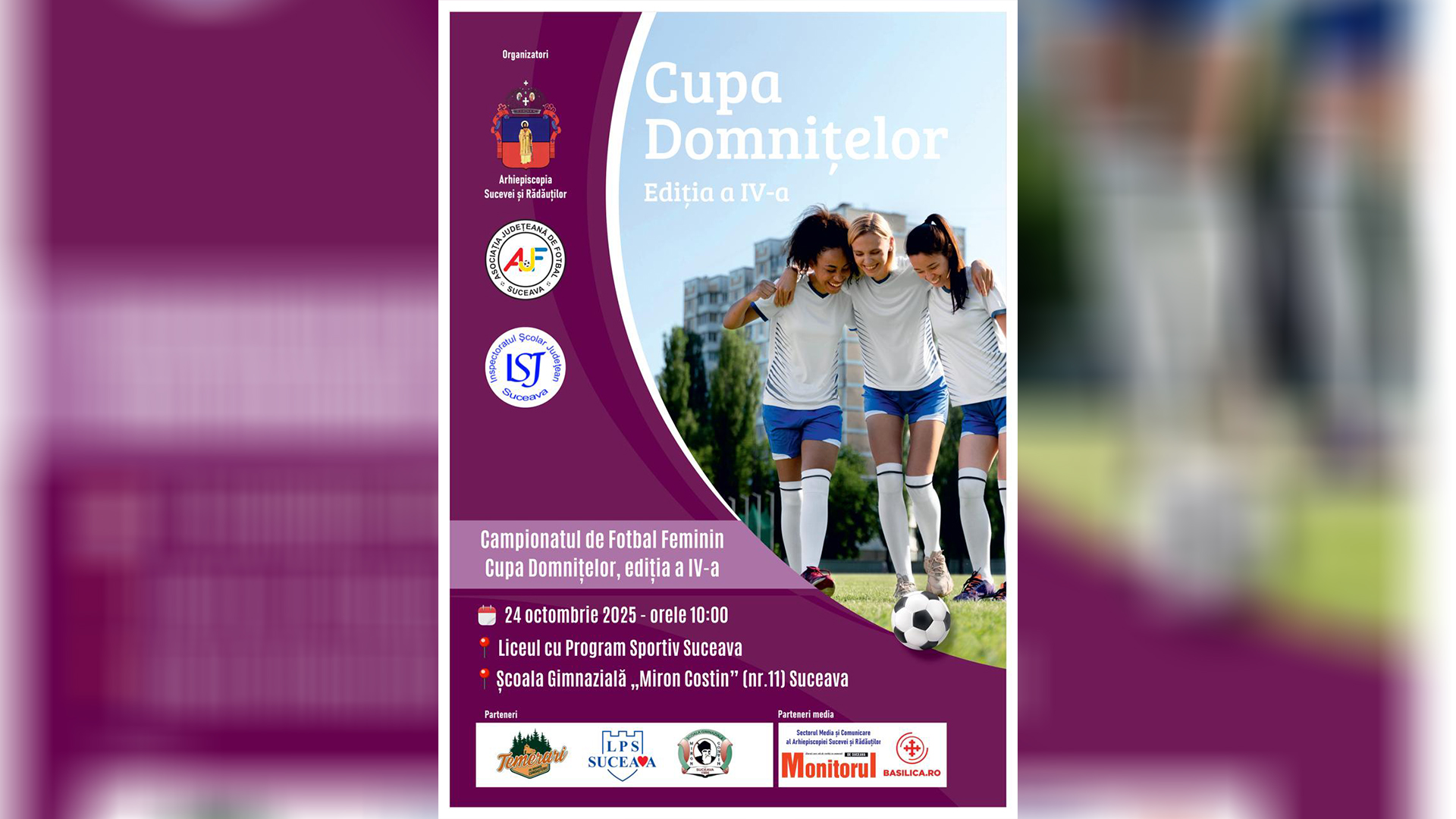 Cu binecuvântarea Înaltpreasfințitului Părinte Calinic, Arhiepiscop al Sucevei și Rădăuților, Departamentul Activități de tineret ATOS și tabere al Sectorului Catehizare, tineret și educație pentru viață în parteneriat cu Inspectoratul Școlar Județean, Suceava (ISJ Suceava) și Asociația Județeană de Fotbal, Suceava (AJF Suceava) organizează vineri, 24 octombrie 2025, începând cu orele 10:00, Campionatul de fotbal feminin „Cupa Domnițelor”.