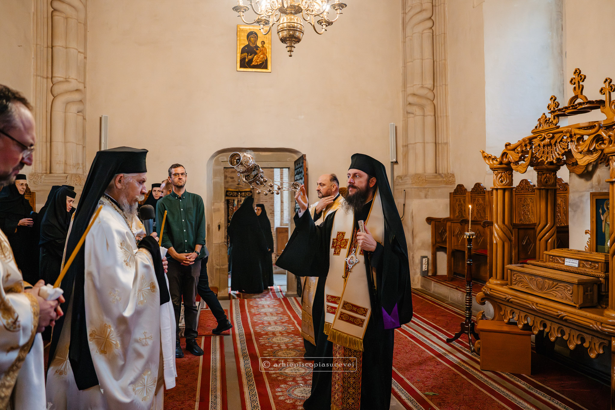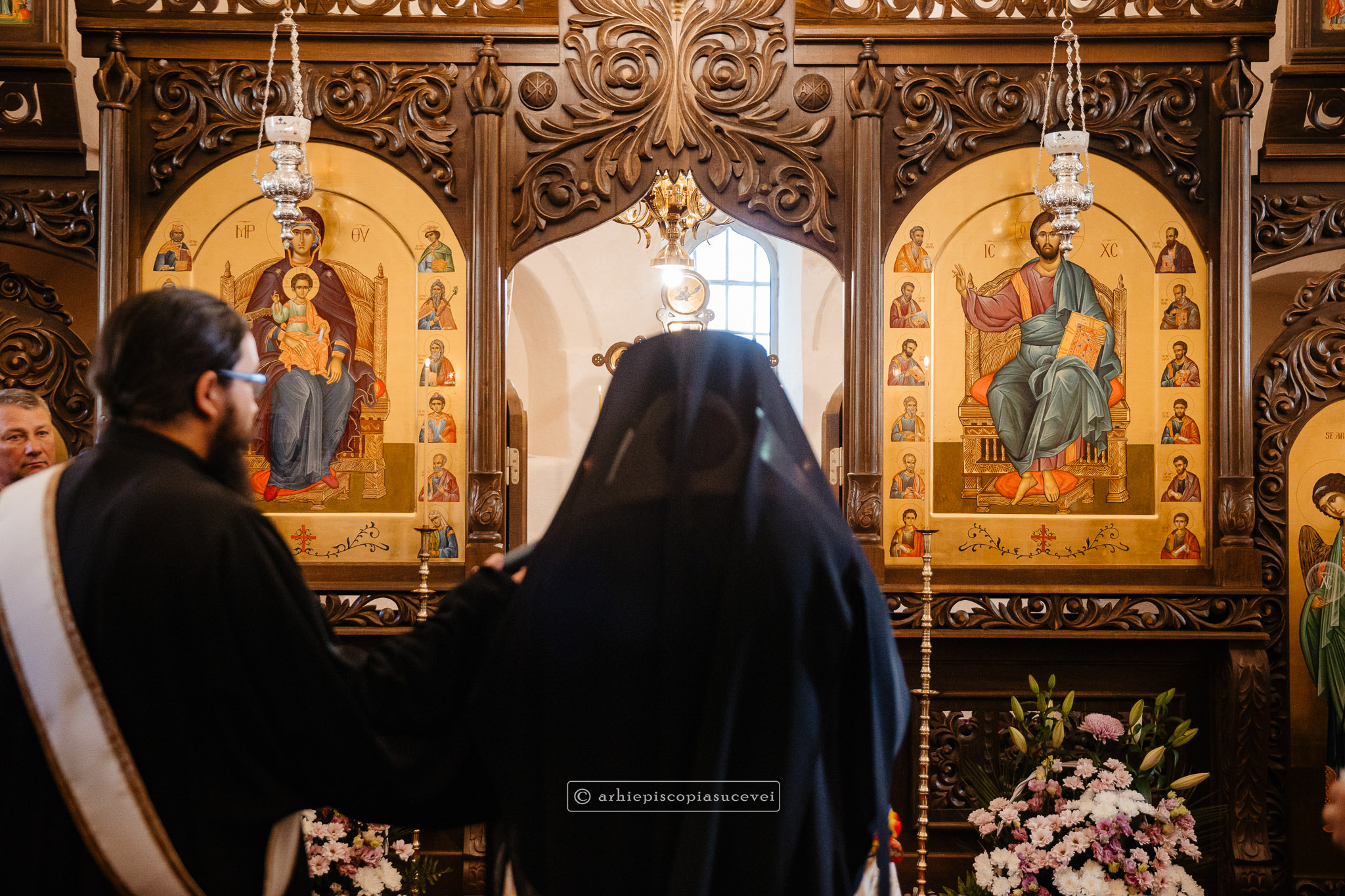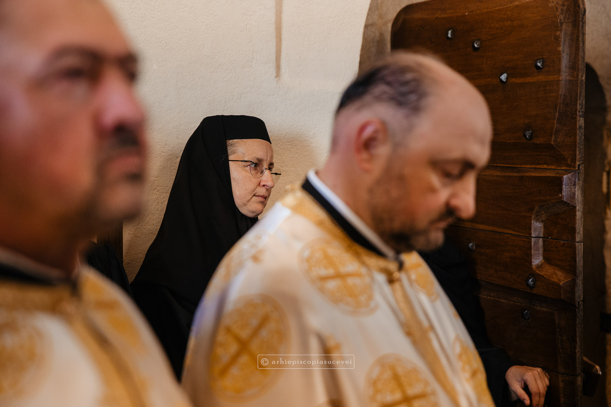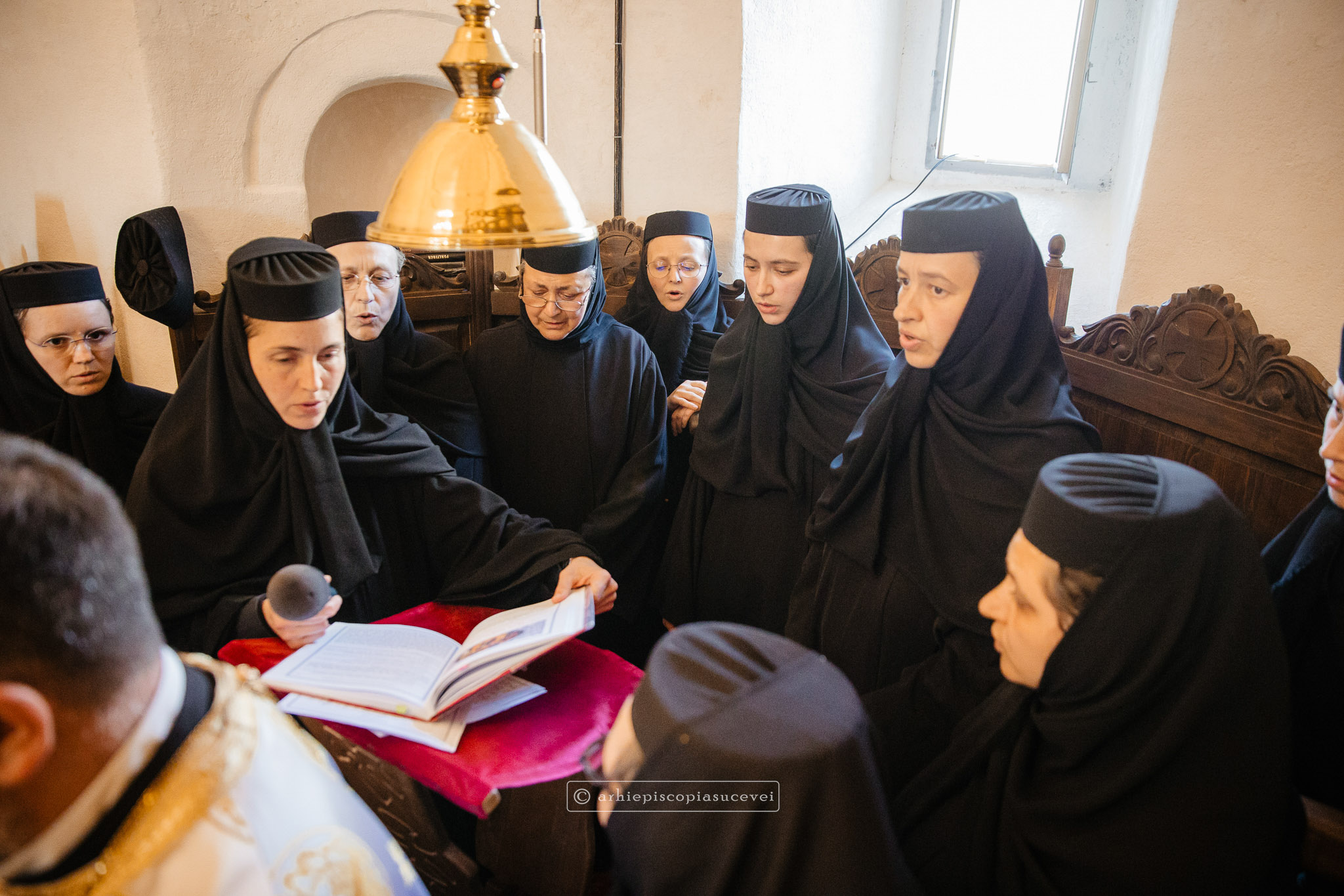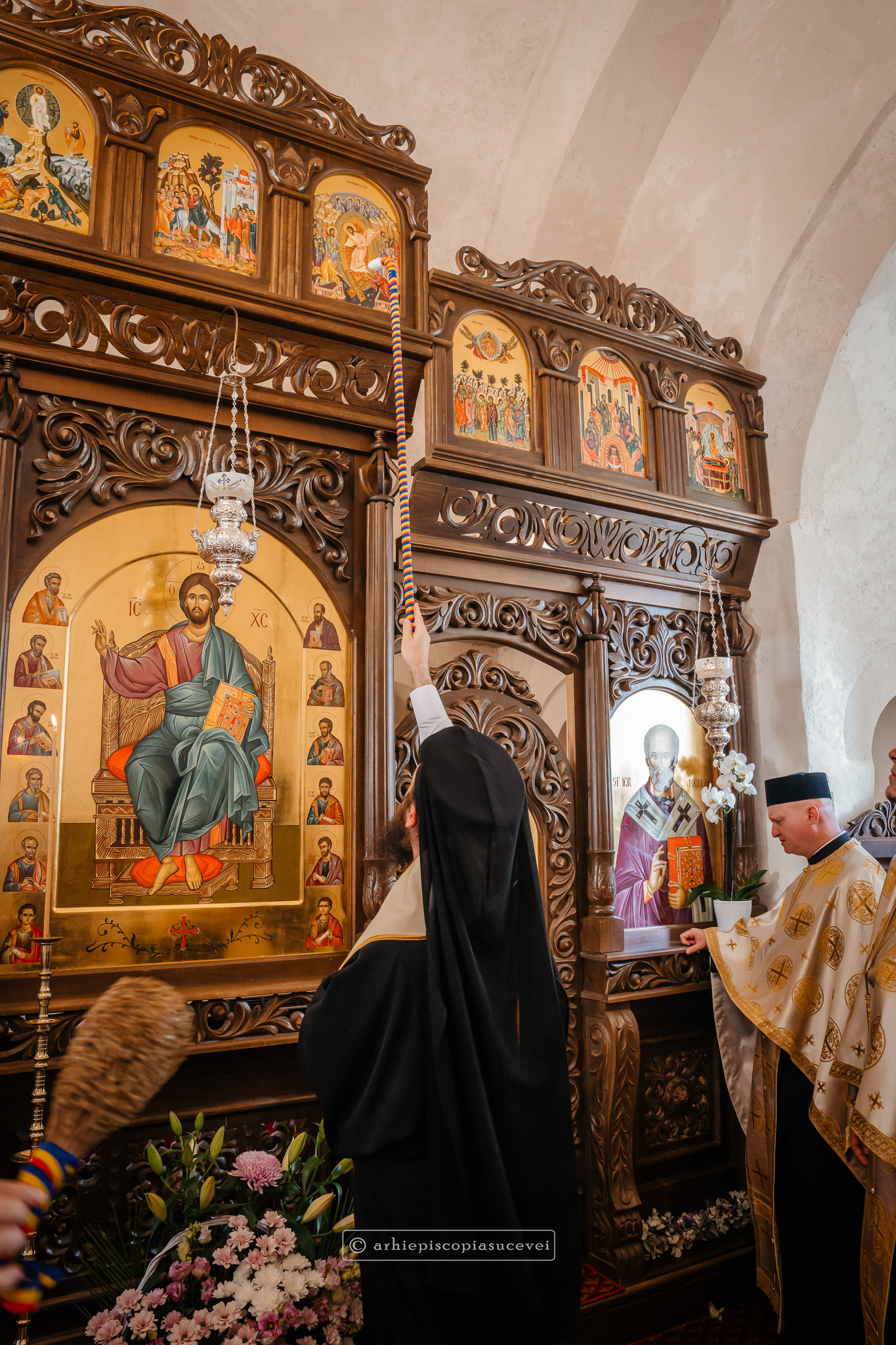 Slujba de târnosire a fost săvârșită de Preasfințitul Damaschin Dorneanul, Episcop-Vicar al Arhiepiscopiei Sucevei și Rădăuților, înconjurat de un sobor de preoți, sub protia pr. Doru-Ionel Budeanu, protoiereu al Protopopiatului Suceava I, din care au făcut parte clerici de la Centrul Eparhial Suceava, precum și invitați ai maicii starețe, stavrofora Maria Magdalena Gherghina. Lor li s-au alăturat monahiile care se vor odihni aici duhovnicește, la ceas de Laudă bisericească ori de Liturghie, unind rucodelia zilei cu rugăciunea către Dumnezeu, precum și oaspeți eleni, între care arhim. Kallinikos Georgakopoulos, vicar administrativ al Mitropoliei Dimitriadelor, Grecia. La momentul îndătinat din slujbă, icoanele de pe catapeteasma sfântului lăcaș au fost binecuvântate prin stropirea cu apă sfințită și ungerea cu Sfântul și Marele Mir.