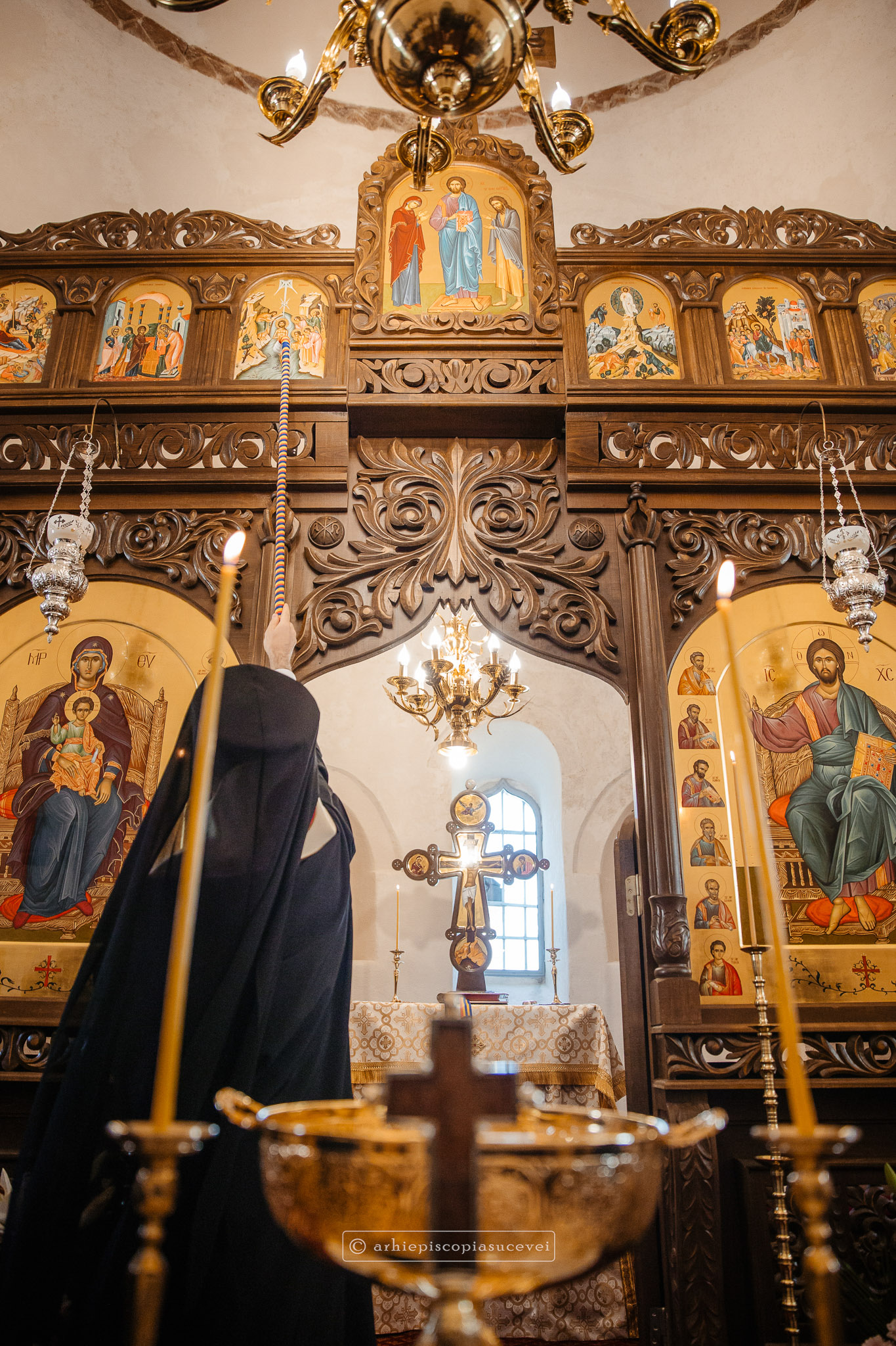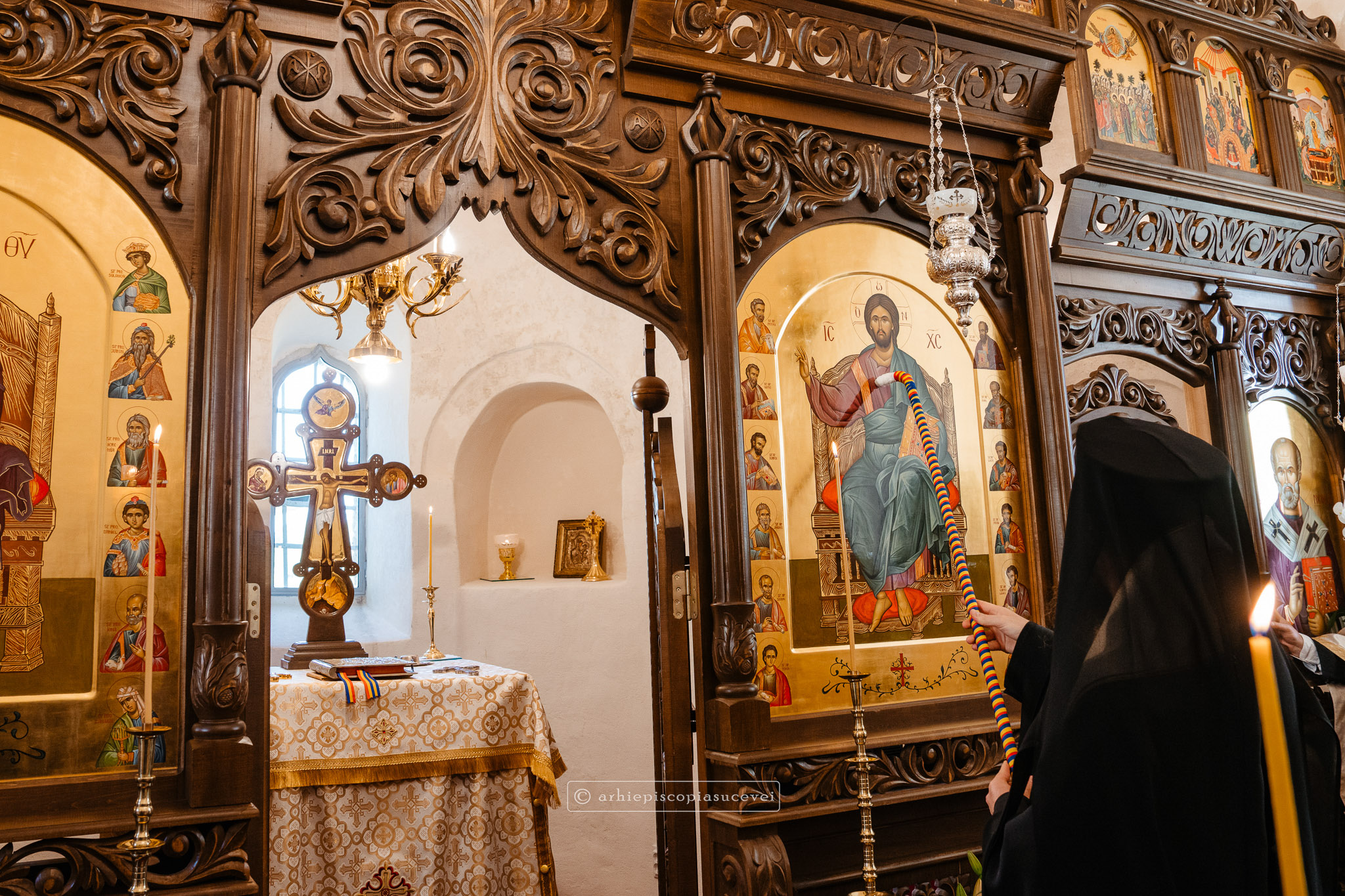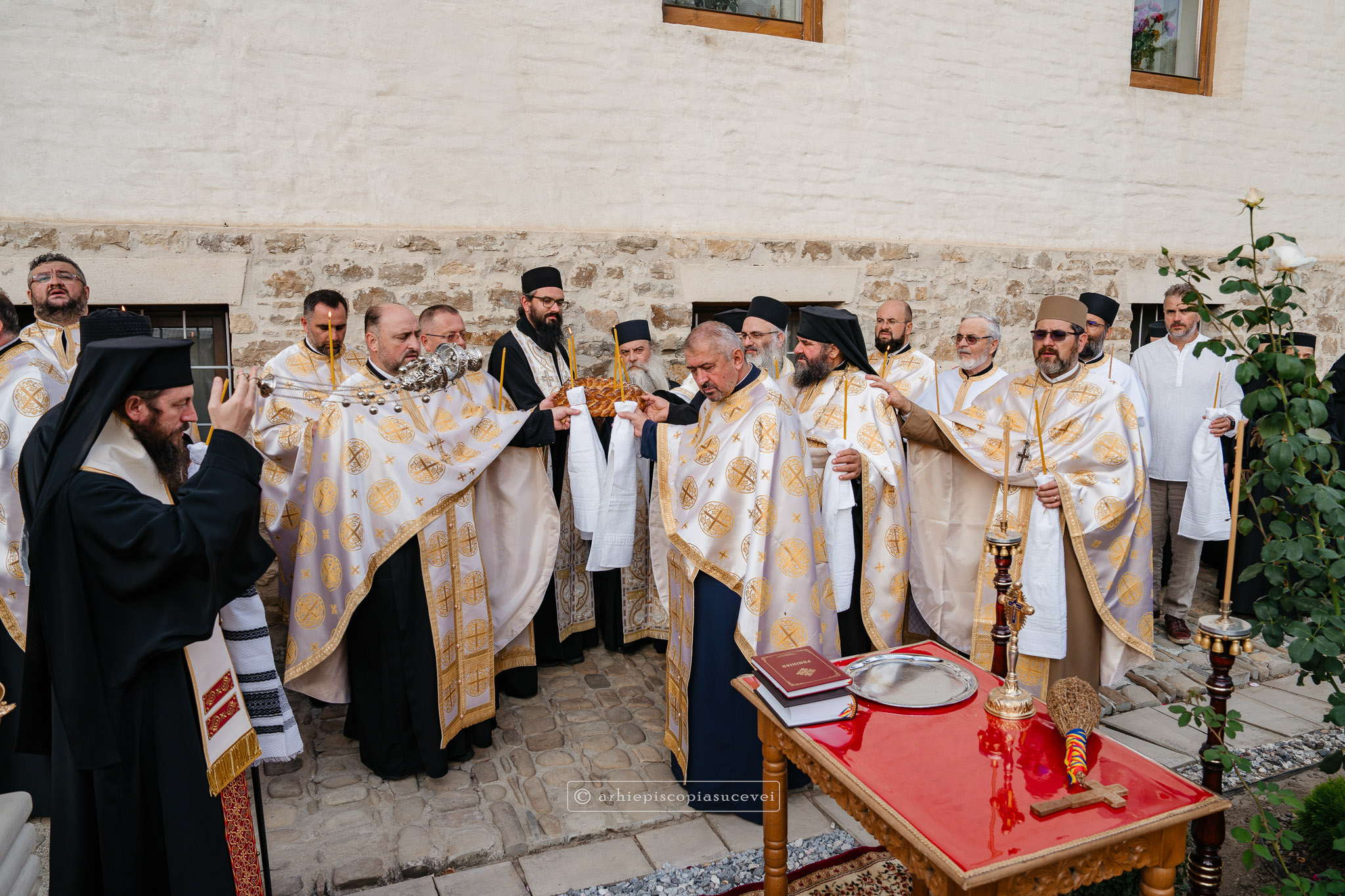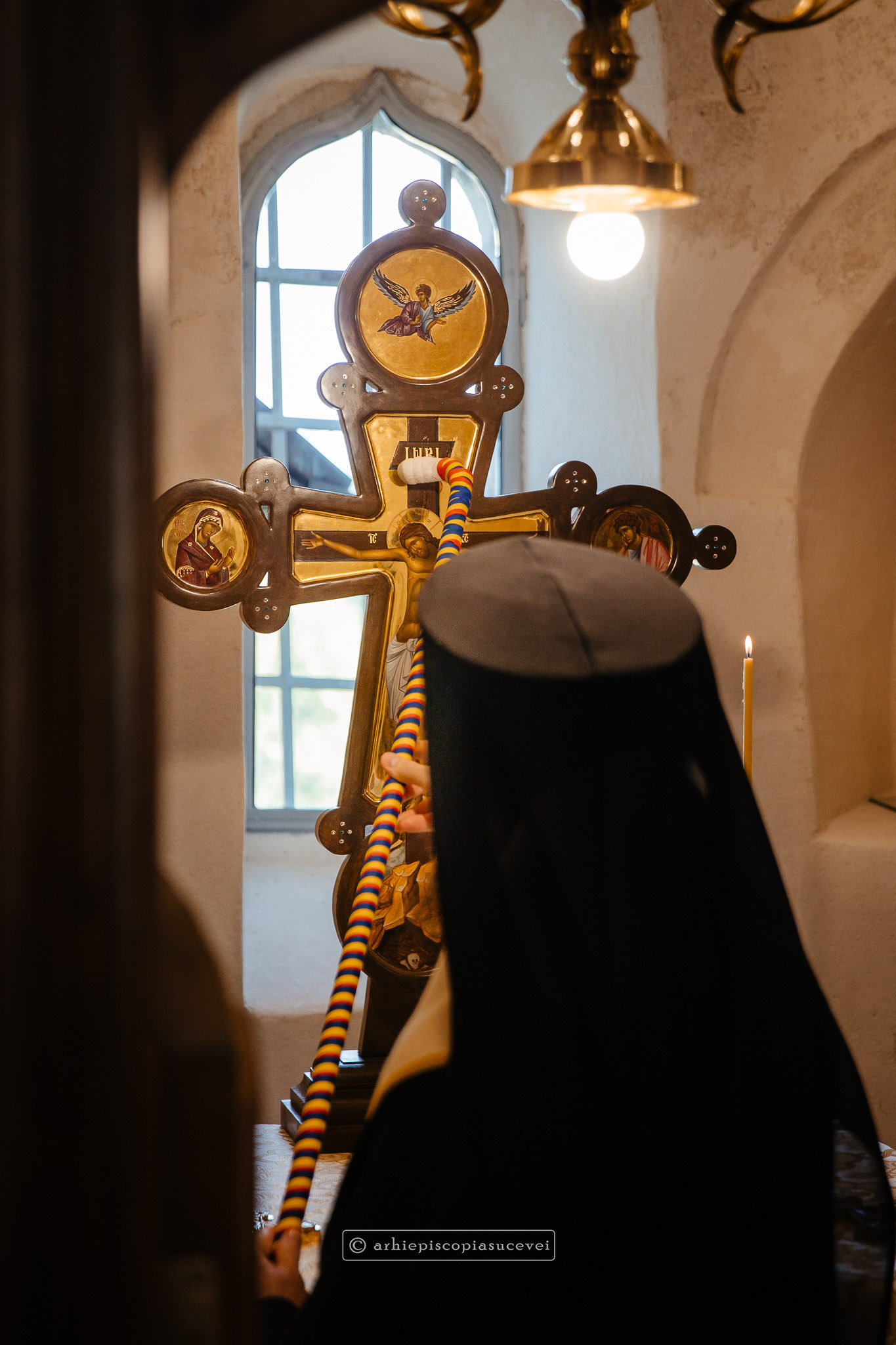 Slujba de târnosire a fost săvârșită de Preasfințitul Damaschin Dorneanul, Episcop-Vicar al Arhiepiscopiei Sucevei și Rădăuților, înconjurat de un sobor de preoți, sub protia pr. Doru-Ionel Budeanu, protoiereu al Protopopiatului Suceava I, din care au făcut parte clerici de la Centrul Eparhial Suceava, precum și invitați ai maicii starețe, stavrofora Maria Magdalena Gherghina. Lor li s-au alăturat monahiile care se vor odihni aici duhovnicește, la ceas de Laudă bisericească ori de Liturghie, unind rucodelia zilei cu rugăciunea către Dumnezeu, precum și oaspeți eleni, între care arhim. Kallinikos Georgakopoulos, vicar administrativ al Mitropoliei Dimitriadelor, Grecia. La momentul îndătinat din slujbă, icoanele de pe catapeteasma sfântului lăcaș au fost binecuvântate prin stropirea cu apă sfințită și ungerea cu Sfântul și Marele Mir.