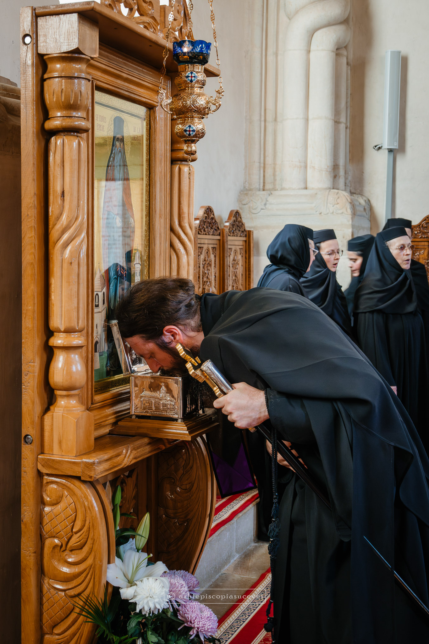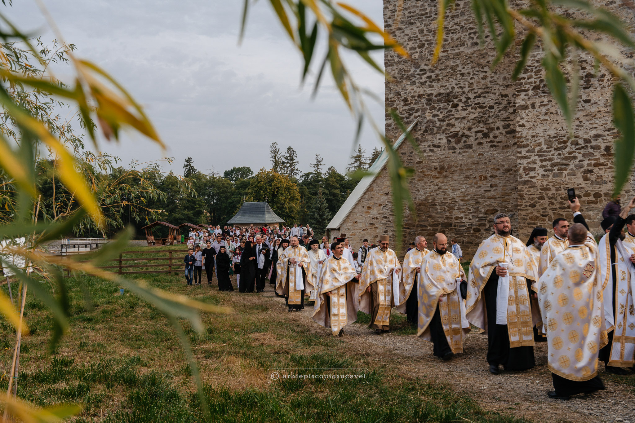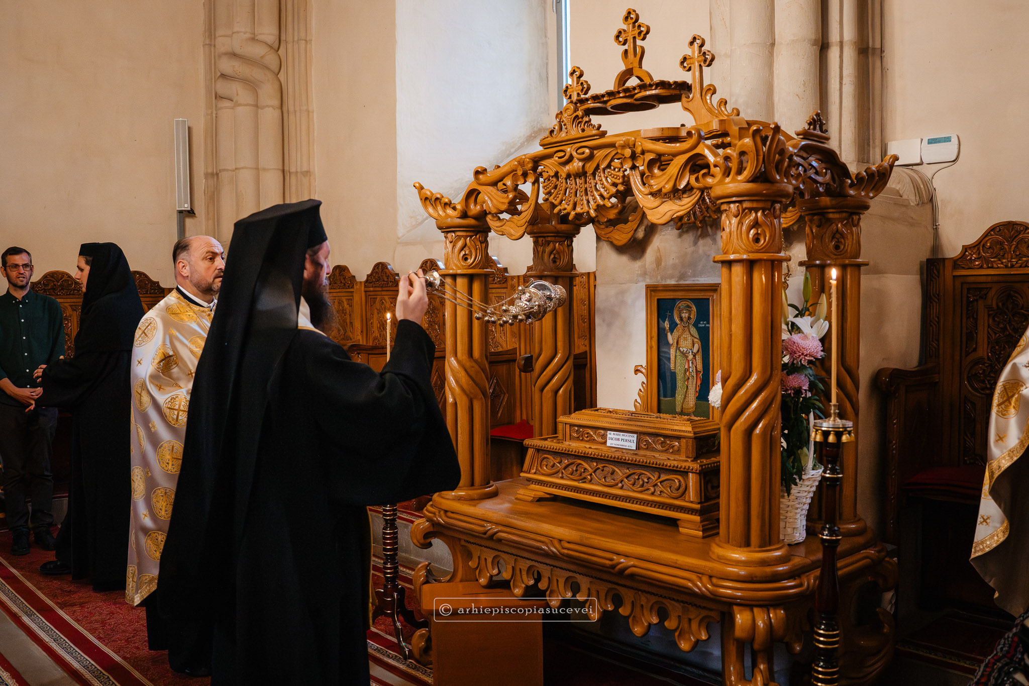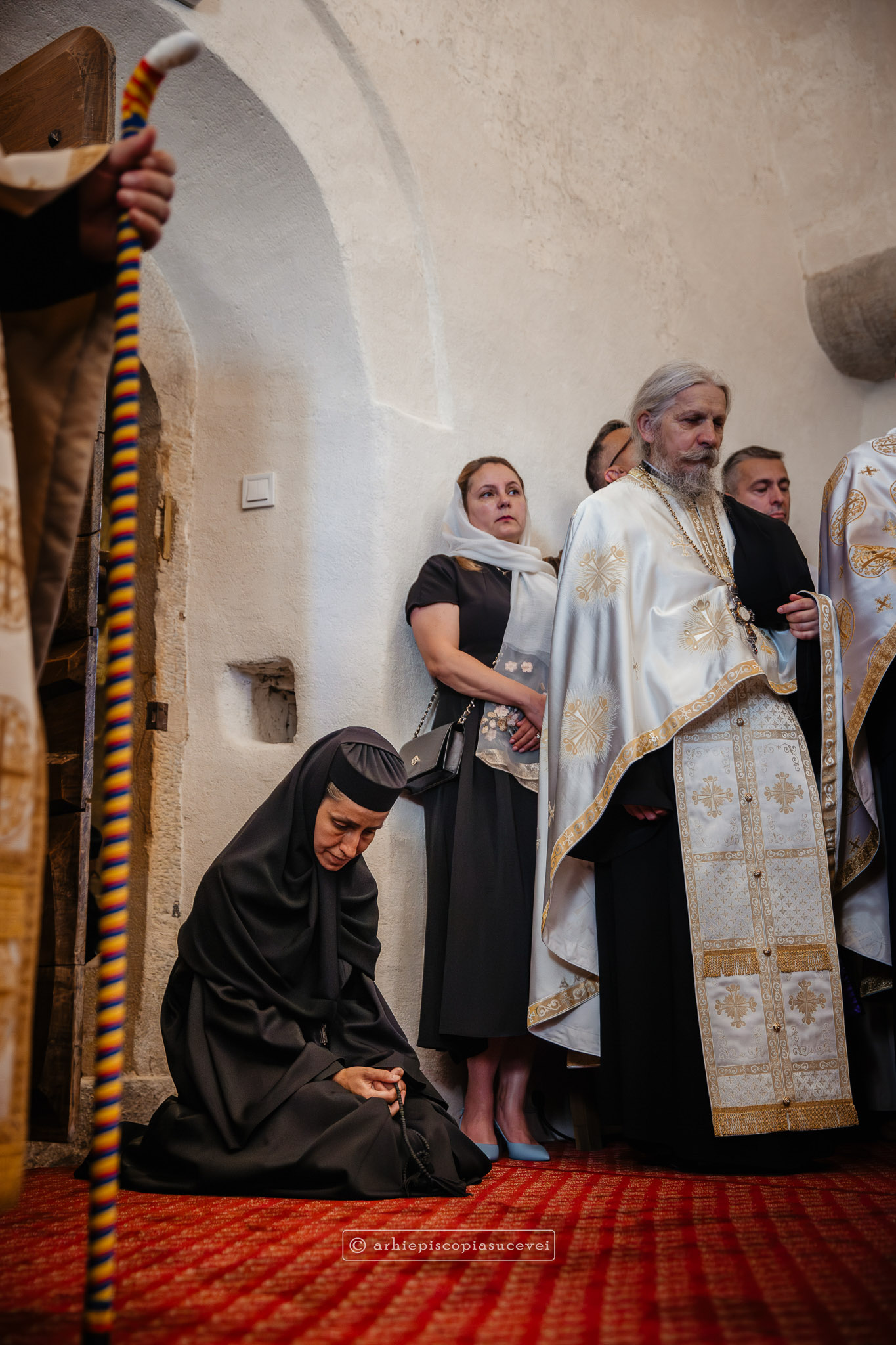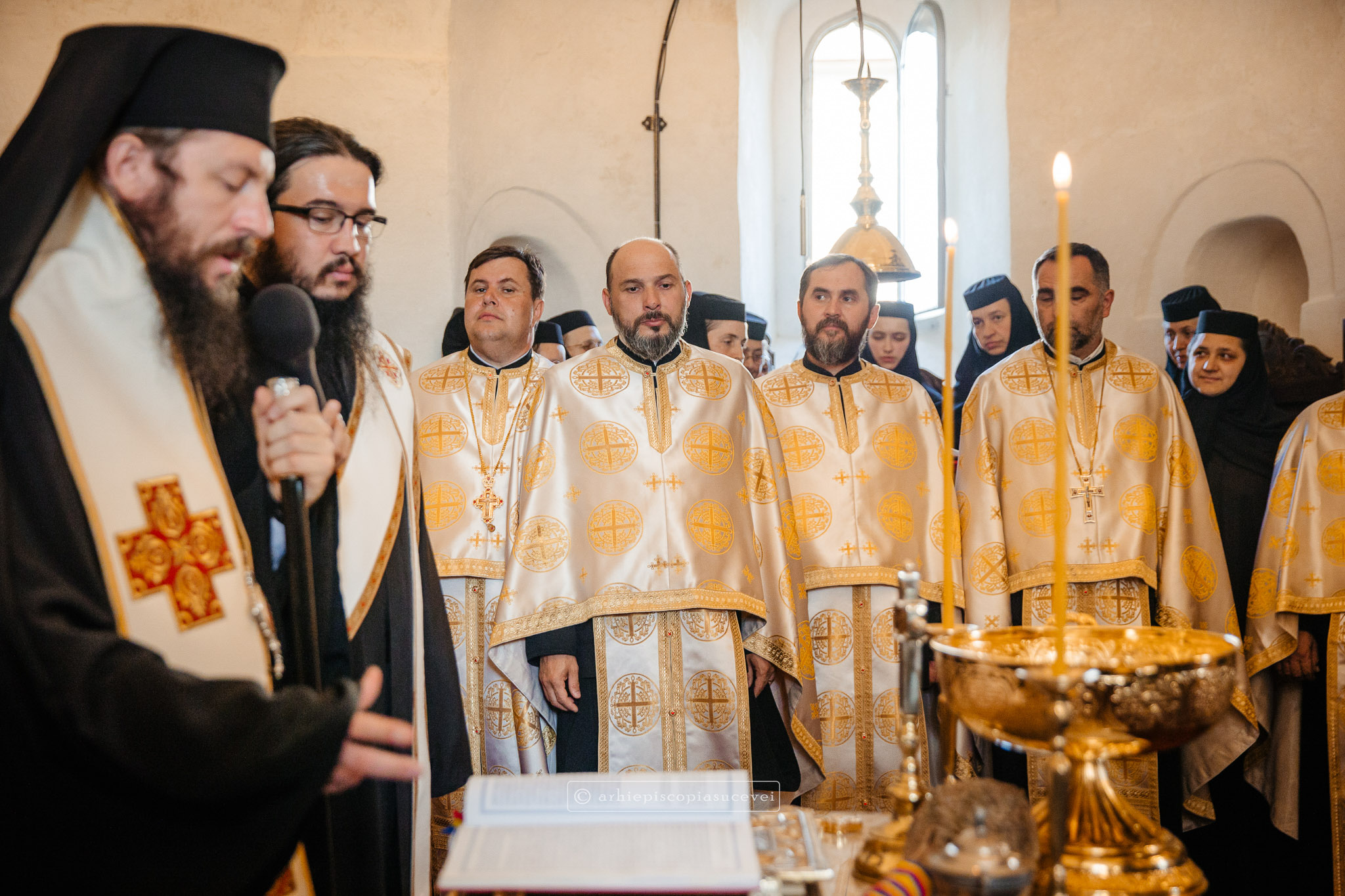 Slujba de târnosire a fost săvârșită de Preasfințitul Damaschin Dorneanul, Episcop-Vicar al Arhiepiscopiei Sucevei și Rădăuților, înconjurat de un sobor de preoți, sub protia pr. Doru-Ionel Budeanu, protoiereu al Protopopiatului Suceava I, din care au făcut parte clerici de la Centrul Eparhial Suceava, precum și invitați ai maicii starețe, stavrofora Maria Magdalena Gherghina. Lor li s-au alăturat monahiile care se vor odihni aici duhovnicește, la ceas de Laudă bisericească ori de Liturghie, unind rucodelia zilei cu rugăciunea către Dumnezeu, precum și oaspeți eleni, între care arhim. Kallinikos Georgakopoulos, vicar administrativ al Mitropoliei Dimitriadelor, Grecia. La momentul îndătinat din slujbă, icoanele de pe catapeteasma sfântului lăcaș au fost binecuvântate prin stropirea cu apă sfințită și ungerea cu Sfântul și Marele Mir.