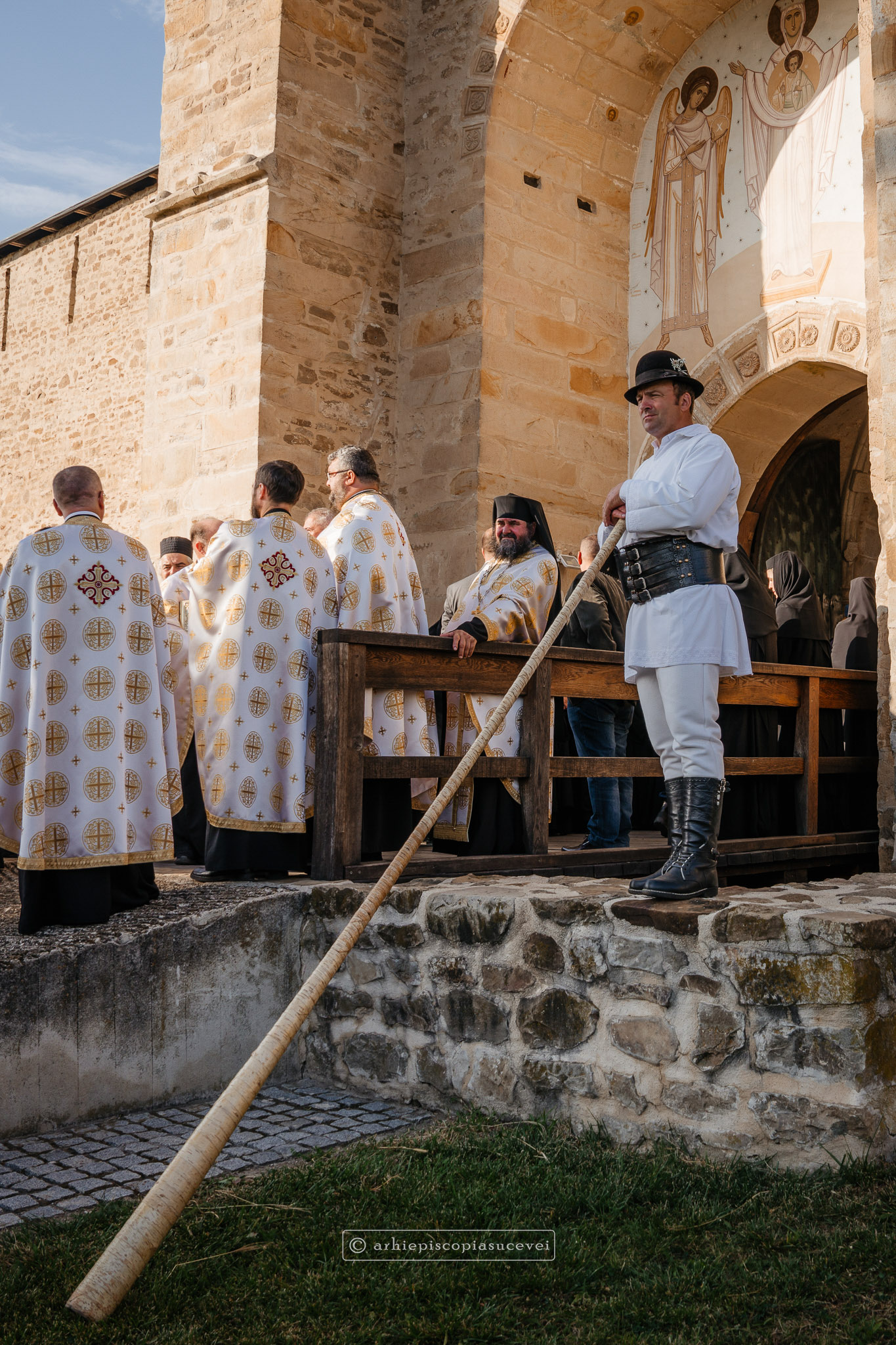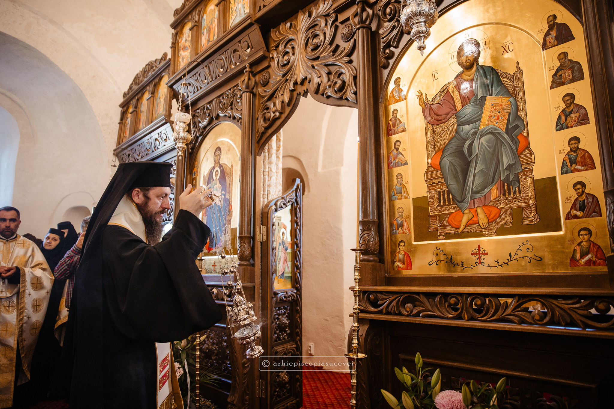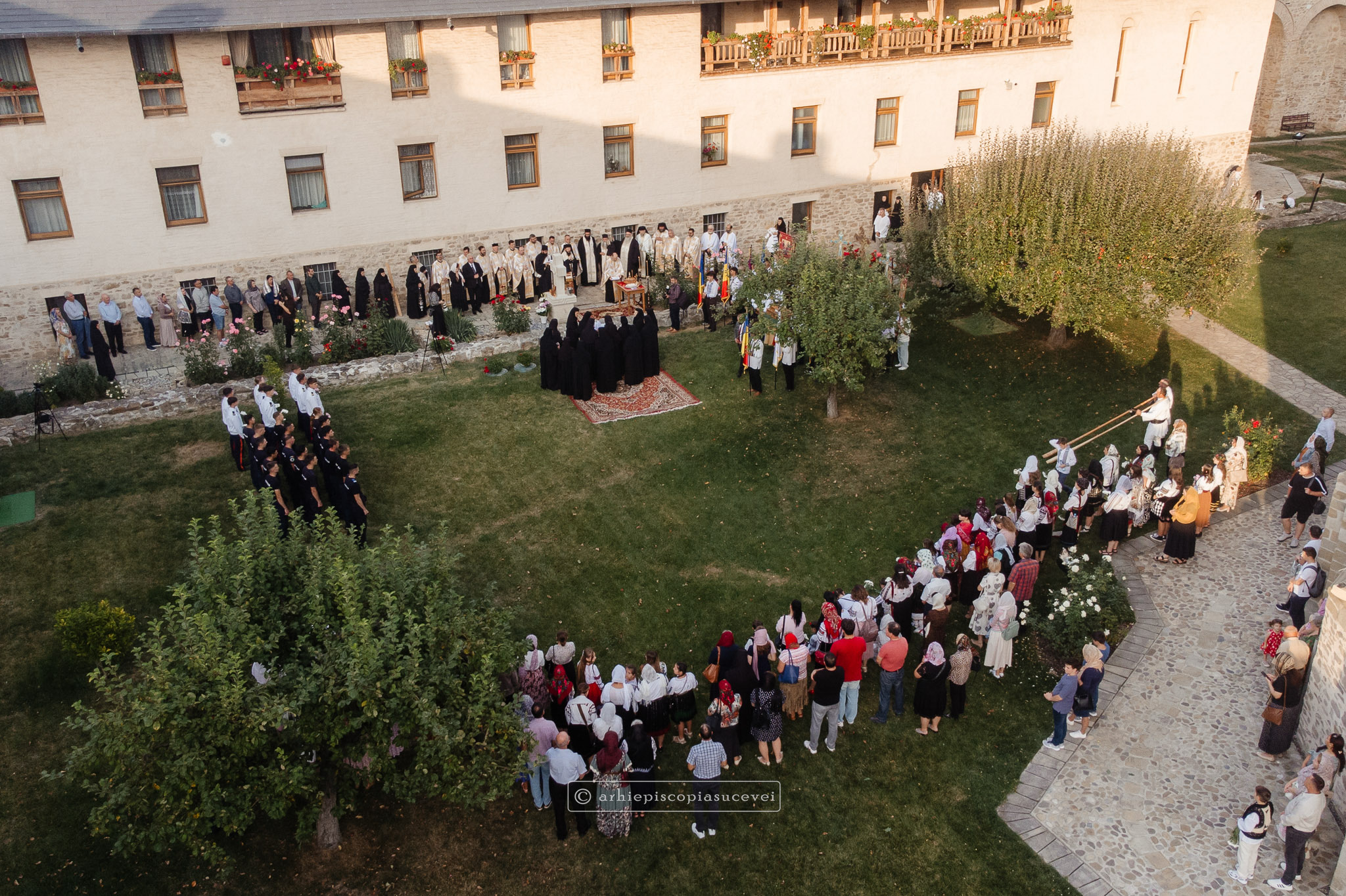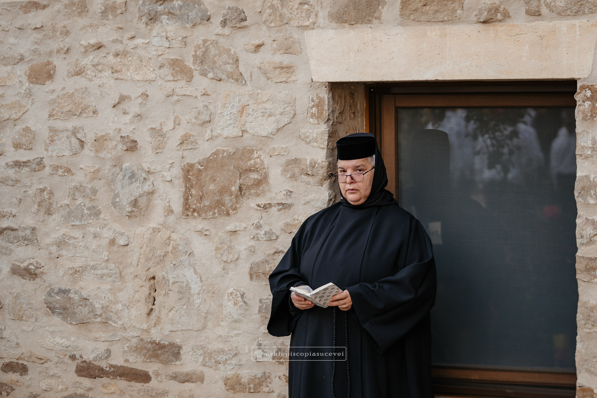 Slujba de târnosire a fost săvârșită de Preasfințitul Damaschin Dorneanul, Episcop-Vicar al Arhiepiscopiei Sucevei și Rădăuților, înconjurat de un sobor de preoți, sub protia pr. Doru-Ionel Budeanu, protoiereu al Protopopiatului Suceava I, din care au făcut parte clerici de la Centrul Eparhial Suceava, precum și invitați ai maicii starețe, stavrofora Maria Magdalena Gherghina. Lor li s-au alăturat monahiile care se vor odihni aici duhovnicește, la ceas de Laudă bisericească ori de Liturghie, unind rucodelia zilei cu rugăciunea către Dumnezeu, precum și oaspeți eleni, între care arhim. Kallinikos Georgakopoulos, vicar administrativ al Mitropoliei Dimitriadelor, Grecia. La momentul îndătinat din slujbă, icoanele de pe catapeteasma sfântului lăcaș au fost binecuvântate prin stropirea cu apă sfințită și ungerea cu Sfântul și Marele Mir.