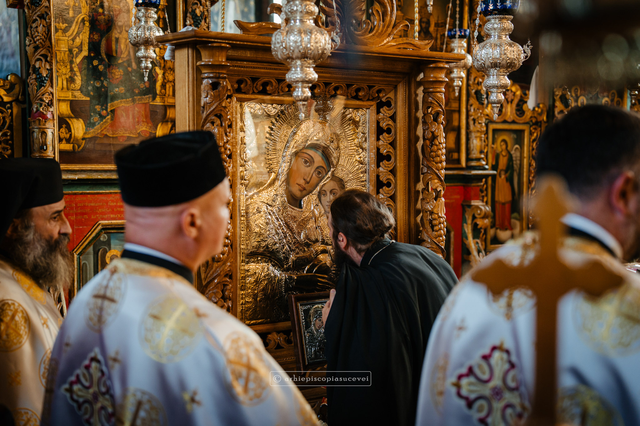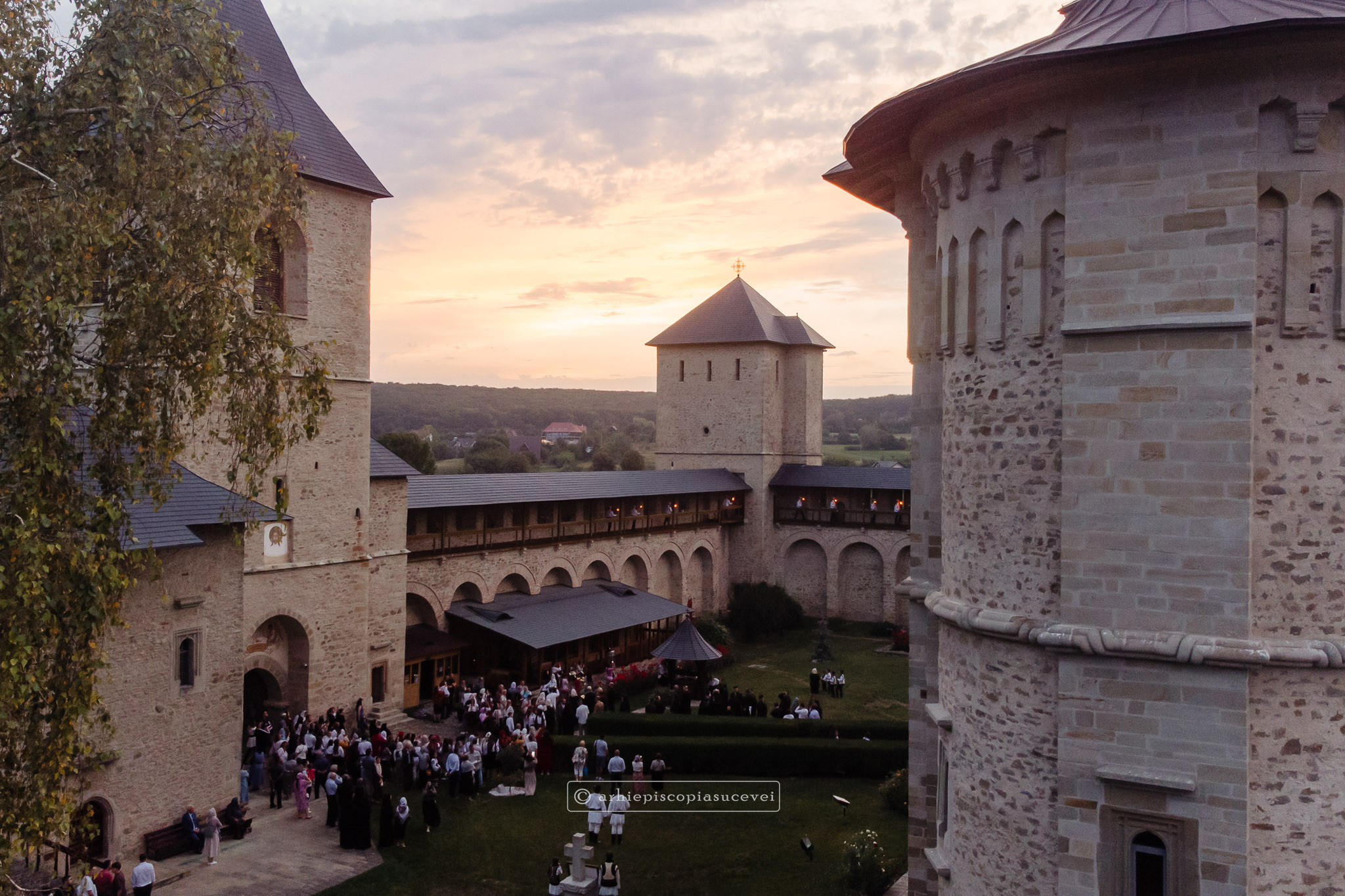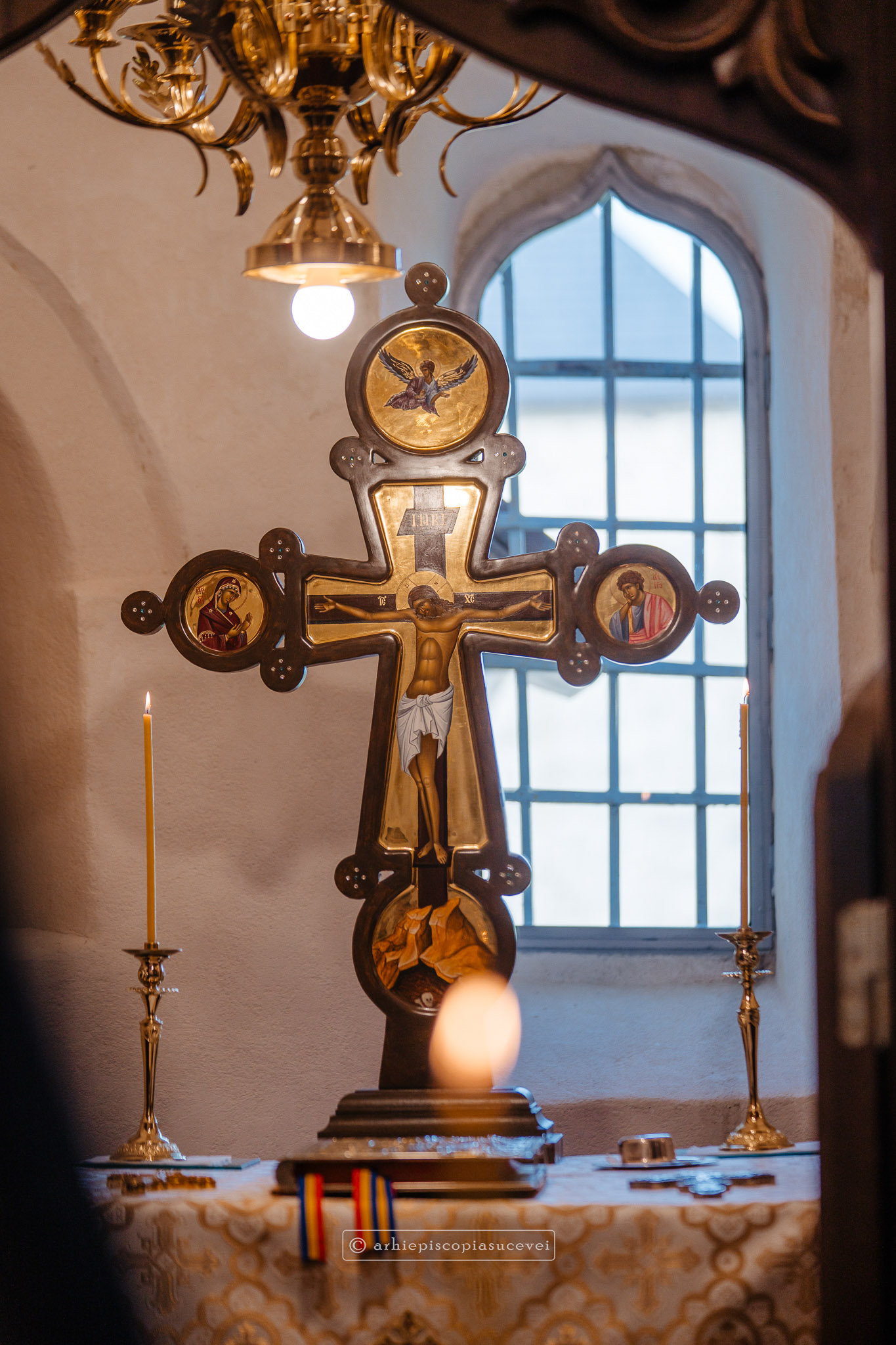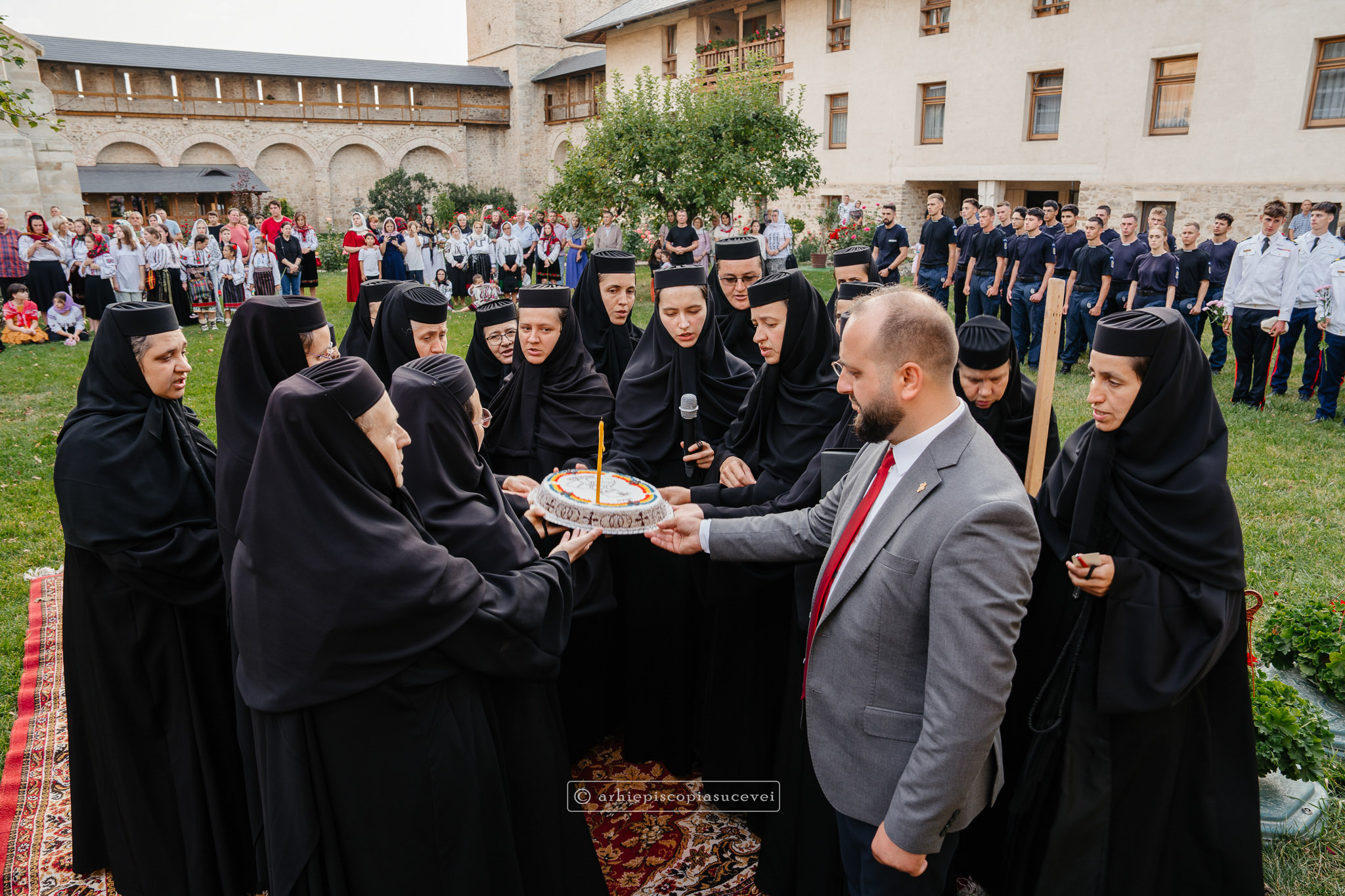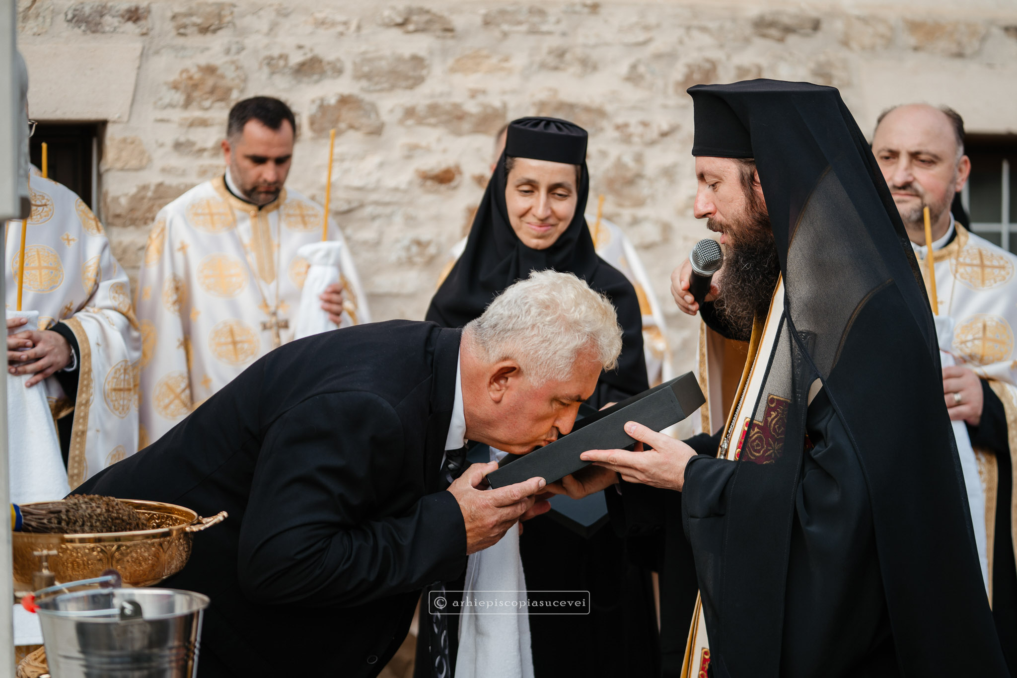 Slujba de târnosire a fost săvârșită de Preasfințitul Damaschin Dorneanul, Episcop-Vicar al Arhiepiscopiei Sucevei și Rădăuților, înconjurat de un sobor de preoți, sub protia pr. Doru-Ionel Budeanu, protoiereu al Protopopiatului Suceava I, din care au făcut parte clerici de la Centrul Eparhial Suceava, precum și invitați ai maicii starețe, stavrofora Maria Magdalena Gherghina. Lor li s-au alăturat monahiile care se vor odihni aici duhovnicește, la ceas de Laudă bisericească ori de Liturghie, unind rucodelia zilei cu rugăciunea către Dumnezeu, precum și oaspeți eleni, între care arhim. Kallinikos Georgakopoulos, vicar administrativ al Mitropoliei Dimitriadelor, Grecia. La momentul îndătinat din slujbă, icoanele de pe catapeteasma sfântului lăcaș au fost binecuvântate prin stropirea cu apă sfințită și ungerea cu Sfântul și Marele Mir.