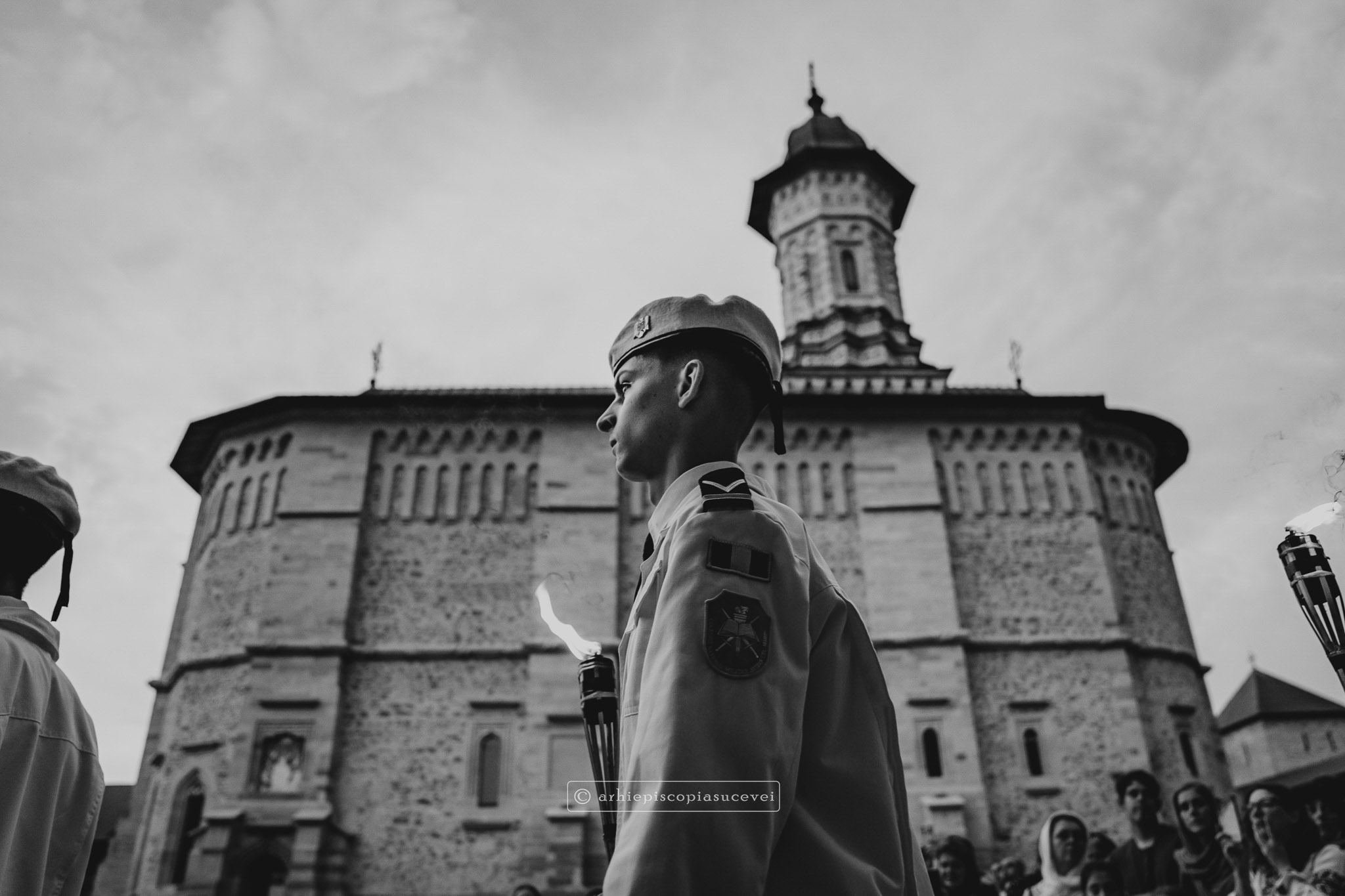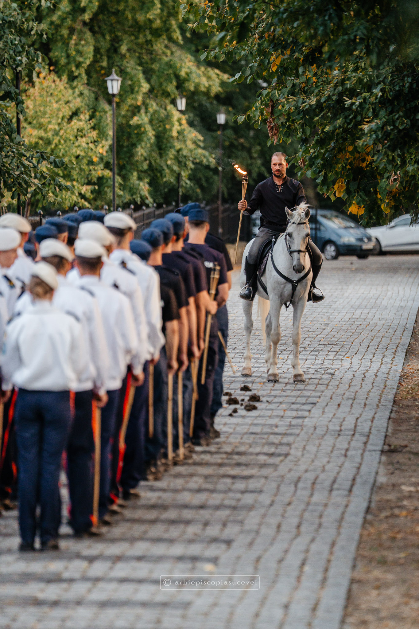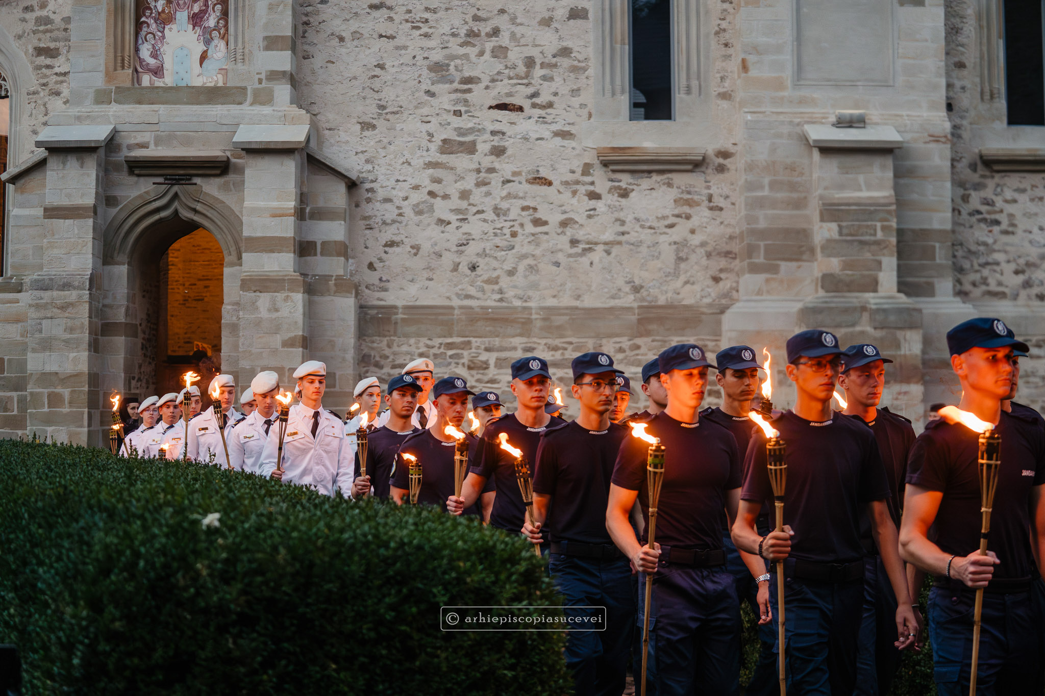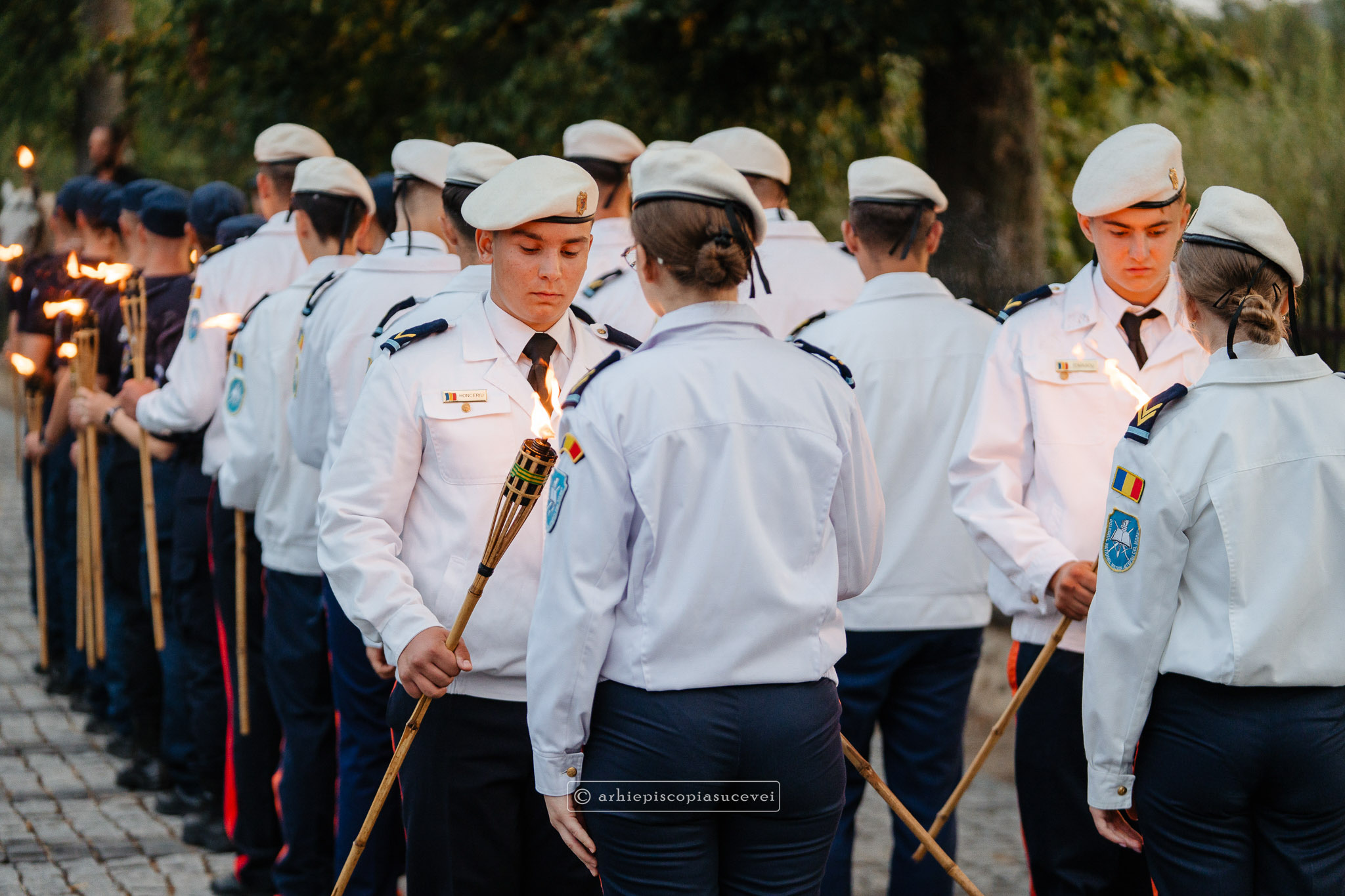 Seara s-a încheiat cu retragerea elevilor de la cele două școli militare cu torțe pe drumul de strajă al Cetății Dragomirnei, moment impresionant prin care au dorit să amintească atât de flacăra rugăciunii nestinse, cât și de vremurile de restriște, când mănăstirea a slujit drept adăpost pentru obște și căpeteniilor țării.