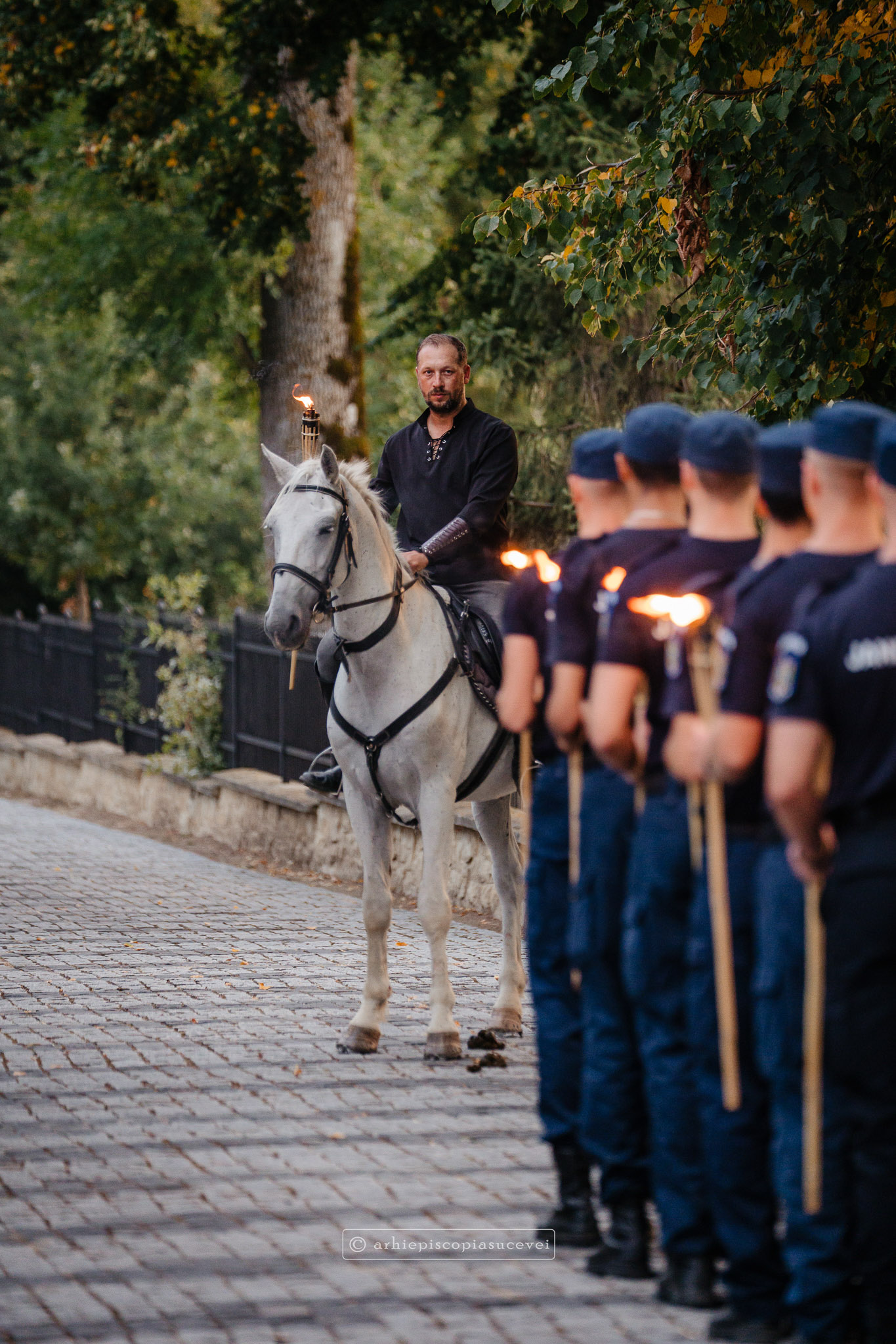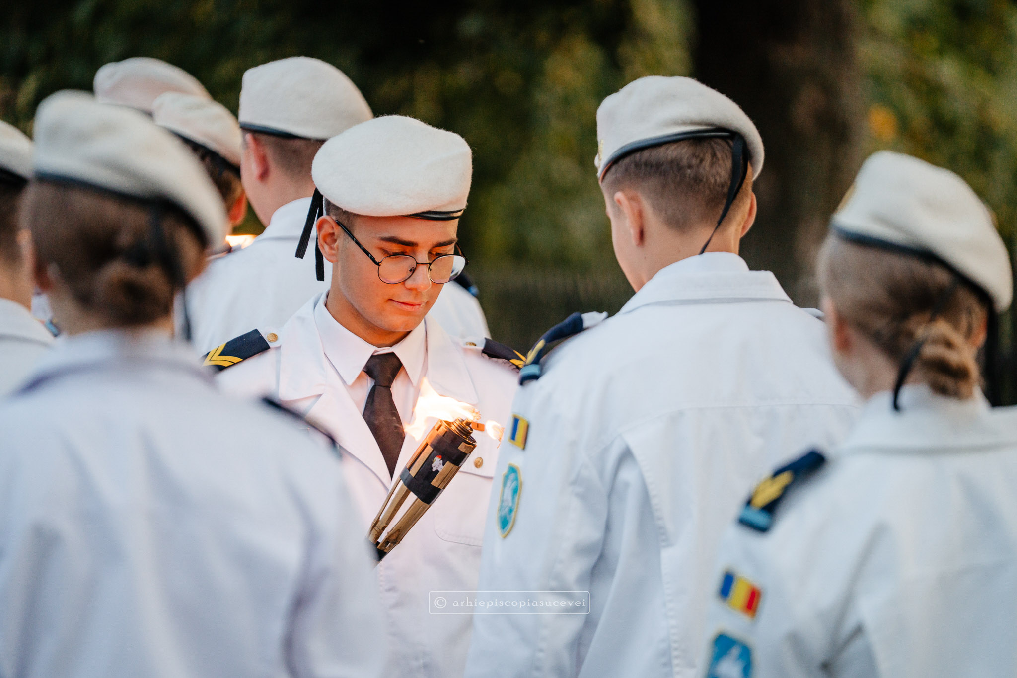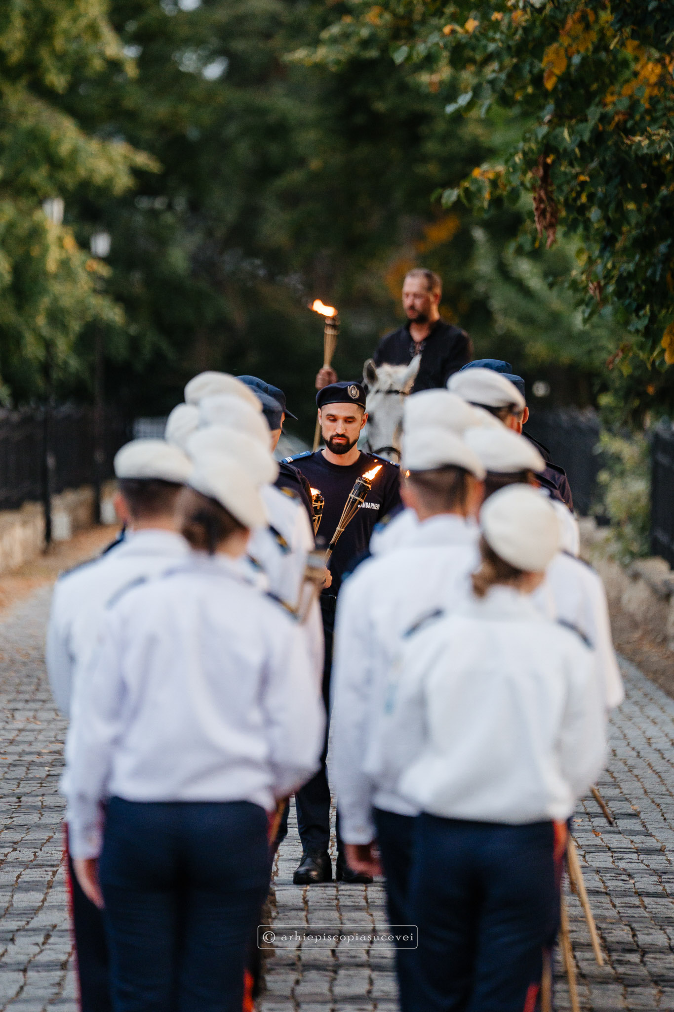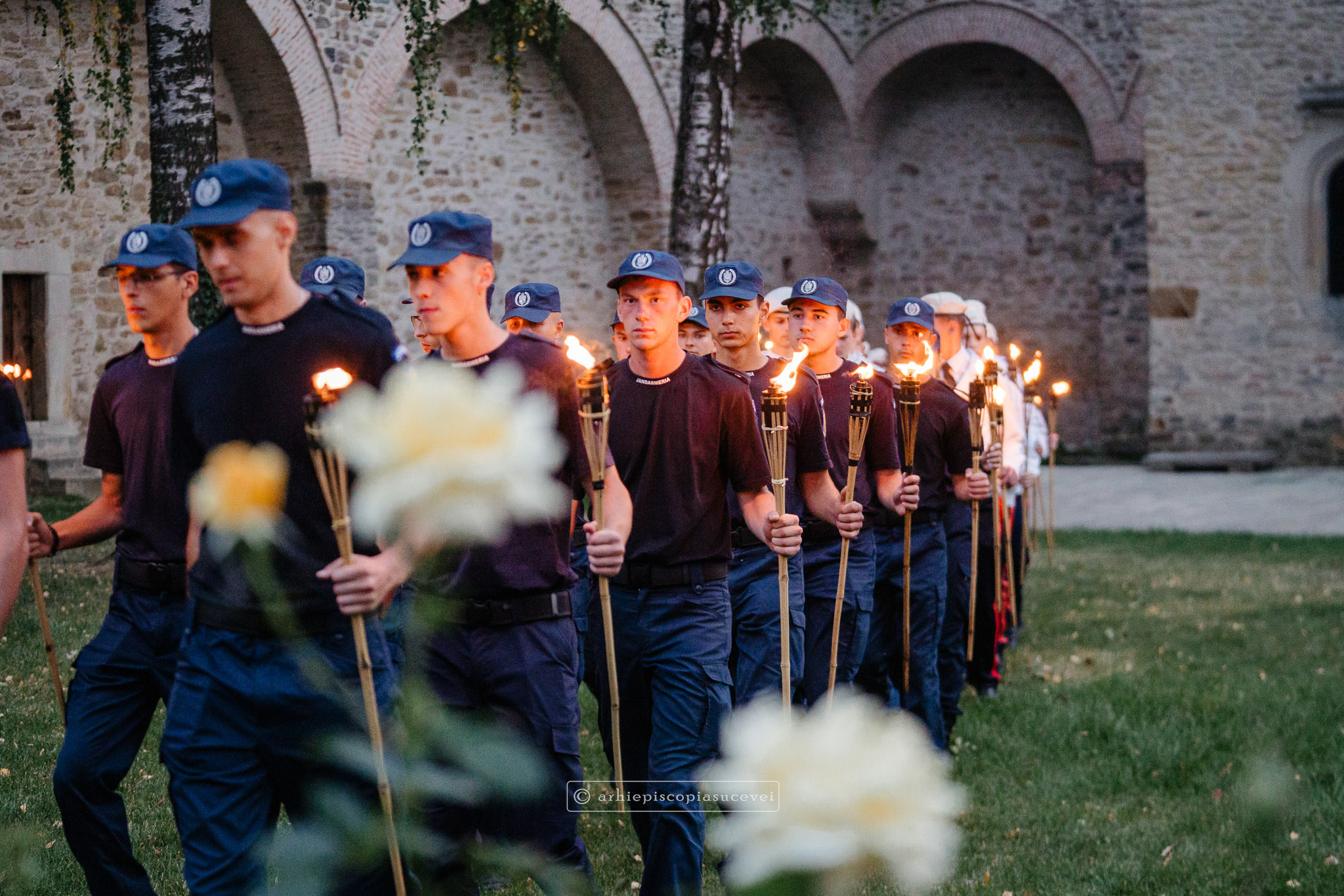 Seara s-a încheiat cu retragerea elevilor de la cele două școli militare cu torțe pe drumul de strajă al Cetății Dragomirnei, moment impresionant prin care au dorit să amintească atât de flacăra rugăciunii nestinse, cât și de vremurile de restriște, când mănăstirea a slujit drept adăpost pentru obște și căpeteniilor țării.