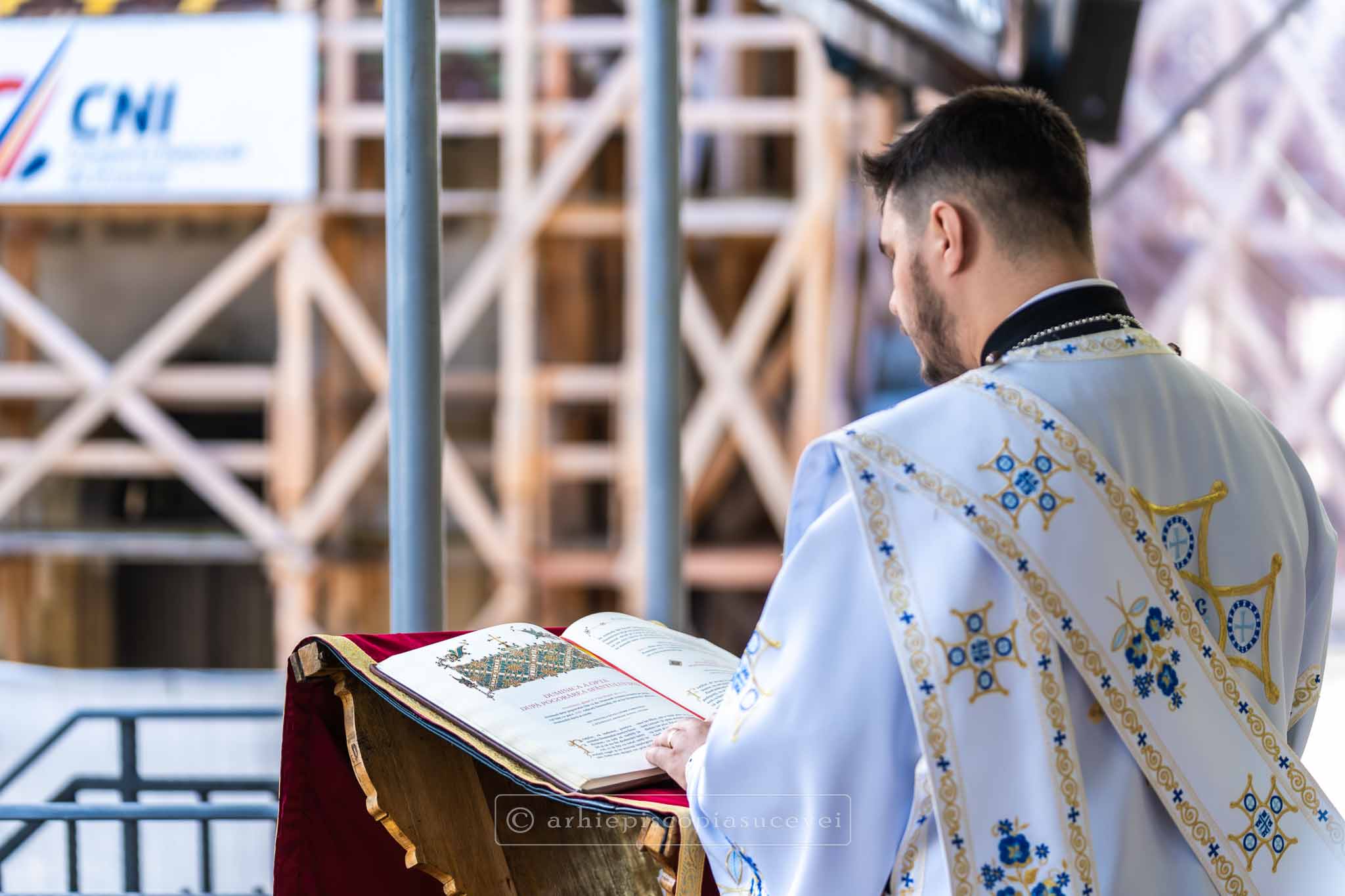 Întâistătătorul eparhiei Sucevei a săvârșit Sfânta și Dumnezeiasca Liturghie pe un podium special amenajat în incinta complexului monastic, dimpreună cu un sobor de preoți și diaconi, clerici de la Centrul Eparhial Suceava, între care arhim. Paraschiv Dabija, vicar administrativ, și slujitori ai sfântului locaș cu hramurile „Sfântul Mare Mucenic Gheorghe, purtătorul de biruință” și „Sfântul Ioan cel Nou de la Suceava”.