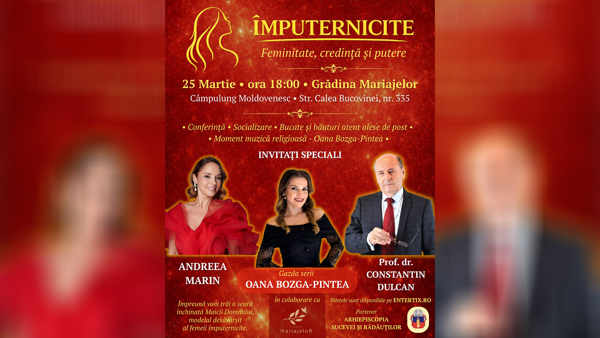 Biletele pentru această seară de excepție pot fi achiziționate prin platforma Entertix, accesând link-ul oficial: https://www.entertix.ro/evenimente/35239/imputernicite-feminitate-credinta-si-putere-25-martie-2026-gradina-mariajelor-cmpulung-moldovenesc.html.