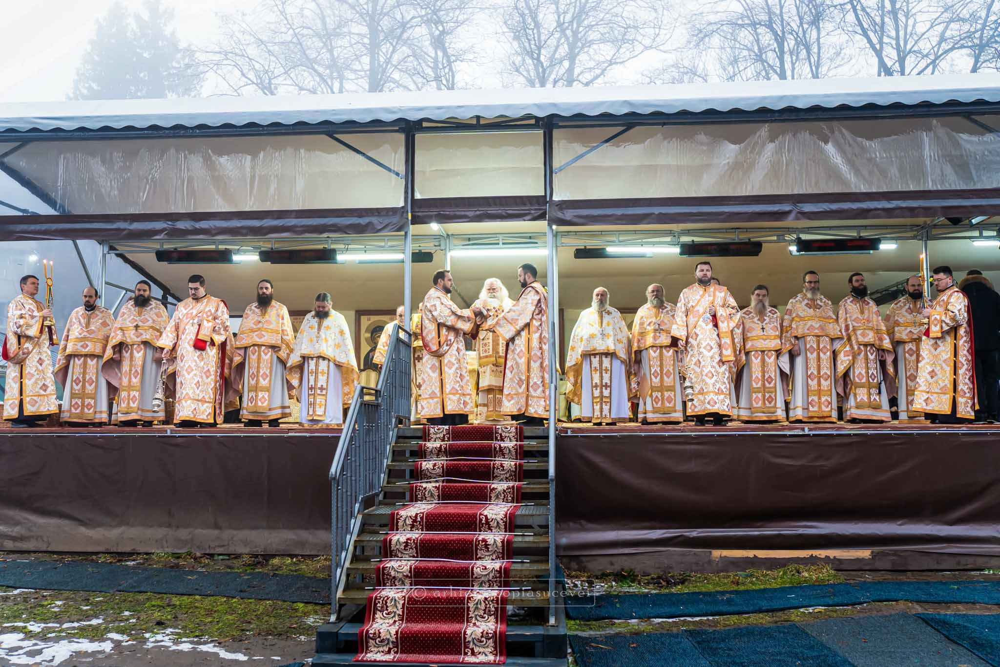 După ce a adus gând de mulțumire marelui mucenic din Trapezunt pentru că mijlocește neîncetat înaintea Tronului Ceresc pentru Biserica de pe aceste meleaguri și a îmbrăcat veșmântul slujirii, ierarhul a săvârșit Sfânta și Dumnezeiasca Liturghie la altarul amenajat lângă turnul-clopotniță al complexului monastic ce trece printr-un amplu proces de restaurare. Înaltpreasfinția sa a fost înconjurat în comuniune euharistică de un sobor de preoți și diaconi, din care au făcut parte slujitori ai așezământului monahal îndrumat duhovnicește de starețul Serafim Grigoraș, precum și clerici ai Catedralei Arhiepiscopale, coordonați de arhim. Valerian Radu, mare eclesiarh.