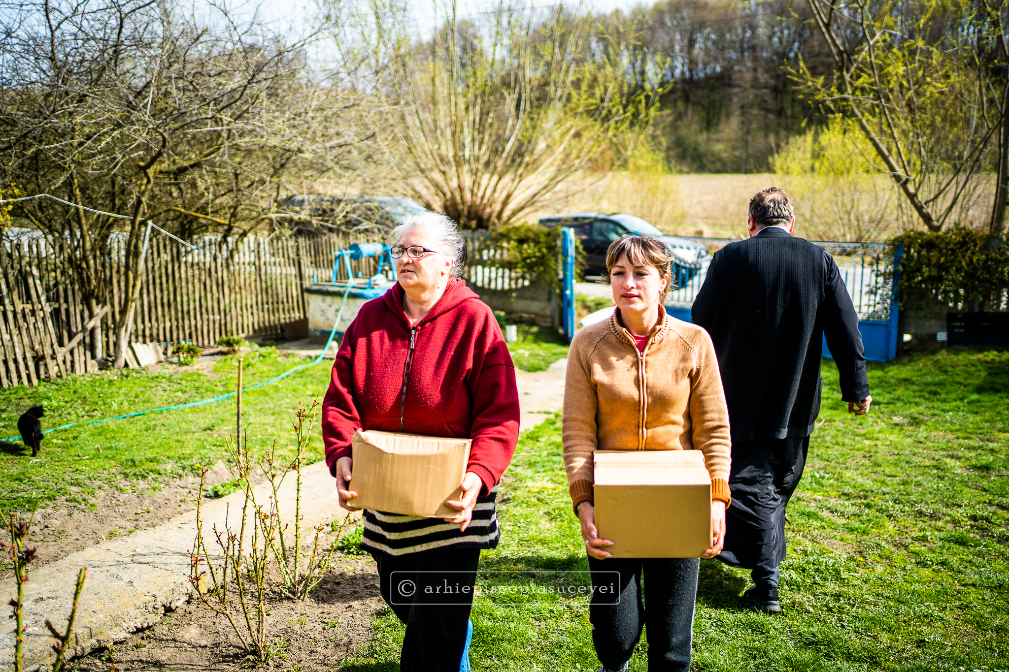 Elisaveta Pojoga, mama părintelui, în ciuda vârstei, s-a alăturat, cu brațele tremurânde de emoția primirii atâtor lucruri, dar vânjoase, voluntarilor care au descărcat ajutoarele, și ne-a vorbit despre cum se implică întreaga comunitate în sprijinirea confraților ucraineni, îndurerați de pierderea locuințelor și mai ales a oamenilor dragi, în acest război nemilos. „Pe cei care vin din zonele bombardate îi ajutăm cu produsele care sunt aduse aici. Cu părintele organizăm împărțirea la casele unde sunt cazați sau la spital. Sunt unele case mai spațioase care au 24 de persoane. Le-am împărțit de toate. Dacă sunt copii, le dăm lucruri pentru copii mai mult, iar pe cei vârstnici îi ajutăm și cu ce avem acasă, cu ce putem noi de la casele noastre și cu ajutoarele pe care le aduceți în parohia noastră. Ajutoarele pe care le primim din partea fraților din România sunt foarte importante pentru că ucrainenii ajung la noi fără nimic de acolo. Mulți vin doar cu hainele pe care le au pe ei, au fugit și nu mai au nimic. Și știți, deodată dacă se aduc mai multe din România, avem ce să le împărțim, să aibă în fiecare zi ce să mănânce și cu ce să se îmbrace. Românii noștri sunt oameni cu inimă mare, oameni care sar în ajutorul tuturor!”
