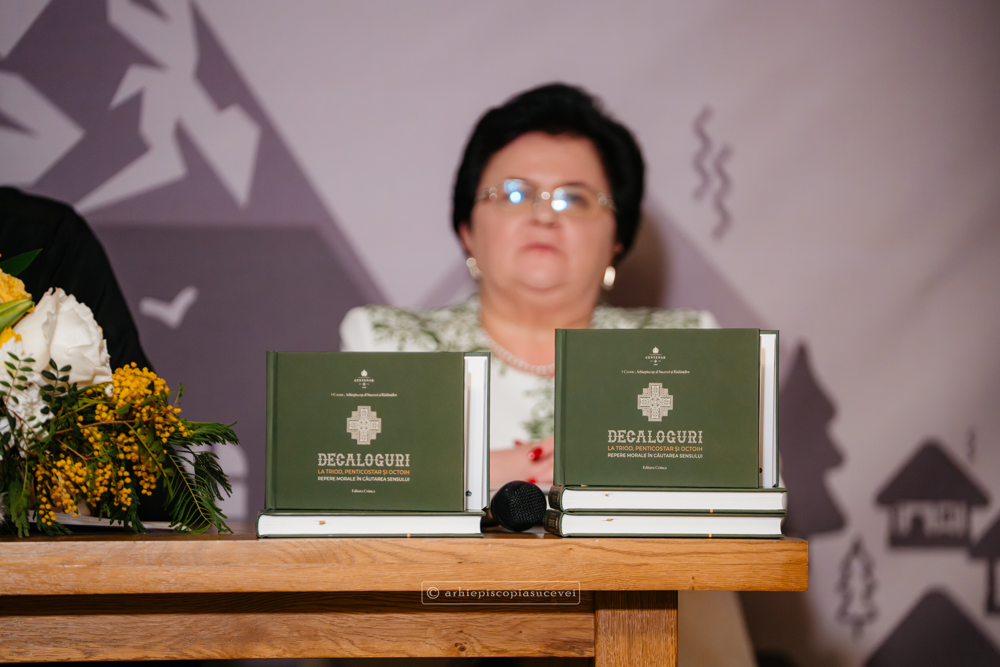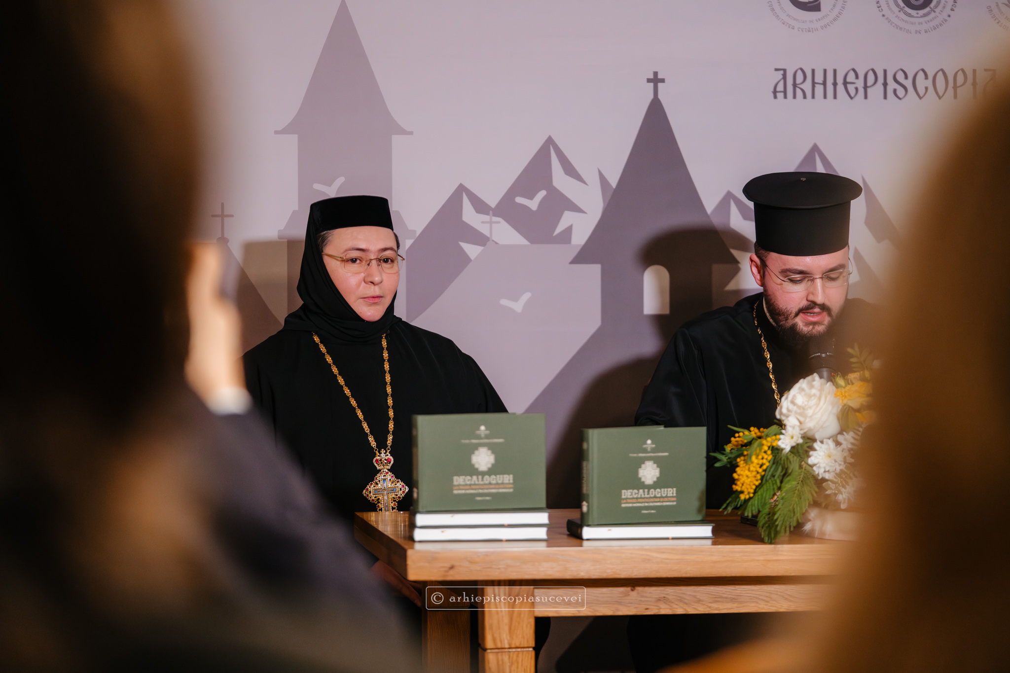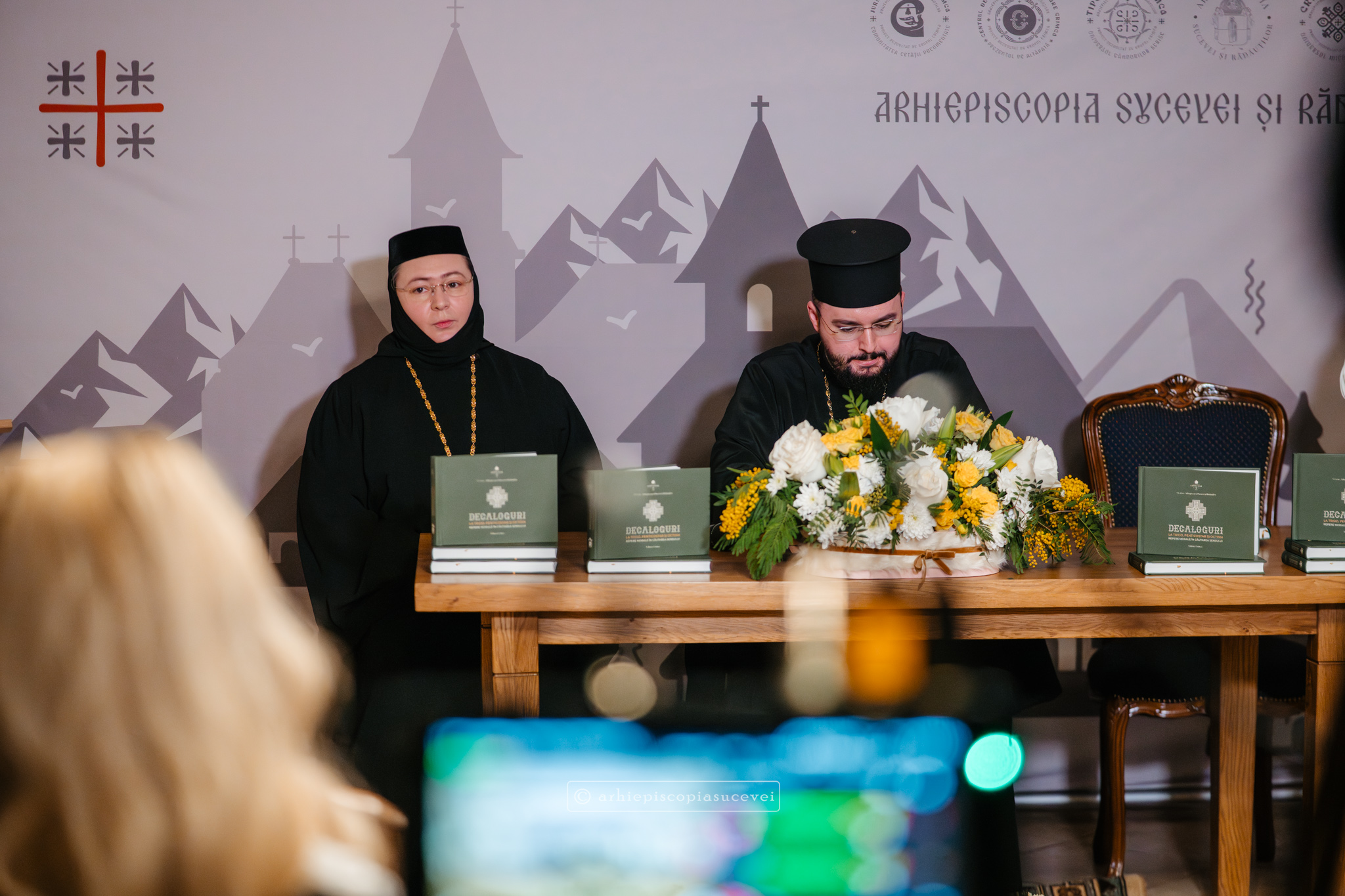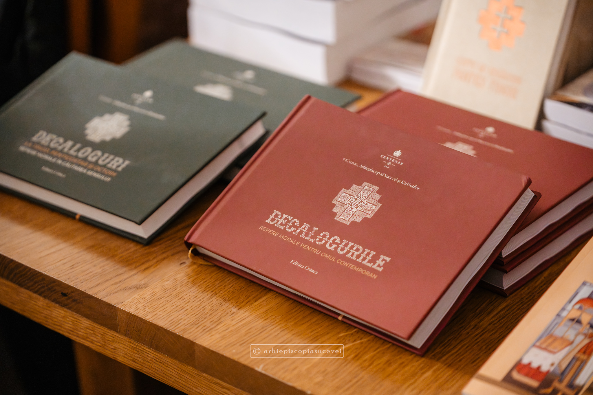 Seara a continuat cu un moment mult așteptat, lansarea cărții Decaloguri la Triod, Penticostar și Octoih. Repere morale în căutarea sensului, publicată în Anul omagial al Centenarului Patriarhiei Române la Editura Crimca a Arhiepiscopiei Sucevei și Rădăuților, o nouă carte ce poartă semnătura Înaltpreasfințitului Părinte Arhiepiscop Calinic. Pr. Constantin-Ciprian Blaga, consilier eparhial în cadrul Sectorului Cultural, cel care și semnează Cuvântul-înainte, le-a împărtășit celor prezenți câteva cuvinte despre acest volum. Sfinția sa a vorbit despre darul de lumină al întâistătătorului Bisericii de pe aceste meleaguri, cel de-al doilea volum al Decalogurilor înmănunchind 73 de texte și oferind cititorului contemporan sfaturi spirituale sub o formă concentrată și accesibilă. Punctând truda editorială și profunzimea spirituală a unei opere ce transformă mii de pagini de reflecție în îndemnuri practice de o mare forță interioară, părintele consilier a explicat faptul că întregul volum reprezintă o formă de respect față de timpul cititorului, facilitând memorarea și integrarea valorilor creștine în viața de zi cu zi.
