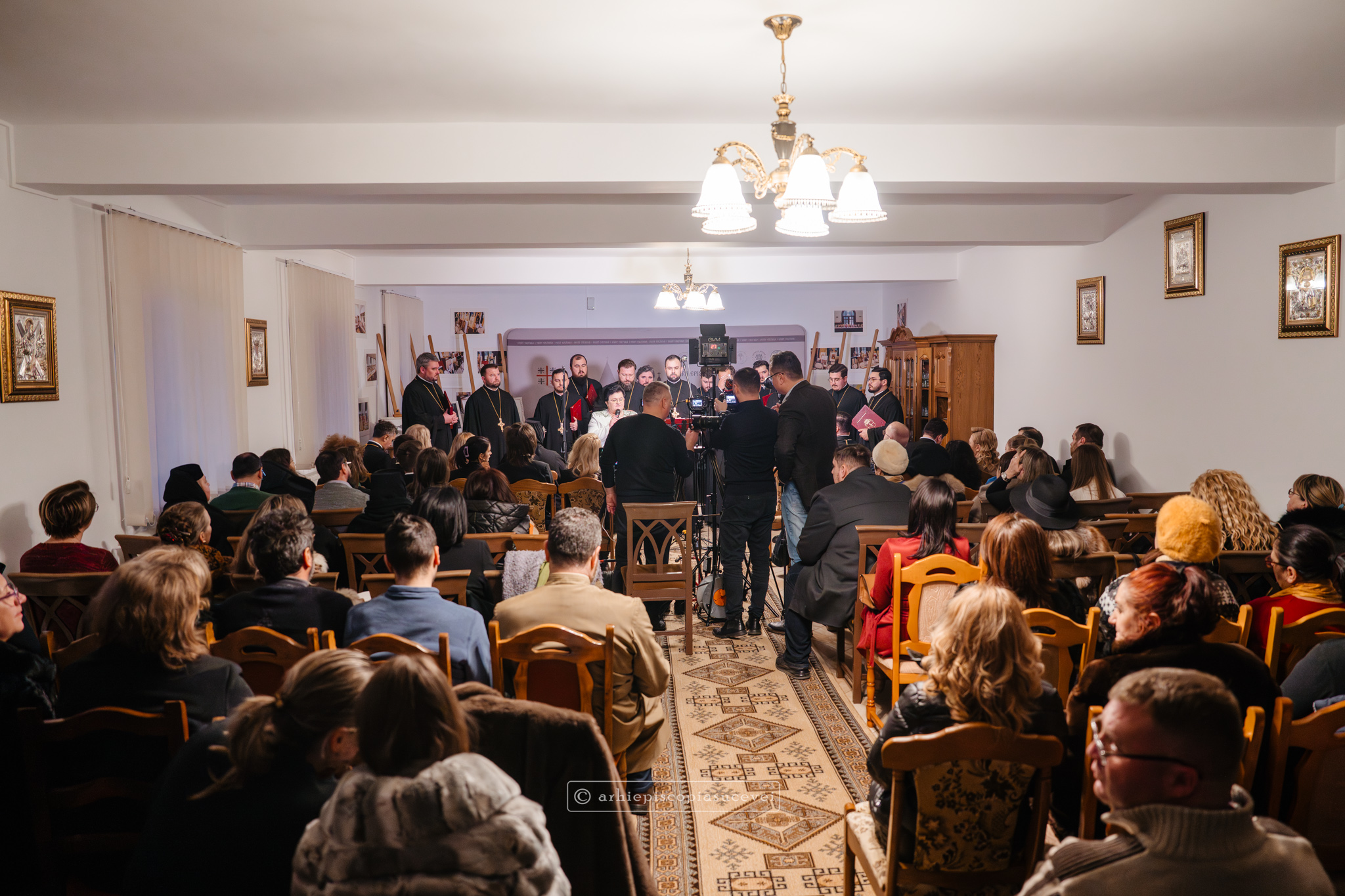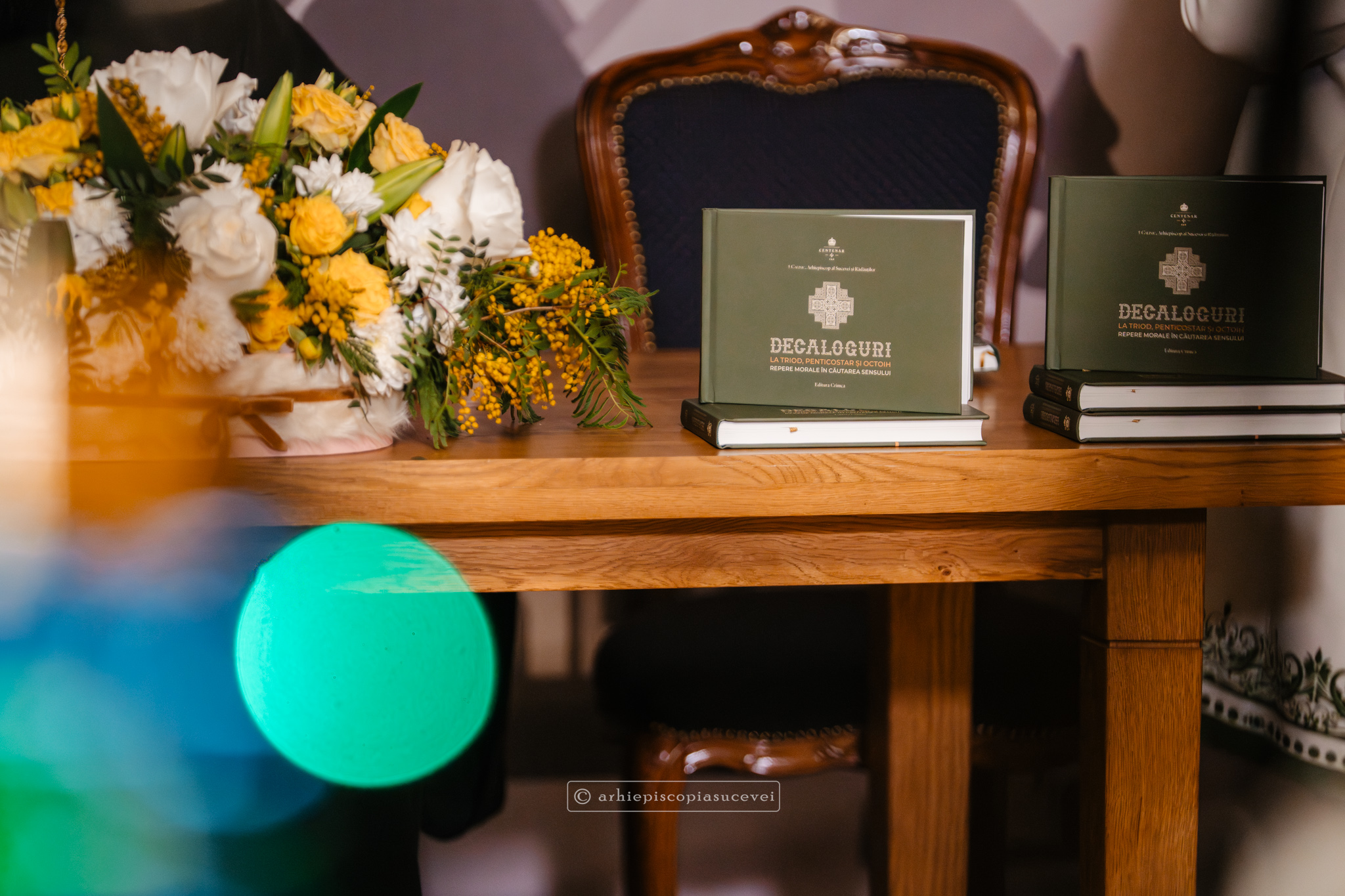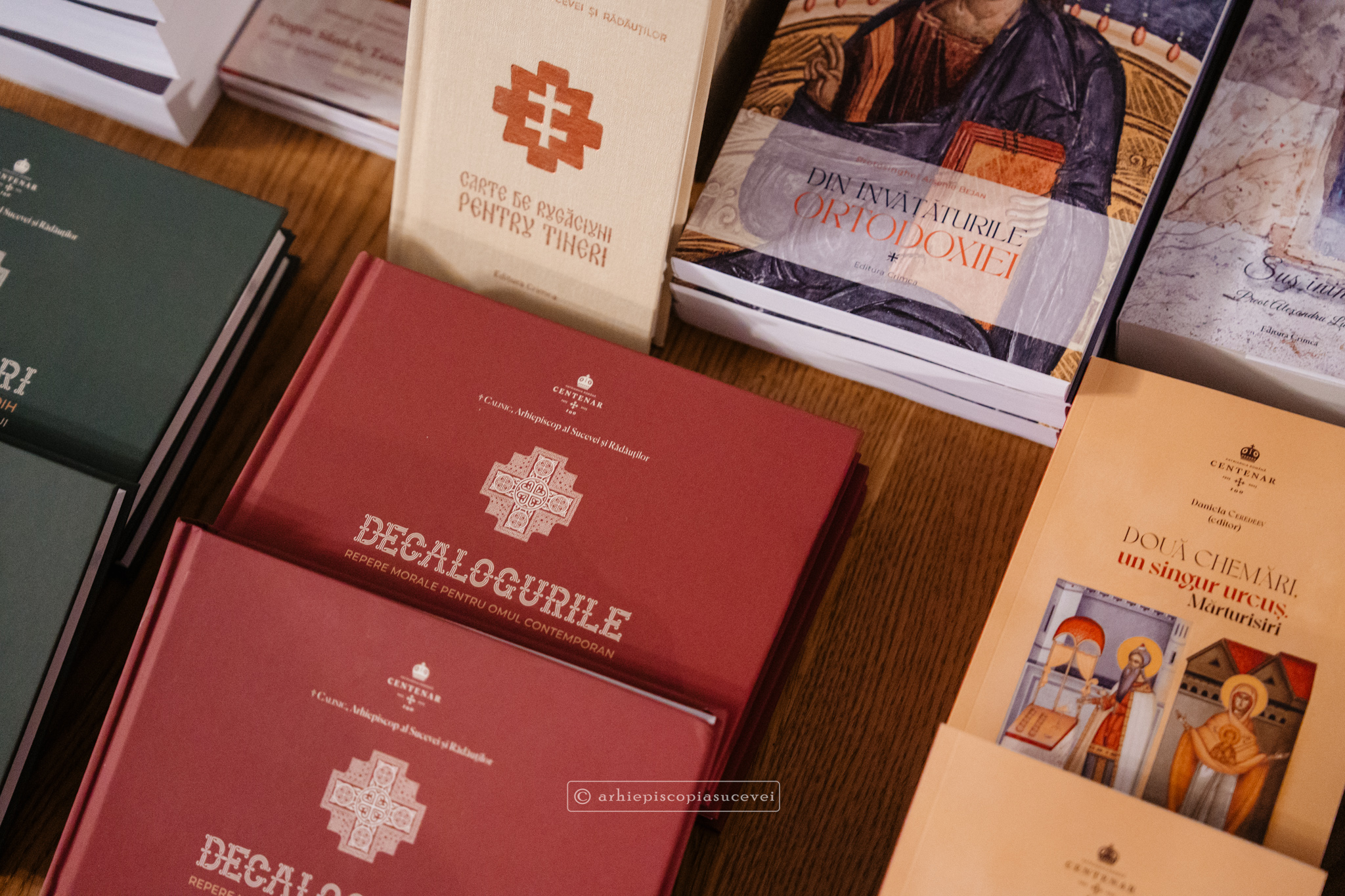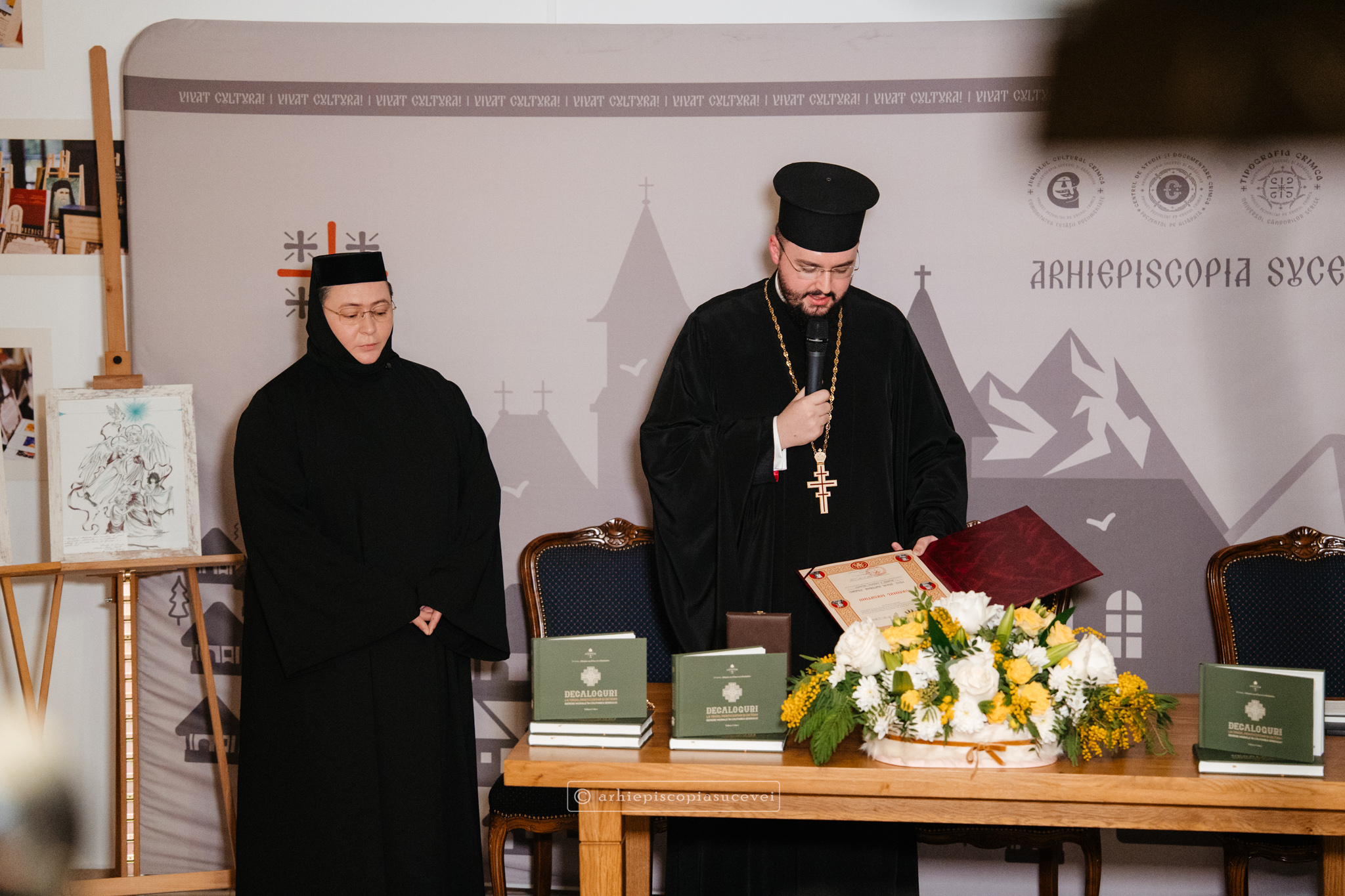 Seara a continuat cu un moment mult așteptat, lansarea cărții Decaloguri la Triod, Penticostar și Octoih. Repere morale în căutarea sensului, publicată în Anul omagial al Centenarului Patriarhiei Române la Editura Crimca a Arhiepiscopiei Sucevei și Rădăuților, o nouă carte ce poartă semnătura Înaltpreasfințitului Părinte Arhiepiscop Calinic. Pr. Constantin-Ciprian Blaga, consilier eparhial în cadrul Sectorului Cultural, cel care și semnează Cuvântul-înainte, le-a împărtășit celor prezenți câteva cuvinte despre acest volum. Sfinția sa a vorbit despre darul de lumină al întâistătătorului Bisericii de pe aceste meleaguri, cel de-al doilea volum al Decalogurilor înmănunchind 73 de texte și oferind cititorului contemporan sfaturi spirituale sub o formă concentrată și accesibilă. Punctând truda editorială și profunzimea spirituală a unei opere ce transformă mii de pagini de reflecție în îndemnuri practice de o mare forță interioară, părintele consilier a explicat faptul că întregul volum reprezintă o formă de respect față de timpul cititorului, facilitând memorarea și integrarea valorilor creștine în viața de zi cu zi.