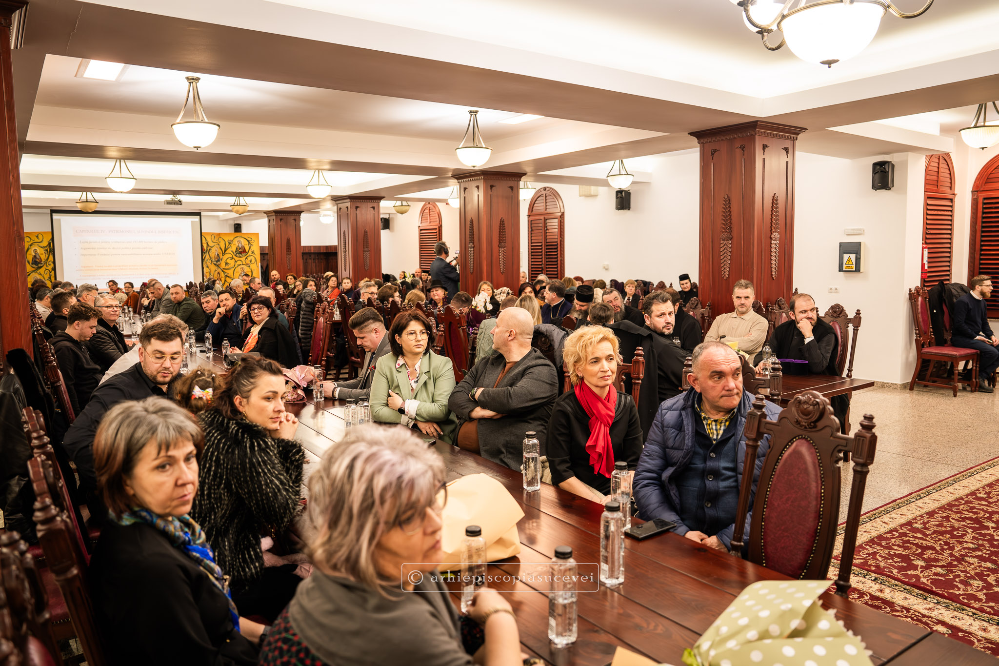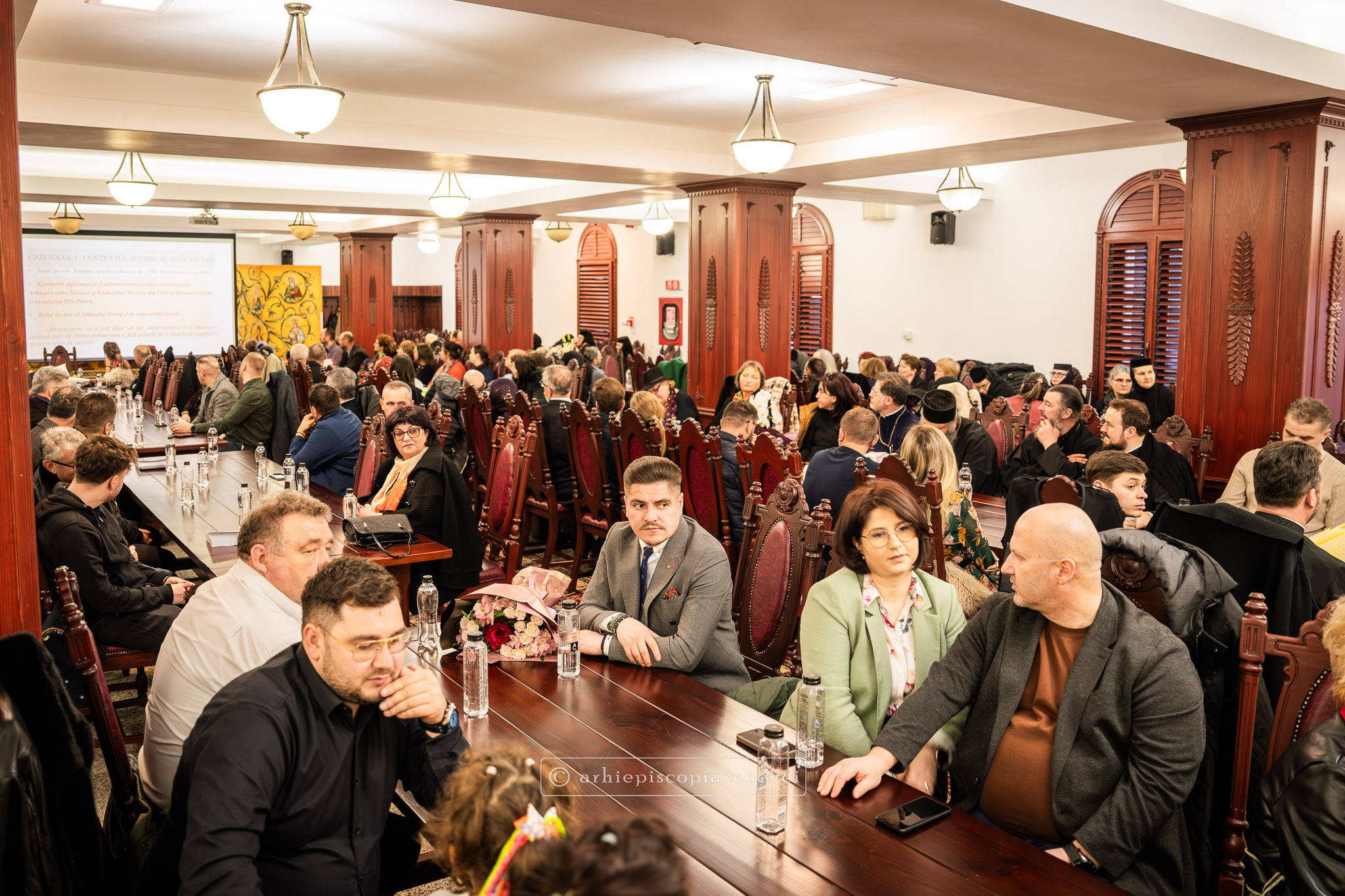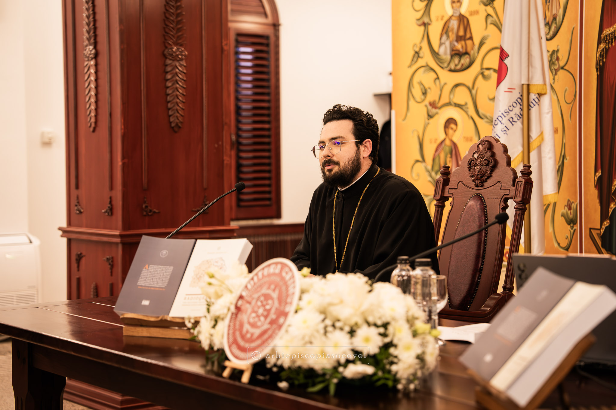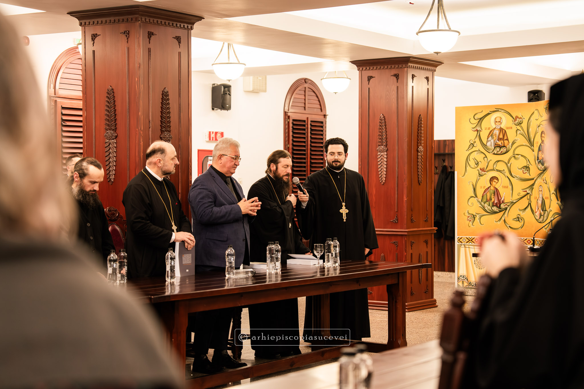 După rostirea Rugăciunii Domnești, evenimentul a continuat cu prezentarea pr. Ștefănel Ciurciun, director al departamentului Editură și Tipografie din cadrul Sectorului Cultural al Arhiepiscopiei și moderator al manifestării. Sfinția sa a subliniat faptul că volumul nu este doar o cronică istorică, ci o analiză pastorală profundă care documentează modul în care Biserica a oferit stabilitate comunității într-o perioadă de incertitudine socială. A fost evocat rolul deosebit pe care în cele trei decenii (1990-2020) l-a avut Înaltpreasfințitul Părinte Pimen, „model viu de jertfă și de constanță”, lucrarea demonstrând cum filantropia, cultura și educația s-au împletit armonios cu viața liturgică pentru a sprijini credincioșii acestor locuri. Părintele director a punctat și faptul că fiind bazată pe o cercetare academică solidă, cartea reprezintă o datorie de conștiință și un act de recunoștință față de eforturile clerului și monahismului, consemnarea scrisă a acestor realizări fiind esențială pentru a asigura păstrarea identității și memoriei spirituale a eparhiei.