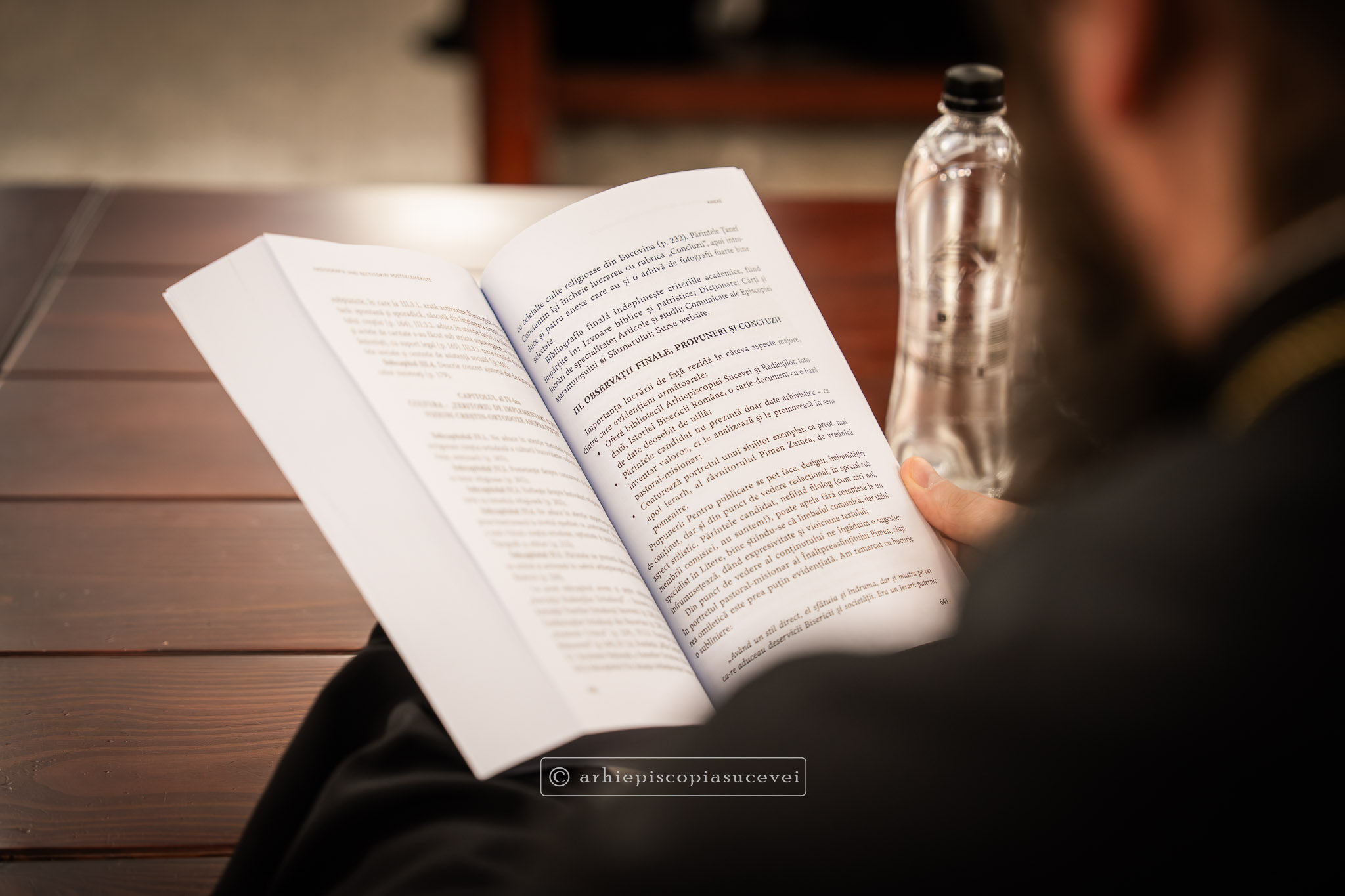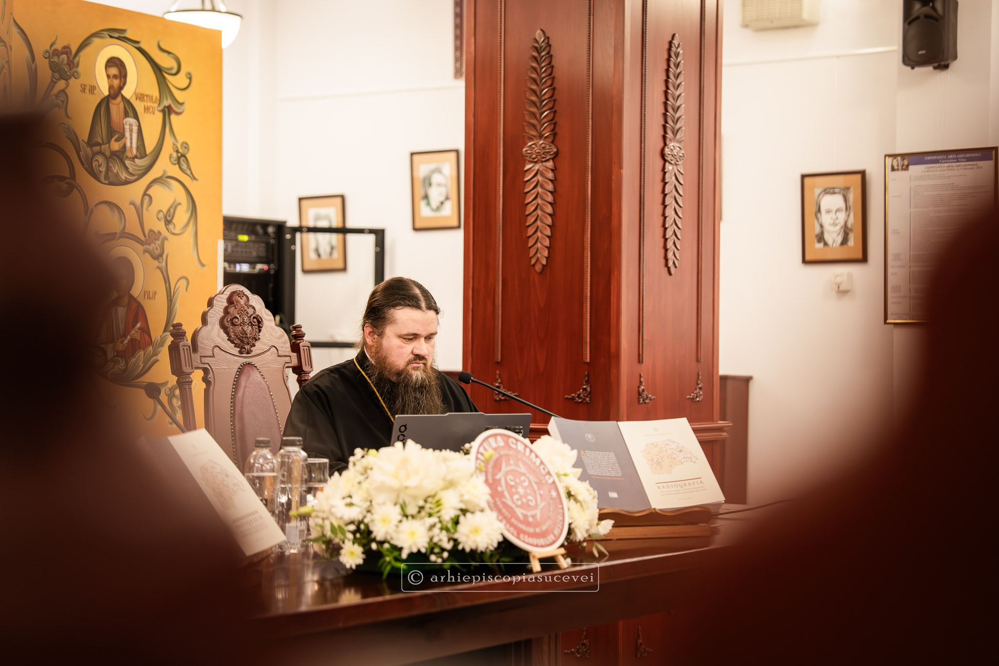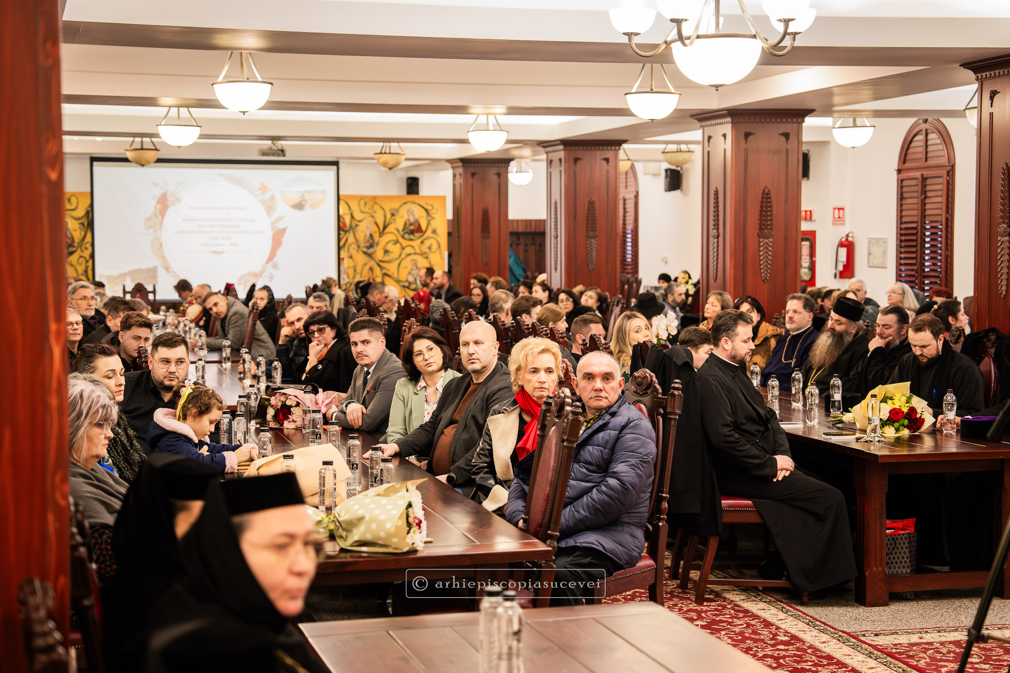 După rostirea Rugăciunii Domnești, evenimentul a continuat cu prezentarea pr. Ștefănel Ciurciun, director al departamentului Editură și Tipografie din cadrul Sectorului Cultural al Arhiepiscopiei și moderator al manifestării. Sfinția sa a subliniat faptul că volumul nu este doar o cronică istorică, ci o analiză pastorală profundă care documentează modul în care Biserica a oferit stabilitate comunității într-o perioadă de incertitudine socială. A fost evocat rolul deosebit pe care în cele trei decenii (1990-2020) l-a avut Înaltpreasfințitul Părinte Pimen, „model viu de jertfă și de constanță”, lucrarea demonstrând cum filantropia, cultura și educația s-au împletit armonios cu viața liturgică pentru a sprijini credincioșii acestor locuri. Părintele director a punctat și faptul că fiind bazată pe o cercetare academică solidă, cartea reprezintă o datorie de conștiință și un act de recunoștință față de eforturile clerului și monahismului, consemnarea scrisă a acestor realizări fiind esențială pentru a asigura păstrarea identității și memoriei spirituale a eparhiei.