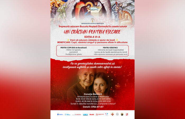 Cu binecuvântarea Înaltpreasfințitului Părinte Arhiepiscop Calinic, Sectorul de Asistență Socială și Medicală al Arhiepiscopiei Sucevei și Rădăuților adresează un părintesc și frățesc apel la iubire și solidaritate creștină, odată cu lansarea celei de-a VI-a ediții a campaniei „Un Crăciun pentru Fiecare”.