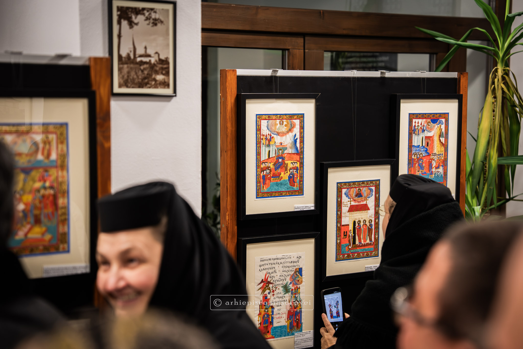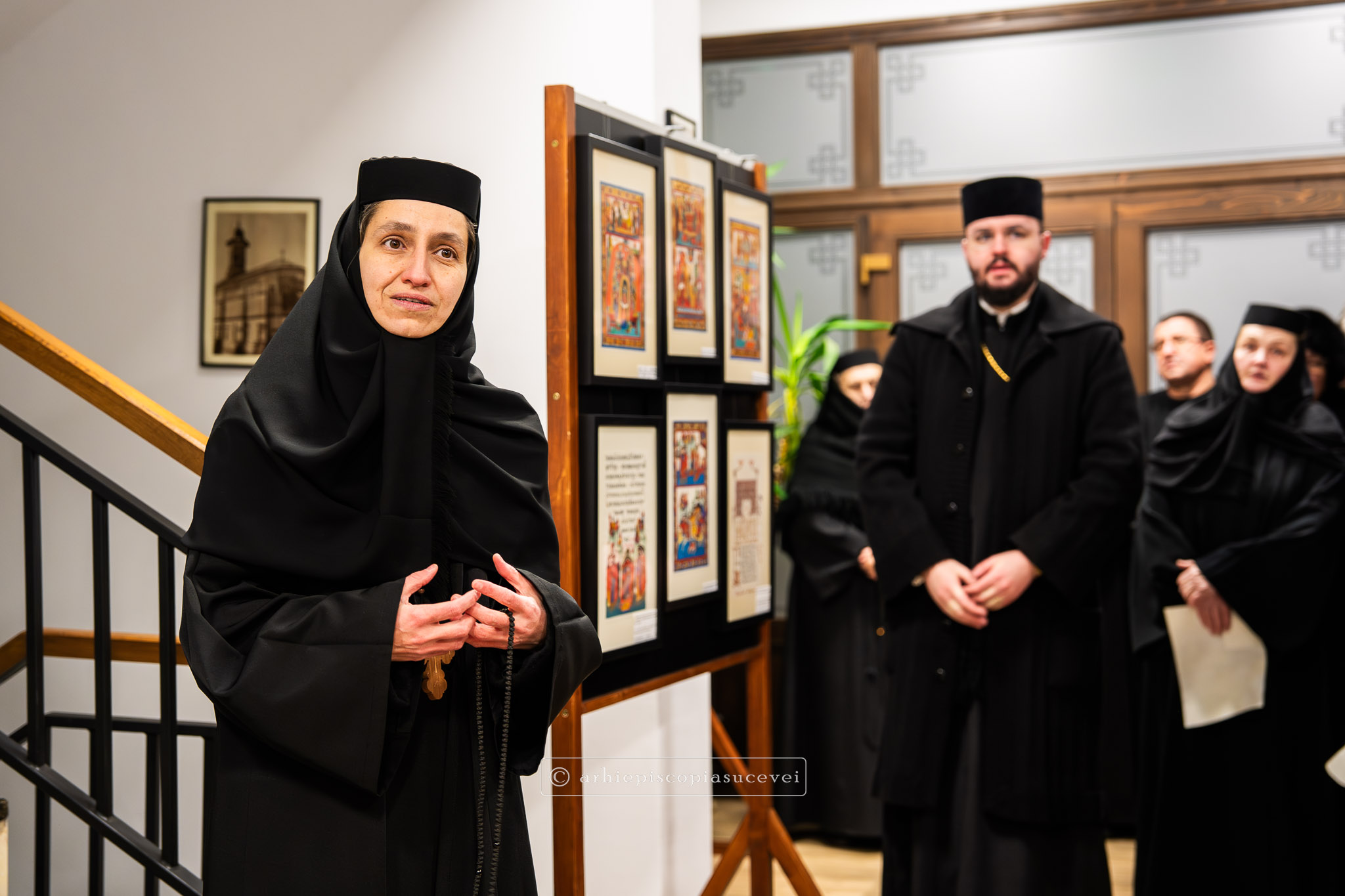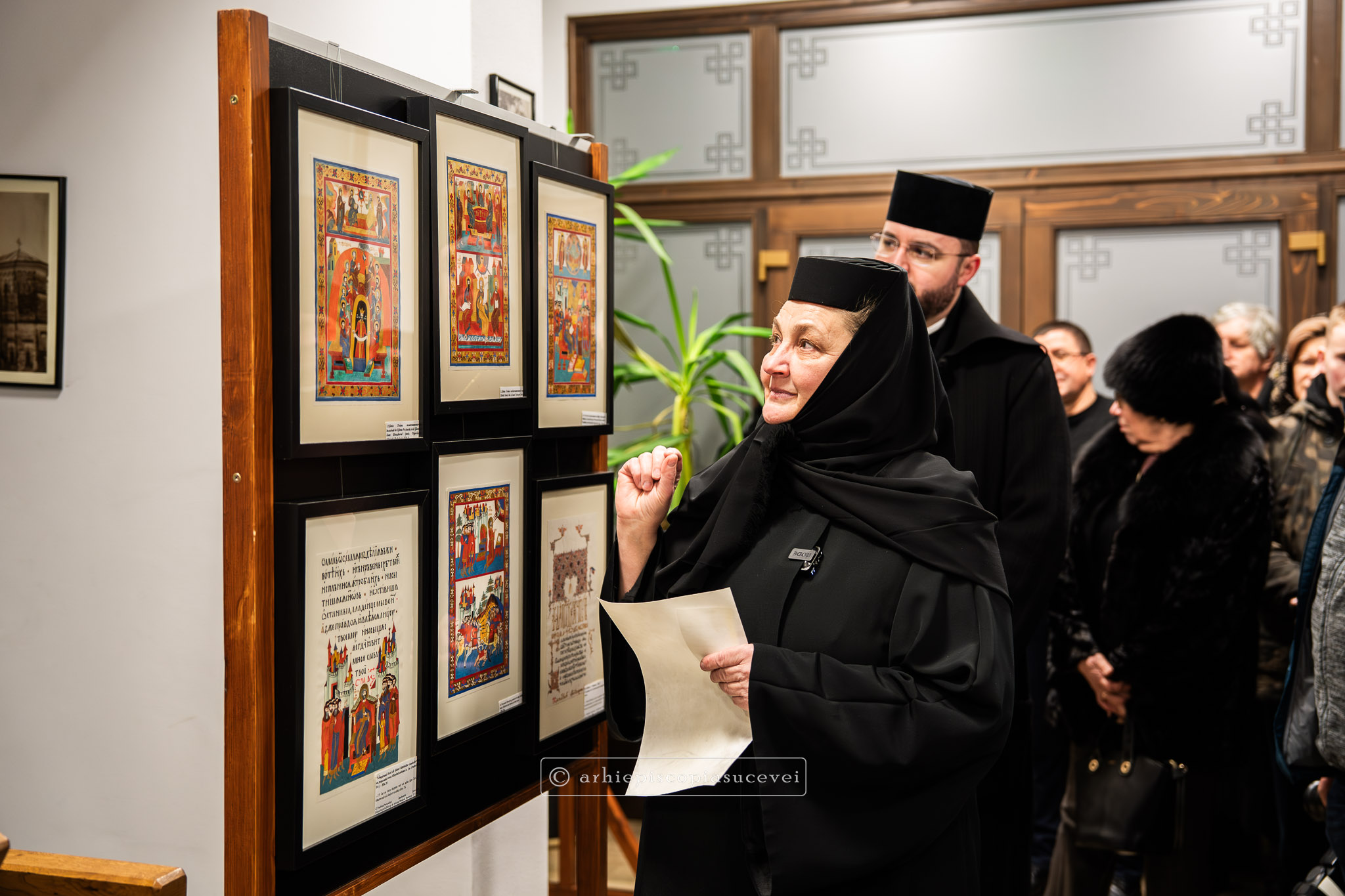 În continuare, la Centrul „Sfântul Paisie” din incinta ansamblului monastic, a fost vernisată expoziția „Unica Psaltireilustrată – Codexul de la 1616 al lui Crimca”. După ce au fost prezentate cele mai importante file din istoria Școlii de miniatură de la Dragomirna de către maica stareță, monahia Filofteia Balan le-a împărtășit celor prezenți detalii despre metodele tradiționale utilizate pentru replicarea miniaturilor din manuscrise. Preacuvioșia sa a descris utilizarea unei emulsii de ou amestecată cu pigmenți și aplicarea aurului veritabil sub formă de foiță sau praf combinat cu gumă arabică. Totodată, aceasta a subliniat efortul de a onora moștenirea artistică a părinților bisericești prin reproducerea fidelă a detaliilor complexe din psaltire.