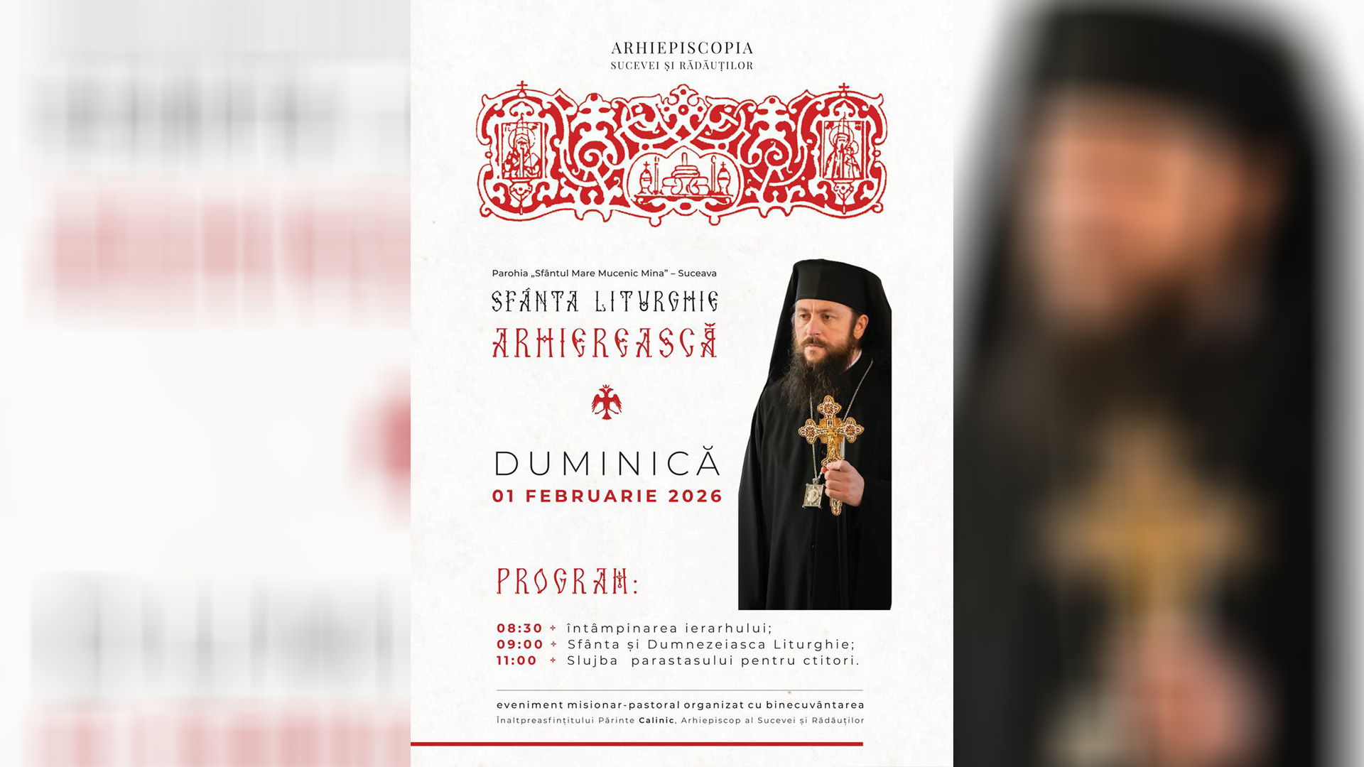 Cu binecuvântarea Înaltpreasfințitului Părinte Calinic, Arhiepiscop al Sucevei și Rădăuților, duminică, 01 februarie 2026, Preasfințitul Părinte Damaschin Dorneanul, Episcop-vicar al Arhiepiscopiei Sucevei și Rădăuților, va poposi în mijlocul comunității parohiale arondate Parohiei „Sfântul Mare Mucenic Mina” din orașul Suceava.