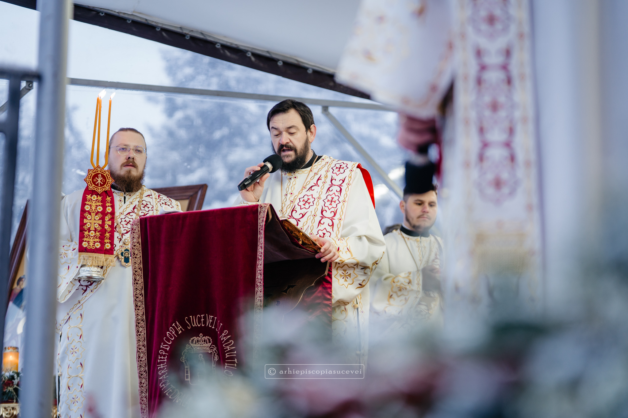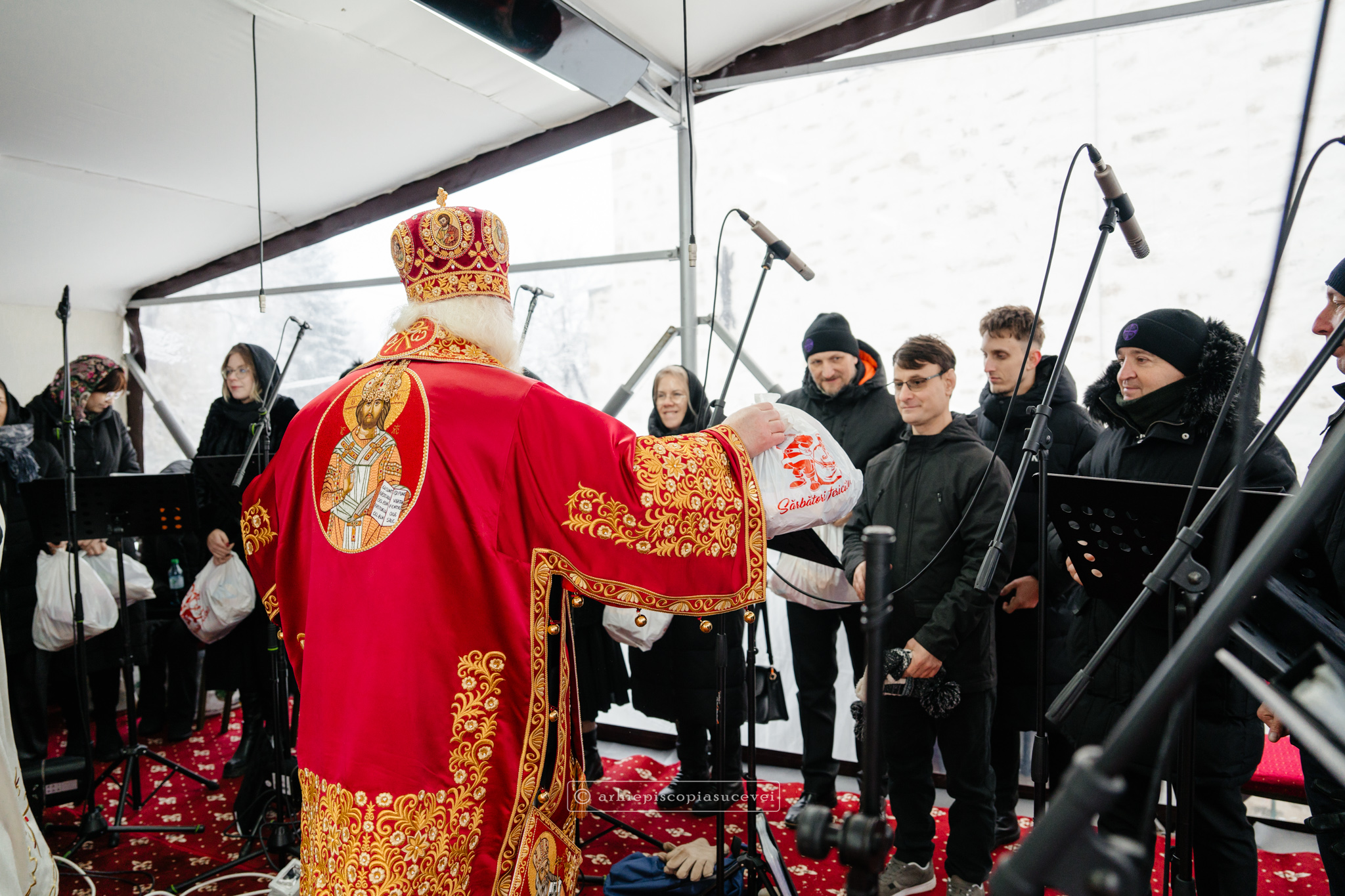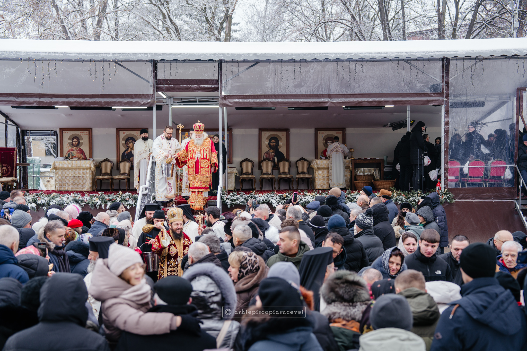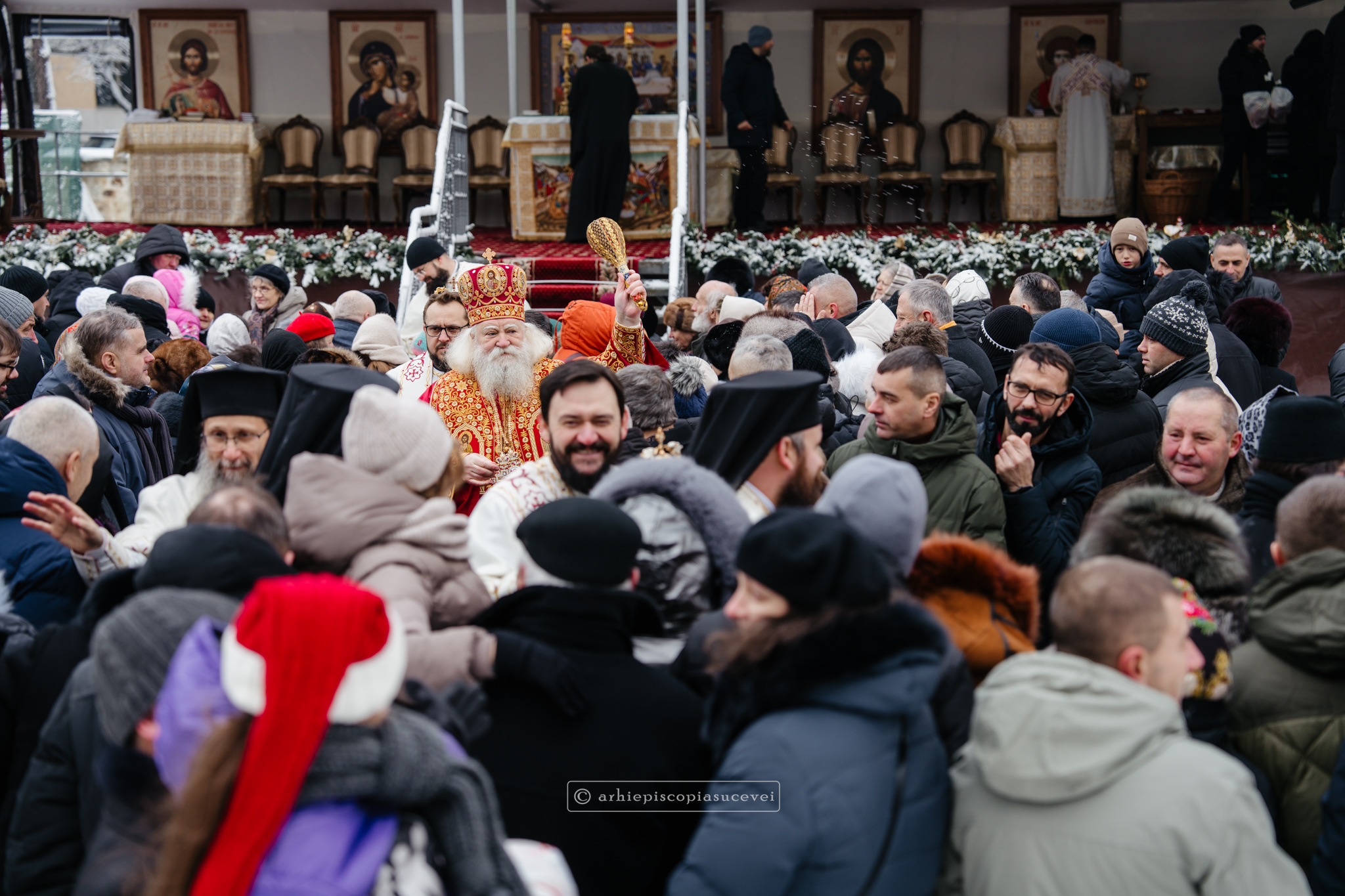 La sărbătoarea Nașterii Mântuitorului Iisus Hristos, 25 decembrie 2025, Sfânta și Dumnezeiasca Liturghie a fost săvârșită de Arhiepiscopul Sucevei și Rădăuților, Înaltpreasfințitul Părinte Calinic, și de Episcopul-Vicar, Preasfințitul Părinte Damaschin Dorneanul, împreună cu un sobor de preoți și diaconi, pe un podium special amenajat în imediata apropiere a clopotniței Bisericii „Sfântul Mare Mucenic Gheorghe, purtătorul de biruință”. Din soborul slujitor au făcut parte clerici ai Centrului Eparhial Suceava, precum și slujitori de la Mănăstirea „Sfântul Ioan cel Nou”, îndrumați duhovnicește de arhim. Serafim Grigoraș.