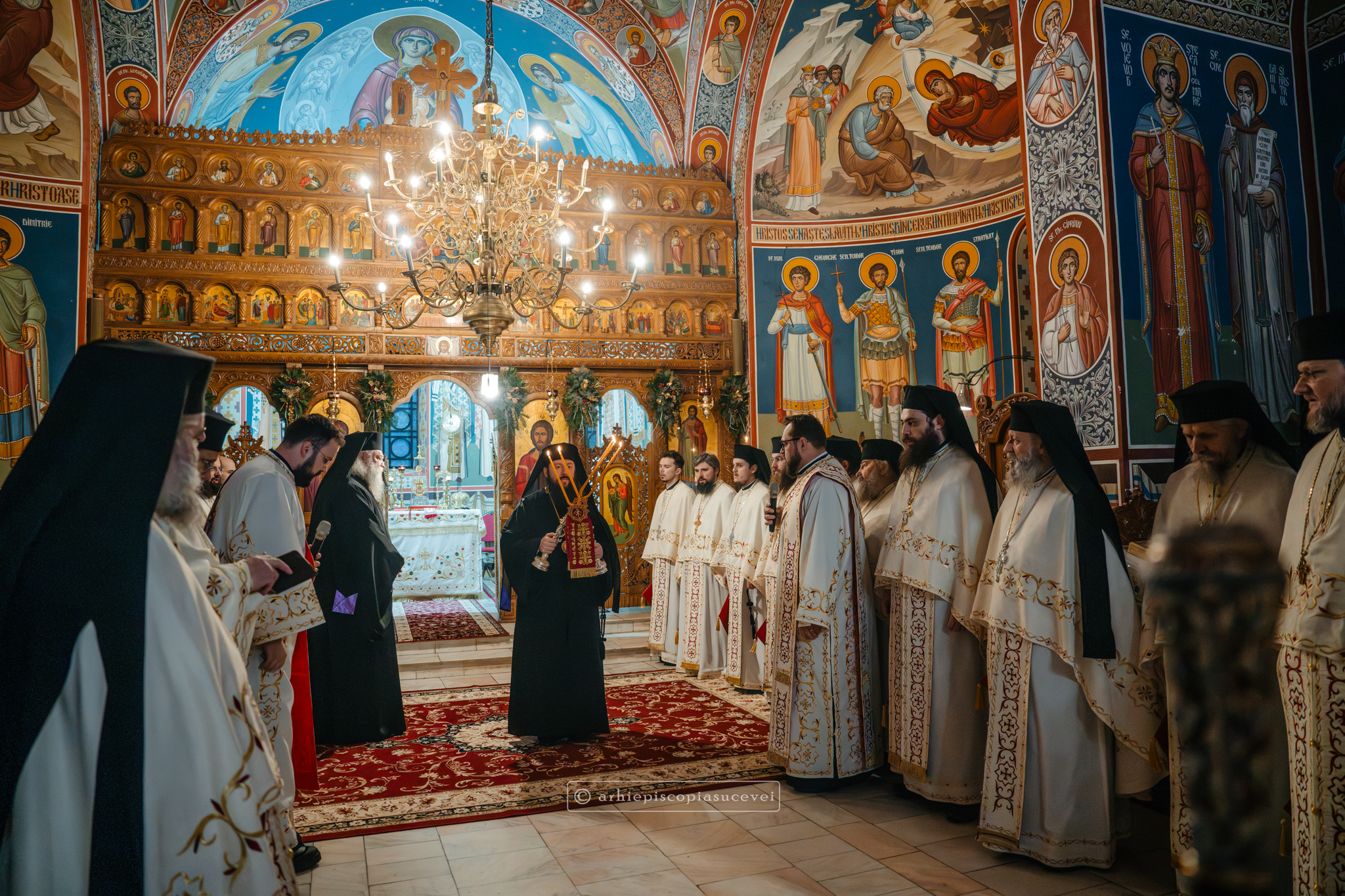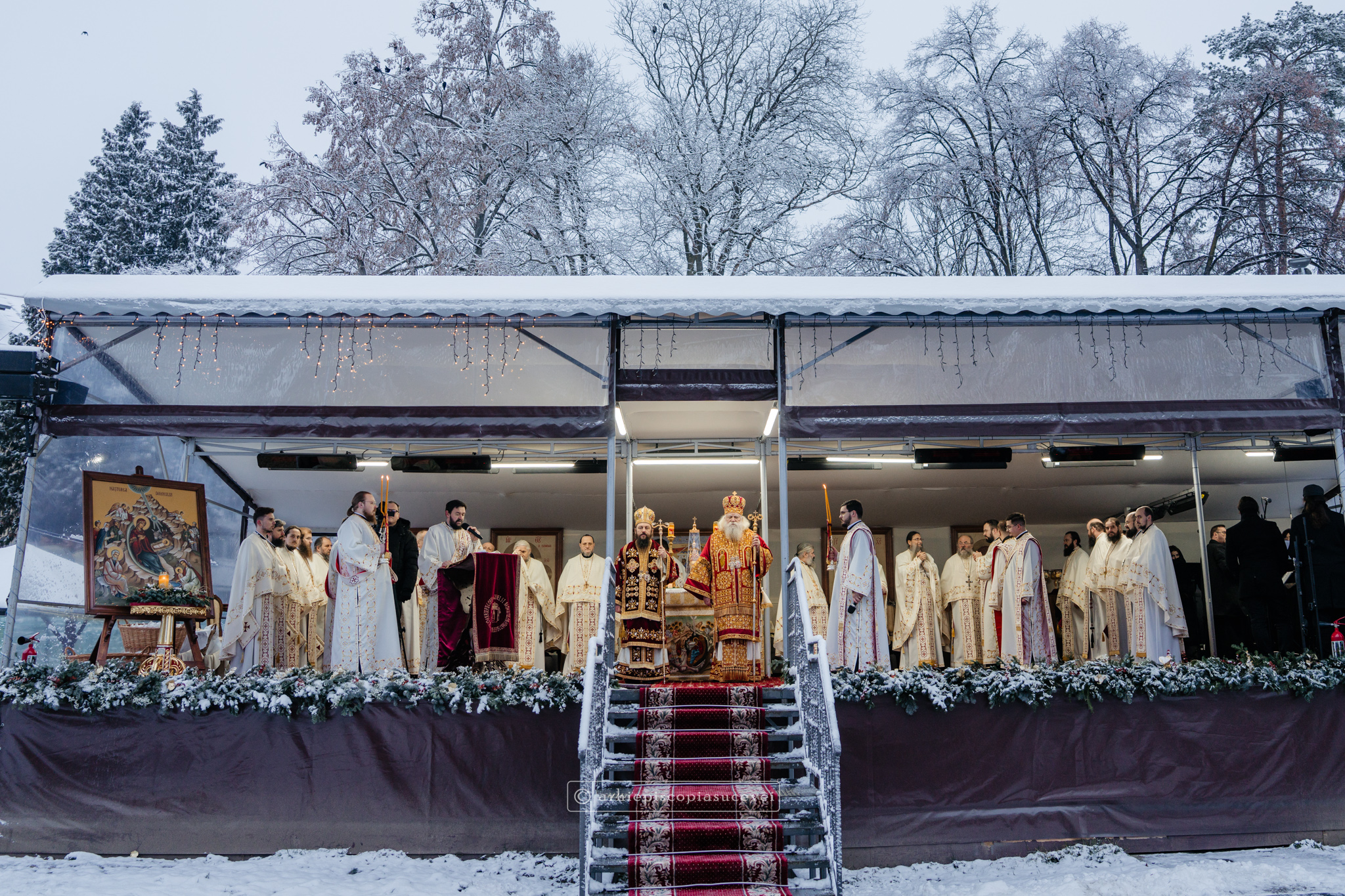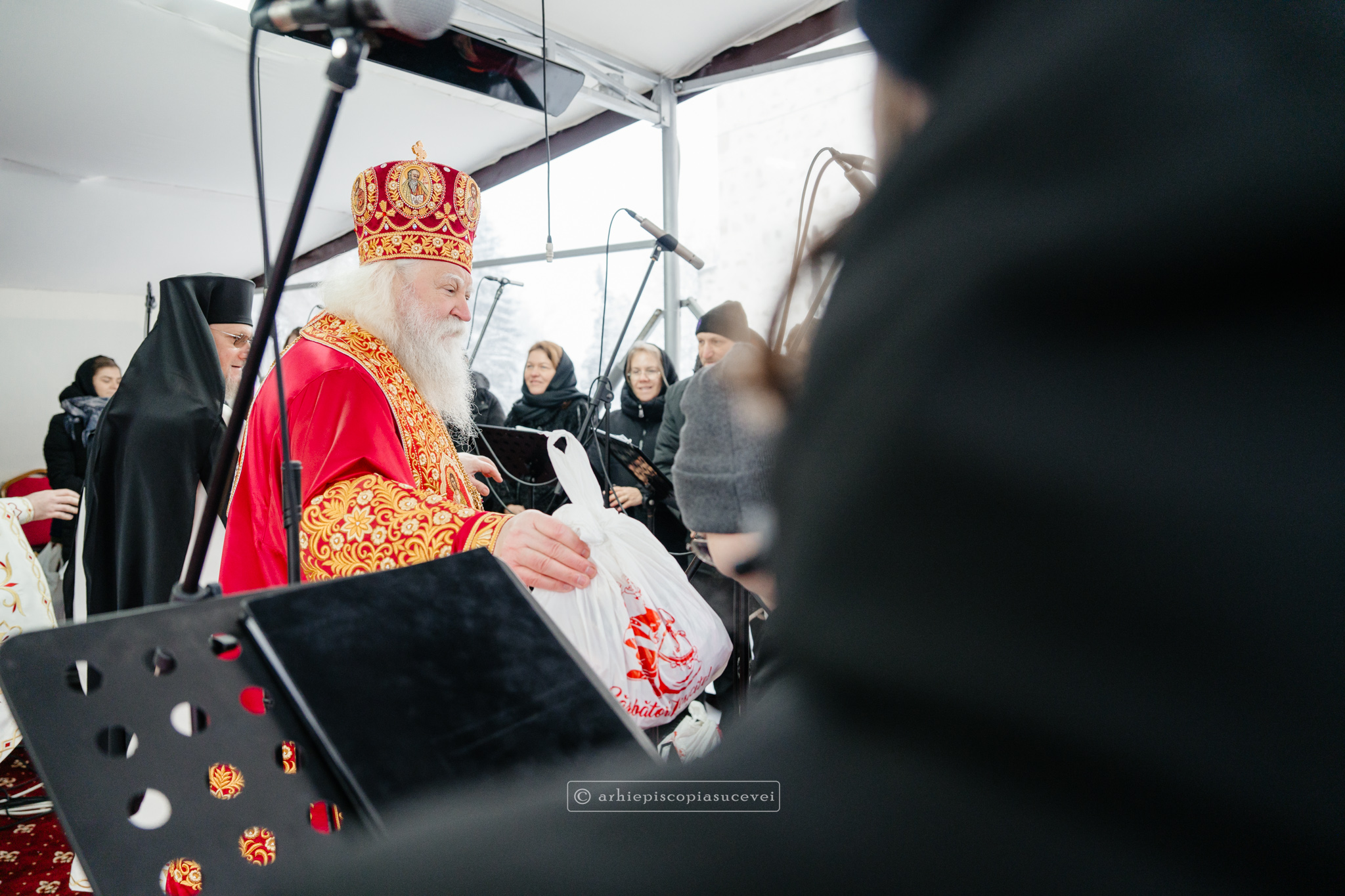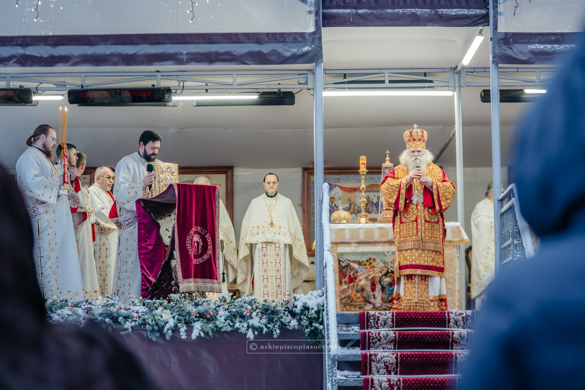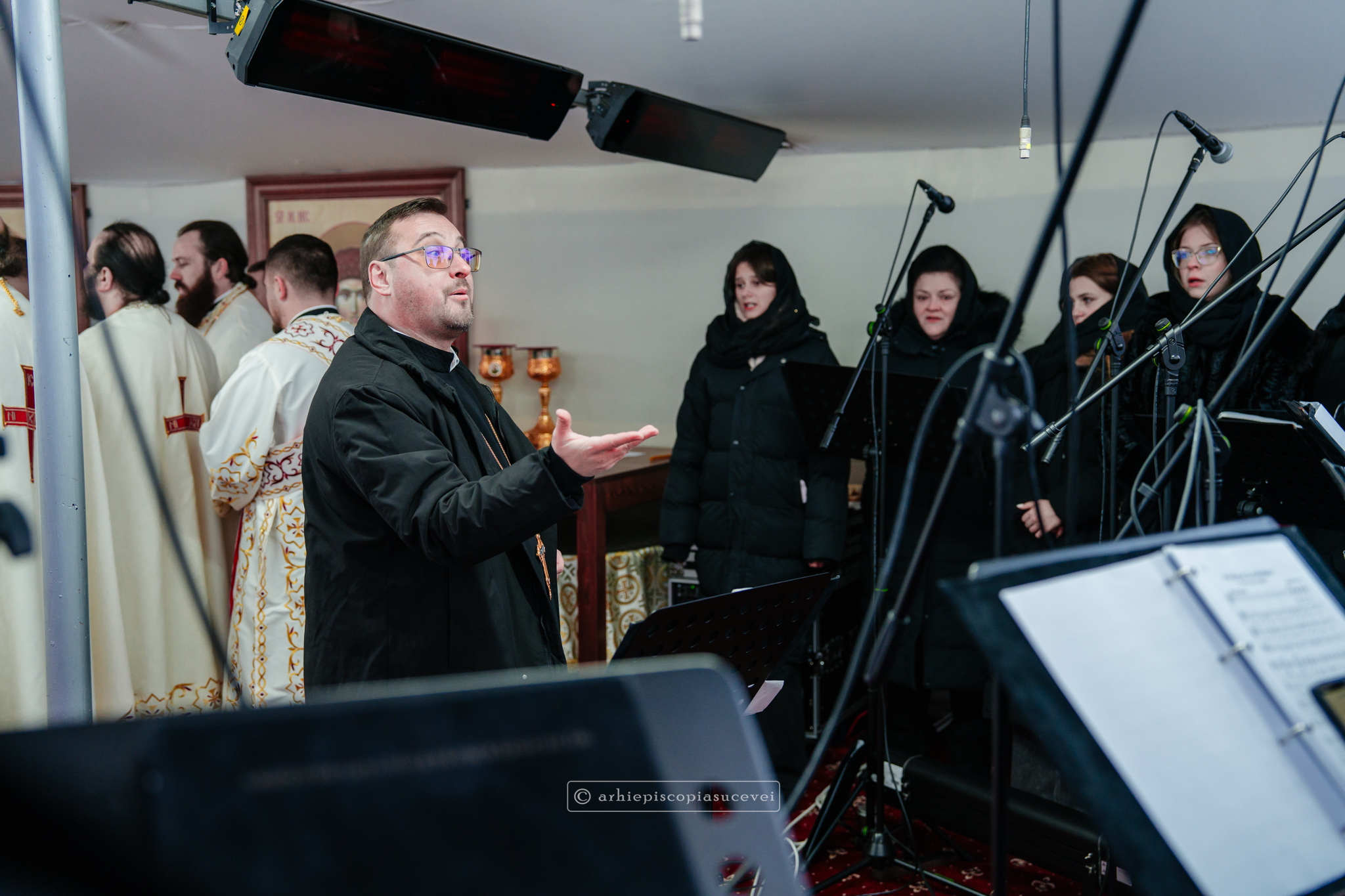 La sărbătoarea Nașterii Mântuitorului Iisus Hristos, 25 decembrie 2025, Sfânta și Dumnezeiasca Liturghie a fost săvârșită de Arhiepiscopul Sucevei și Rădăuților, Înaltpreasfințitul Părinte Calinic, și de Episcopul-Vicar, Preasfințitul Părinte Damaschin Dorneanul, împreună cu un sobor de preoți și diaconi, pe un podium special amenajat în imediata apropiere a clopotniței Bisericii „Sfântul Mare Mucenic Gheorghe, purtătorul de biruință”. Din soborul slujitor au făcut parte clerici ai Centrului Eparhial Suceava, precum și slujitori de la Mănăstirea „Sfântul Ioan cel Nou”, îndrumați duhovnicește de arhim. Serafim Grigoraș.
