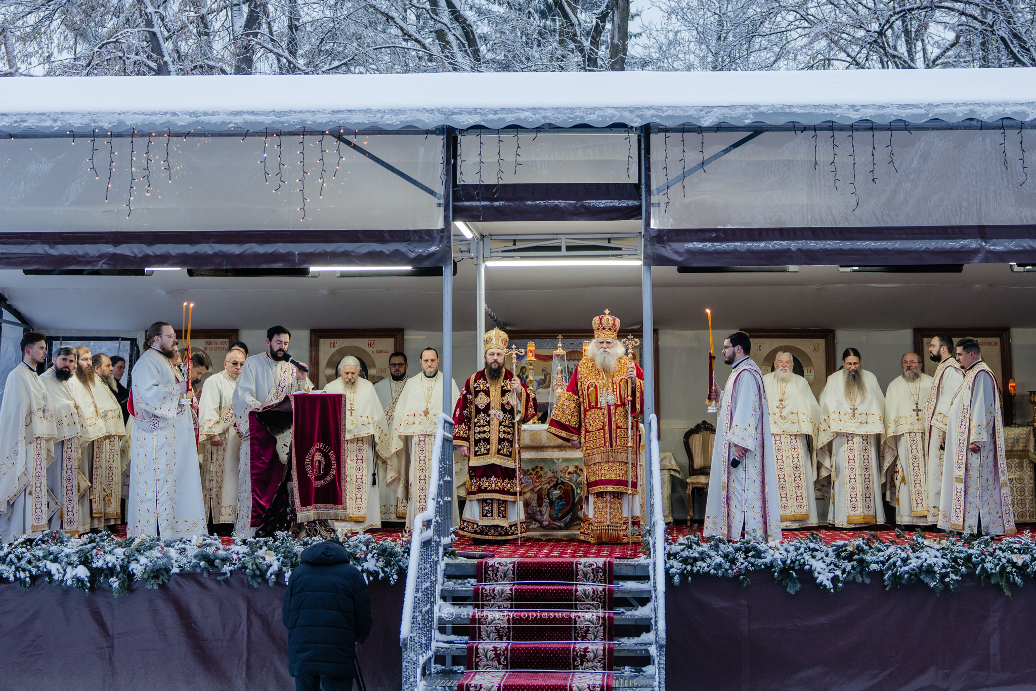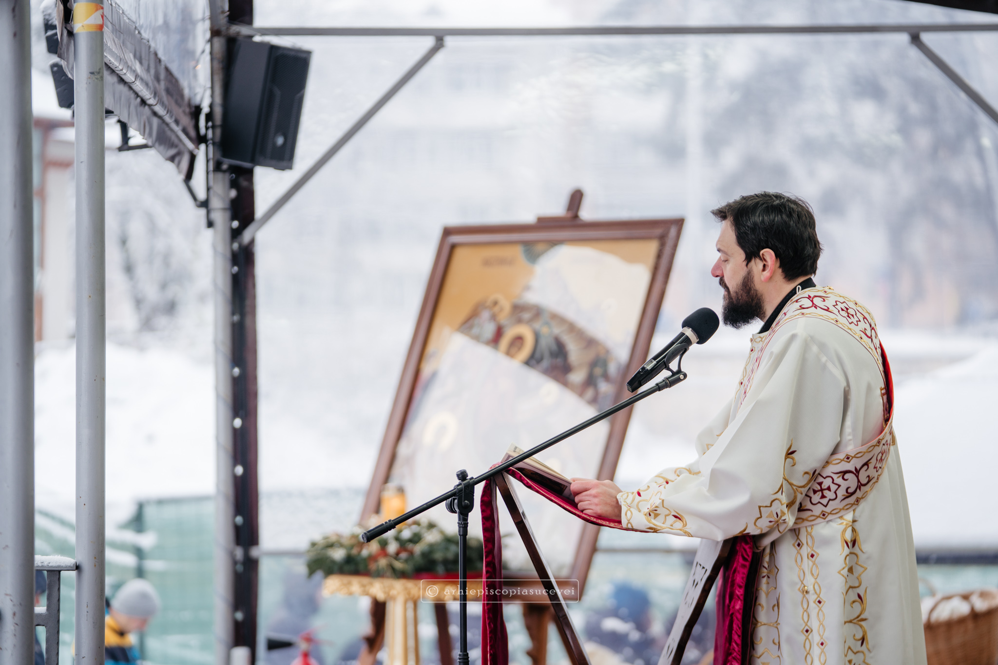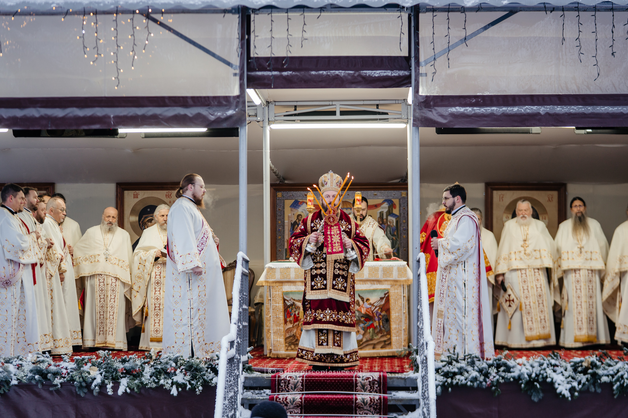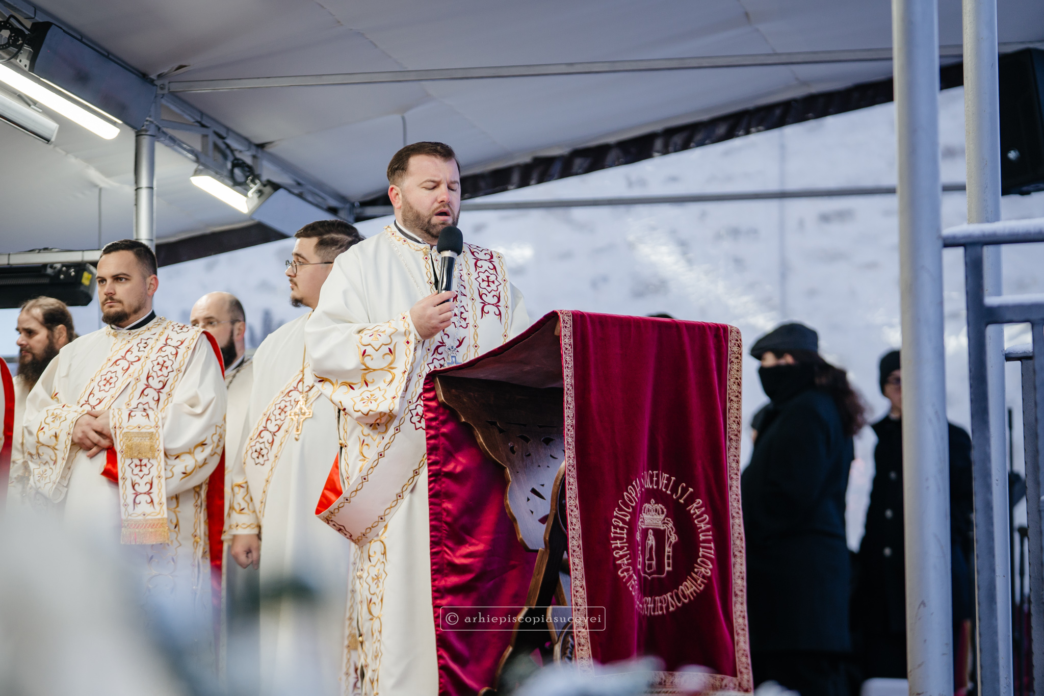 La sărbătoarea Nașterii Mântuitorului Iisus Hristos, 25 decembrie 2025, Sfânta și Dumnezeiasca Liturghie a fost săvârșită de Arhiepiscopul Sucevei și Rădăuților, Înaltpreasfințitul Părinte Calinic, și de Episcopul-Vicar, Preasfințitul Părinte Damaschin Dorneanul, împreună cu un sobor de preoți și diaconi, pe un podium special amenajat în imediata apropiere a clopotniței Bisericii „Sfântul Mare Mucenic Gheorghe, purtătorul de biruință”. Din soborul slujitor au făcut parte clerici ai Centrului Eparhial Suceava, precum și slujitori de la Mănăstirea „Sfântul Ioan cel Nou”, îndrumați duhovnicește de arhim. Serafim Grigoraș.