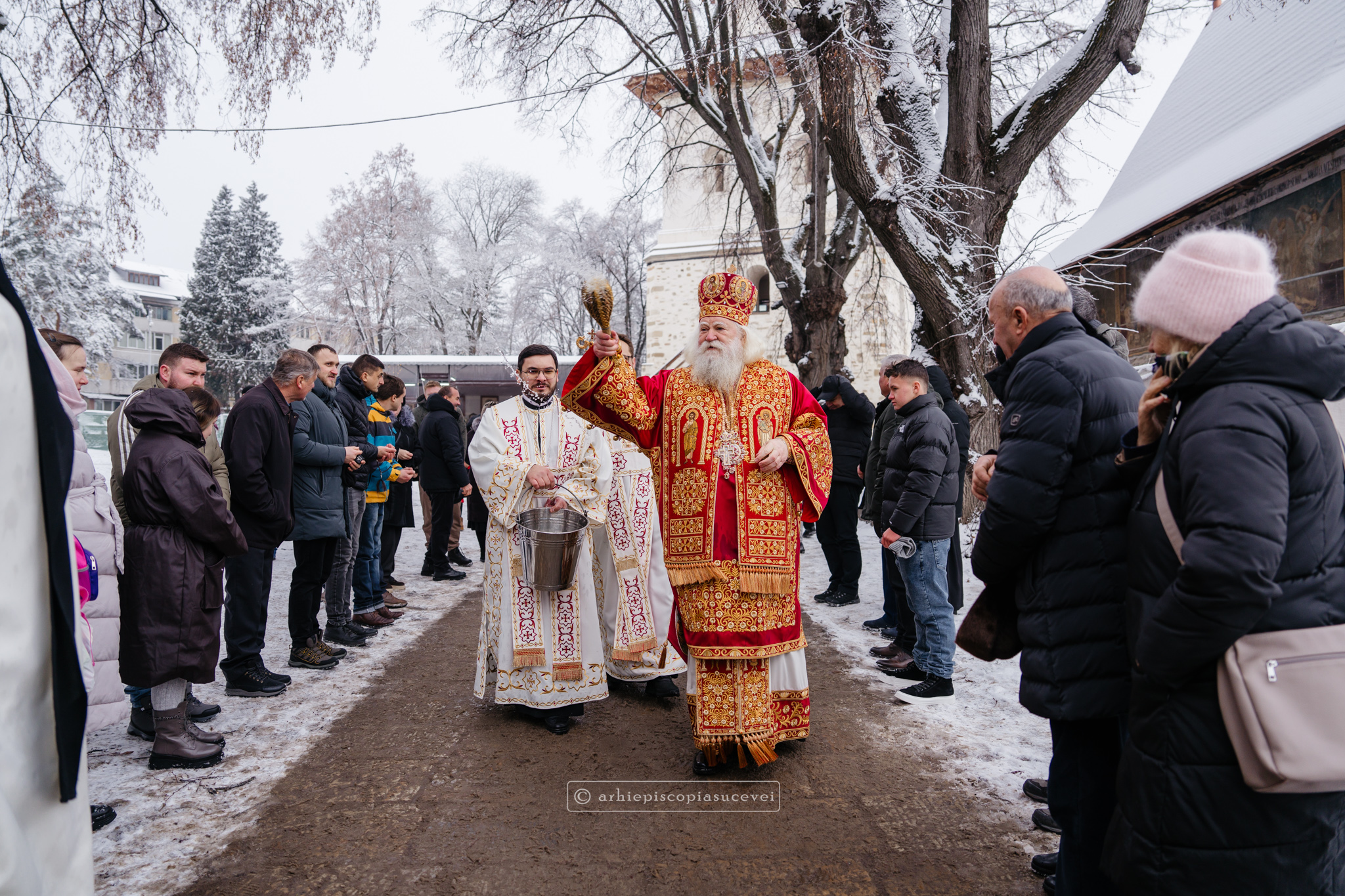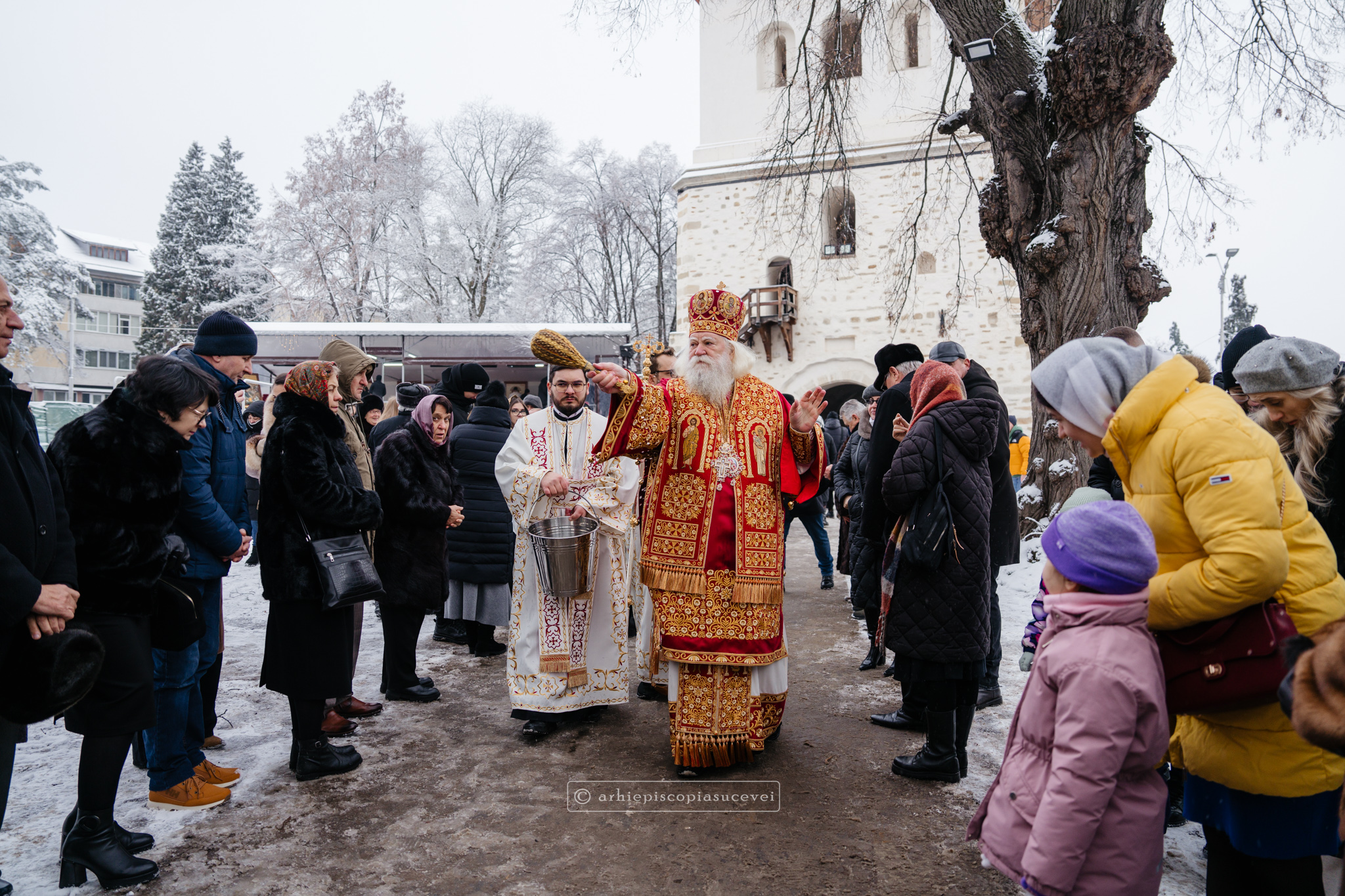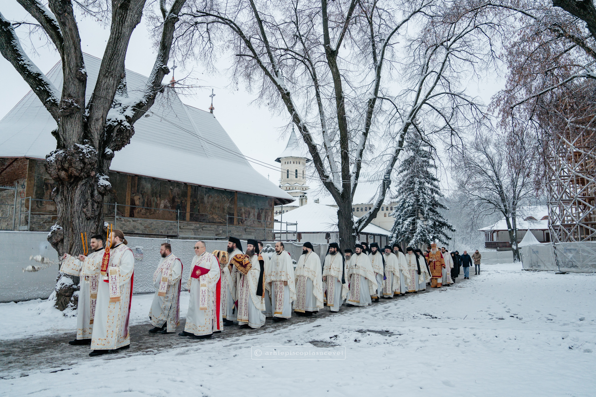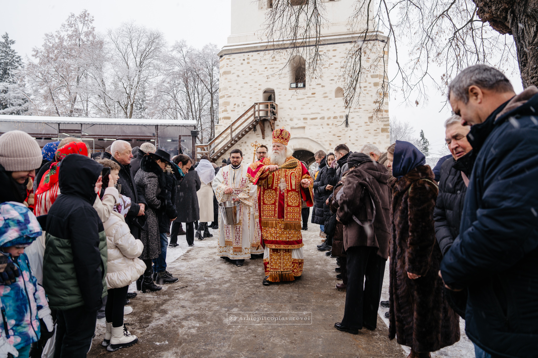 La ceas de sărbătoare pentru întreaga creștinătate, lumina tainică a Praznicului Nașterii Domnului care s-a revărsat în sufletele tuturor celor care cinstesc venirea în lume a Fiului lui Dumnezeu s-a oglindit și pe chipurile credincioșilor prezenți la Mănăstirea Sfântului Ioan cel Nou, Catedrala Arhiepiscopală din Suceava. În pofida temperaturilor scăzute, Ajunul Crăciunului aducând și un strat generos de zăpadă, aceștia au poposit între zidurile ansamblului monastic pentru a se întâlni la vreme de bucurie cu sfântul mult iubit, prin închinarea la cinstitele moaște ale Marelui Mucenic Ioan, și pentru a primi binecuvântarea arhierească.