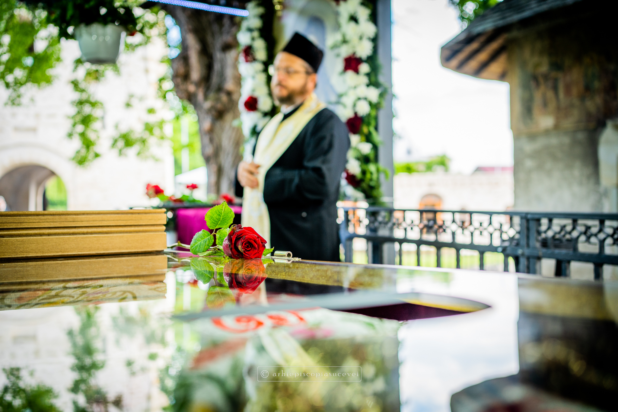 Ceremonia a avut loc în jurul orei 7:00, după oficierea slujbei Acatistului Sfântului, săvârșită de Preasfințitul Părinte Damaschin Dorneanul, Episcop-Vicar al Arhiepiscopiei Sucevei și Rădăuților. În sunet de toacă și în bătaia clopotelor, ierarhul a înălțat rugăciuni, înconjurat de un sobor de preoți și diaconi, alături de pelerinii prezenți.